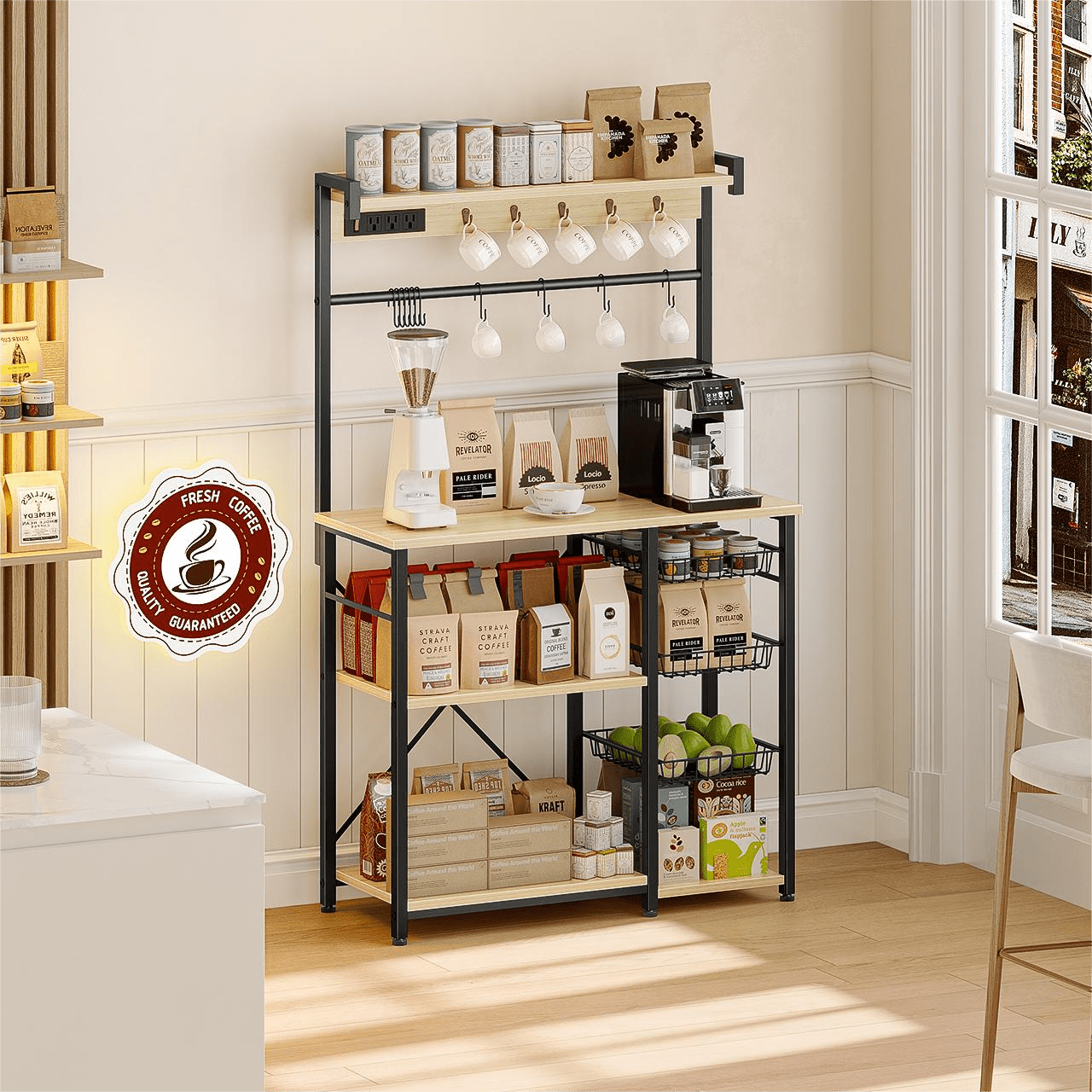 Biemlerfn Kitchen Bakers Rack with Power Outlet Versatile Layout, Versatile Storage You can’t go far wrong with this kitchen bakers rack – a great kitchen storage helper. As well as occupying smaller spaces, it is large enough to be a home for decanters, pots and pans, crockpots, mugs, and more. But think it can only be a kitchen stand? Of course not! Put your books, green plants, and storage basket on it in your study, it will be a greater storage rack. Lack a coffee station in your living room? This coffee bar cart is here for you.