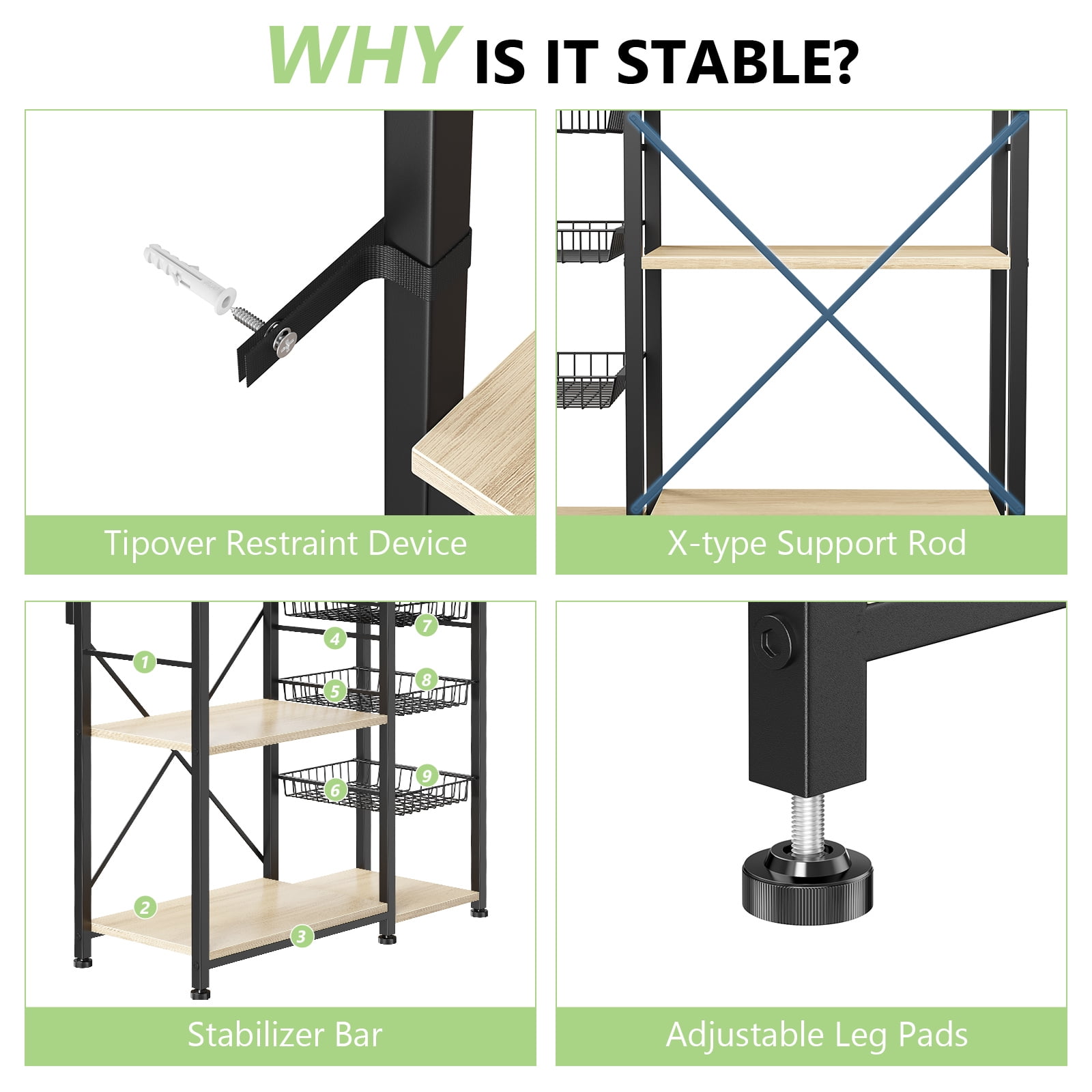 【Space Maximization】-The size of large bakers rack is 39.8×15.2×62.6 inch. The 39.8 inch width can enough store your microwave+coffee machine+juicer and 5-tier coffee stand design to store toaster, fryer, sauce bottles and any other household items. There is also 3 pull-out wire baskets for storing fruits, coffee pods, and other items, ensuring everything is well organized. 【Effortless Electrical Access】-Our bakers racks for kitchens with storage not only come with 3 AC outlets and 5.9 feet of cord to power multiple appliances at once, but also come with a safety switch to ensure electrical safety. The outlets are designed at a reasonable height, so you don’t have to bend down to plug/unplug. And keep out of reach of children and pets. It is very safe and accessible to use. 【Versatile Hanging Options】-Equipped with 5 fixed and 10 S-shaped hooks, our kitchen storage shelf provides versatile hanging solutions. Hang cups, kitchen scissors, spatulas, spoons, and even pans at convenient heights, ensuring everything is within arm’s reach for easy access during meal preparation. 【Durable and Sturdy】-Made from 12mm thick P2 particle board, our kitchen bakers rack combines a sturdy metal frame, X-shaped crossbars, adjustable feet, and an anti-tipping devices, providing reliable stability. The durable particle board can can hold up to 120 pounds. 【Quick and Hassle-Free Assembly】-With a simple design and clear installation instructions, our microwave stand with storage can be easily assembled in about 15 minutes. Each accessory is labeled for easy identification. It is very suitable as a kitchen bakers rack, coffee bar, or living room storage shelf.