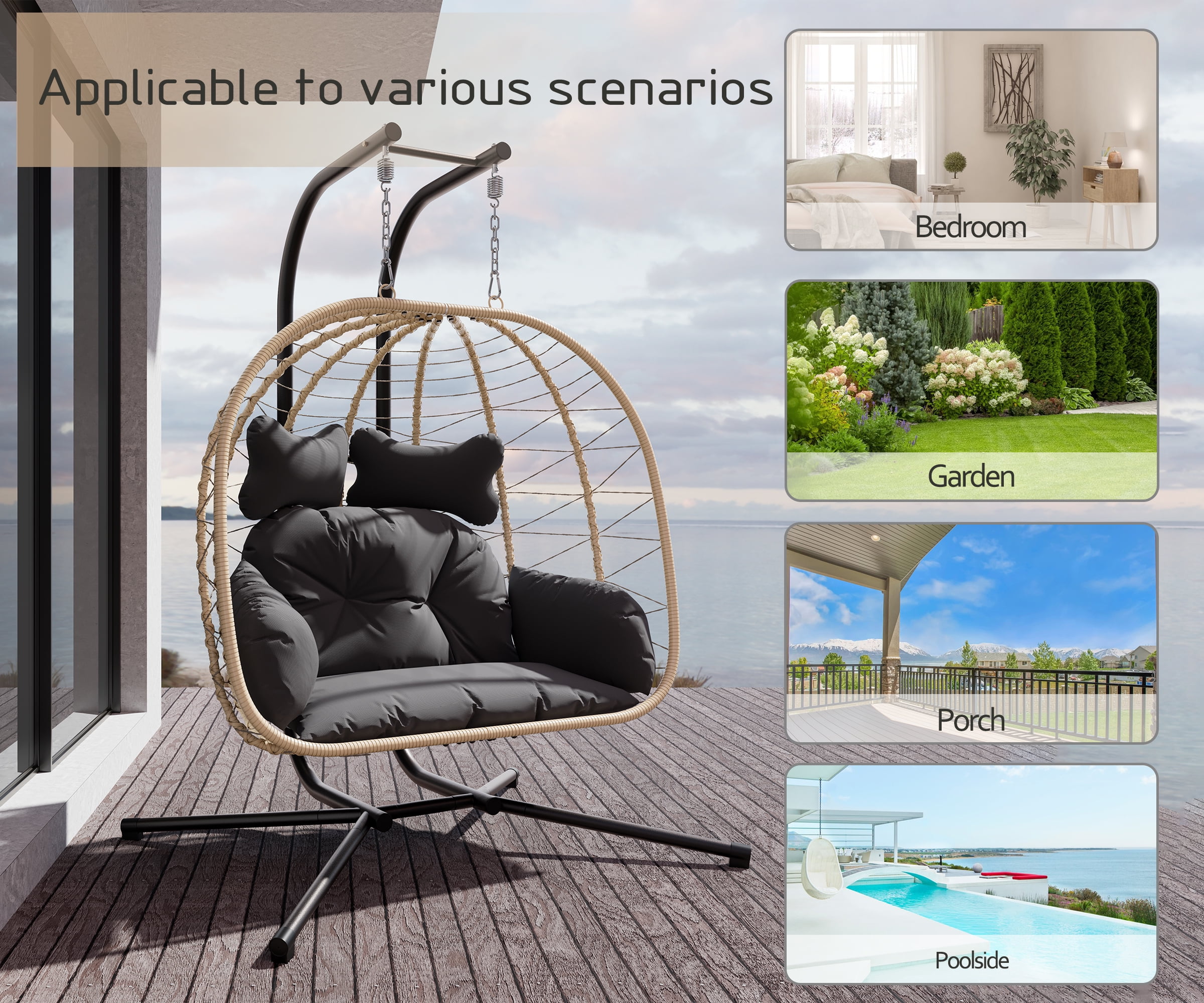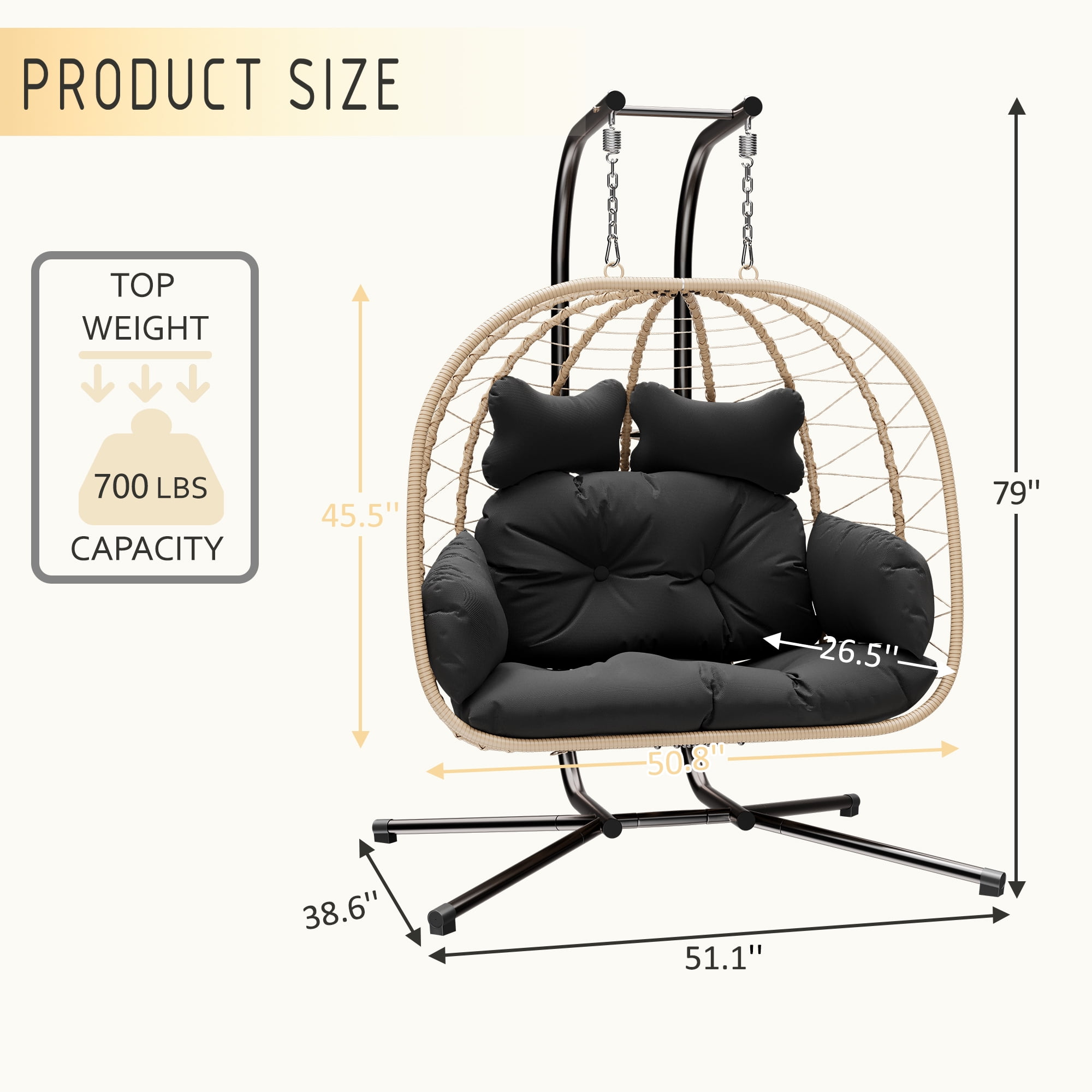 Bifanuo Double Wicker Swing Egg Chair Hammock Foldable Hanging Loveseat with Stand, UV Resistant Removable Cushions, 700LBS Capacity for Bedroom, Balcony (Yellow and Black)