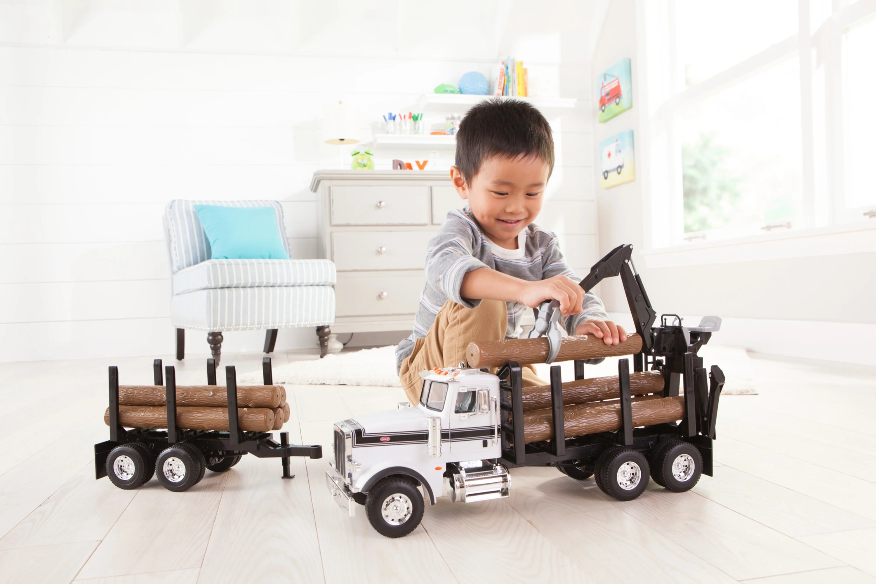Peterbilt model 367 cab features lights and sounds, opening doors and adjustable mirrors Grapple hook and movable crane put kids in the operator’s seat Includes rear trailer and 10 logs to inspire even more imaginative play time Age Grade 3 yrs+