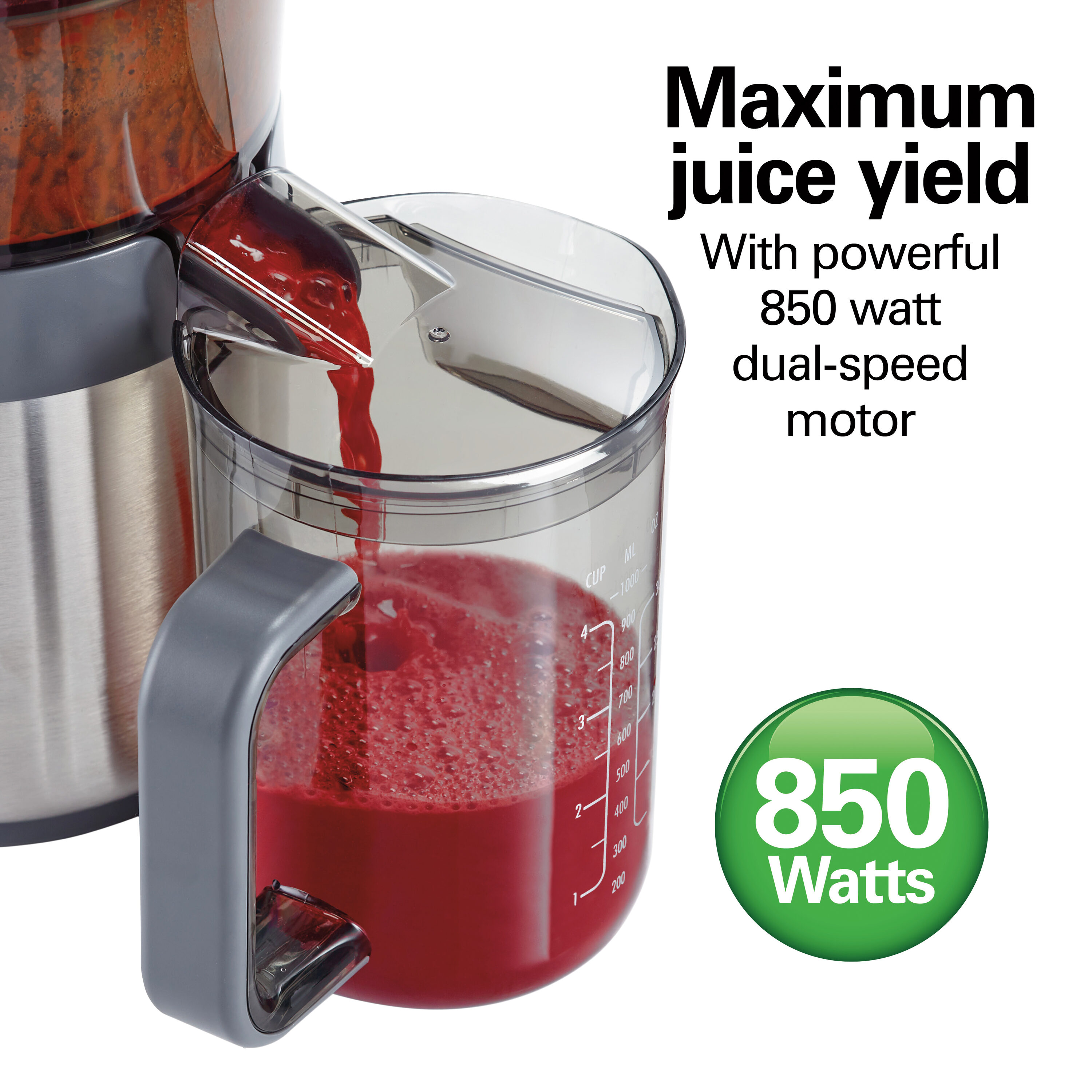 Enjoying fresh, healthy juice has never been easier. With its extra-large 3 inch chute, 850 watt motor and dual speeds, the Hamilton Beach Big Mouth® Easy Clean Juice Extractor quickly transforms whole fruits and vegetables into smooth, nutritious juice in seconds. The powerful dual-speed motor ensures maximum juice yield from hard and soft produce without clogging. High speed is great for apples, carrots and beets, and the low speed works well for leafy greens, grapes and tomatoes. The 3 inch Big Mouth® chute lets you easily add whole foods to save time and effort in the kitchen. Fit whole apples, peeled oranges, or handfuls of kale. The juicer’s drip-free spout flips up to prevent drips in between batches for less mess. The large 40 oz. BPA-free pitcher with lid and froth separator keeps juice neatly contained and strains off the foaming froth when pouring juice. The juicer is easy to clean with a patented Easy Sweep™ Cleaning Tool that sweeps away pulp to cut strainer cleaning time in half. The pulp bin, juice bowl, lid and pusher are all dishwasher safe. The juice extractor is backed by Hamilton Beach, America’s #1 juice extractor brand,* with a 3 year limited warranty