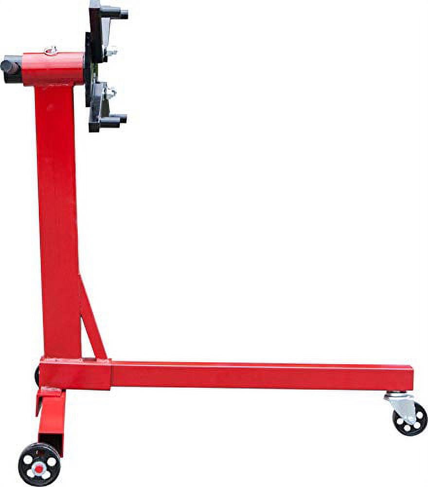 Rotating engine stand is constructed with heavy-duty steel, providing long term durability with an industrial luster Engine stand features a 3/8 ton (750 lb) load capacity and is equipped with (2) fixed casters and (1) 360-degree swivel caster for smooth maneuverability Mounting head features (4) adjustable arms and 360-degree rotation, allowing for easy access to any part of the engine Securely holds most foreign and domestic engine blocks; An extra-wide base provides maximum stability