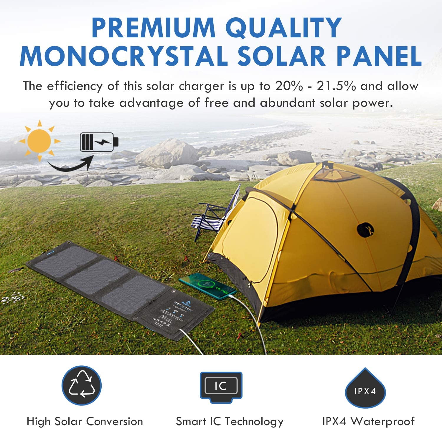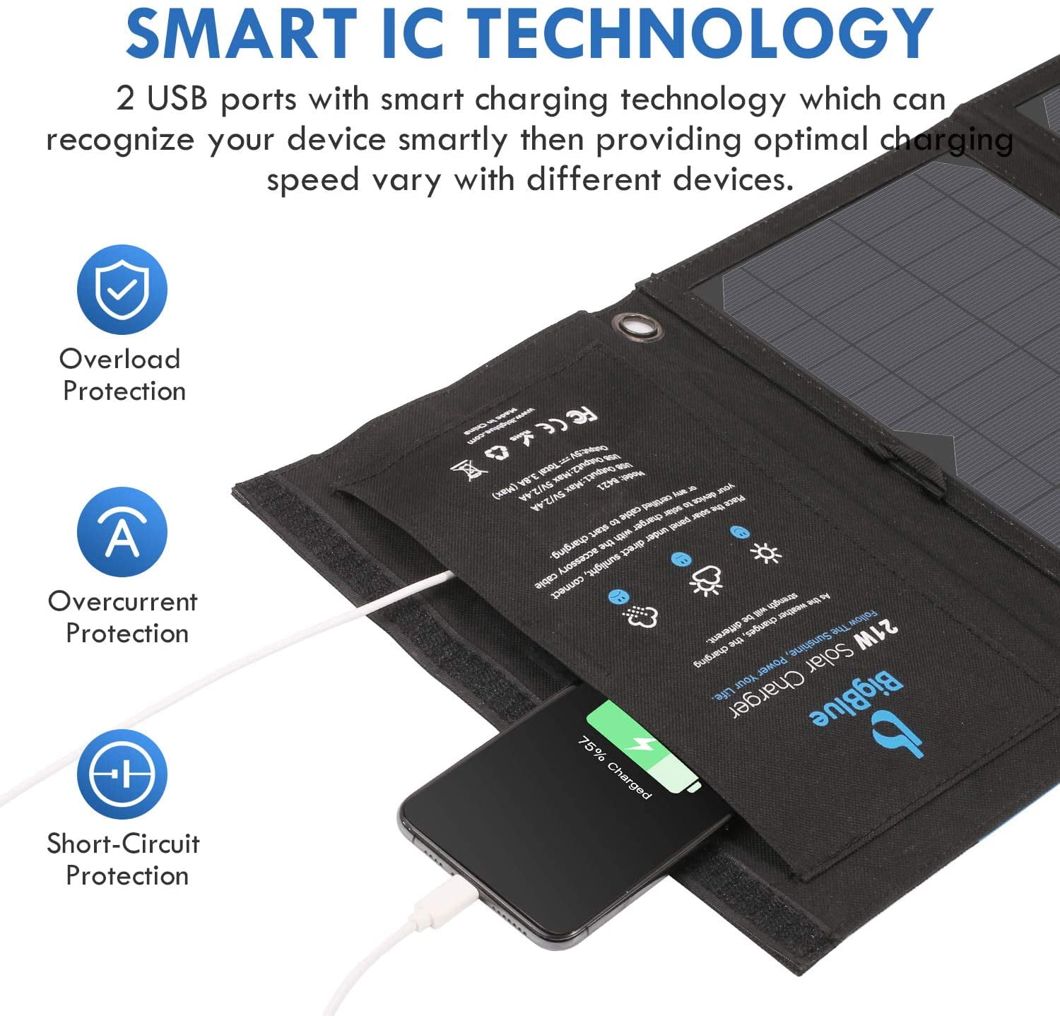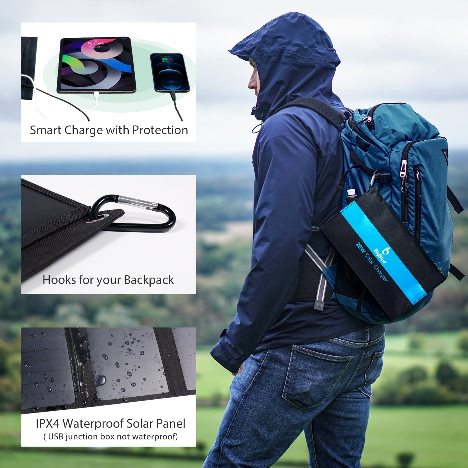 ⚡High Solar Conversion Highly efficient SunPower solar panels convert up to 24% of solar power into free energy in enough sunlight, which is the most durable panels at present, standing up to elements and wear and tear better than conventional panels. This special PET polymer surface protects solar panels from occasional rain or wet fog and three ports are covered with rubber covers to protect them from dust or water damage. ⚡Upgraded Triple USB-A Ports Each maximum output is 5V/2.4A and the total maximum current is at 5V/4.8A. BigBlue 28w solar charger allows you to charge multiple devices at once. It comes with smart charge technology which can recognize your device smartly then provide optimal charging speed vary with different devices. BigBlue ensures 100% safe charging with overcharging, overheating and short circuit protection. ⚡Portable Camping Folding Solar Panel BigBlue USB solar charger is a great option if you’re taking an extended camping trip or if you’re traveling somewhere with an unreliable power grid. ⚡Wide Compatibility Attached a USB cable for almost all 5V Android devices & some DSLRs, or Apple devices (Note: needs extra original cable for Apple devices). Our solar cell phone charger can’t store the electricity, please unfold all solar panel in outdoor direct sunlight, then connect your device to USB output port. Note: our portable solar charger can’t charge the laptops and iPad Pro. ⚡Package and Support You will get BigBlue 28W Solar Phone Charger, 50cm USB Cable, User Manual and friendly Customer Service.