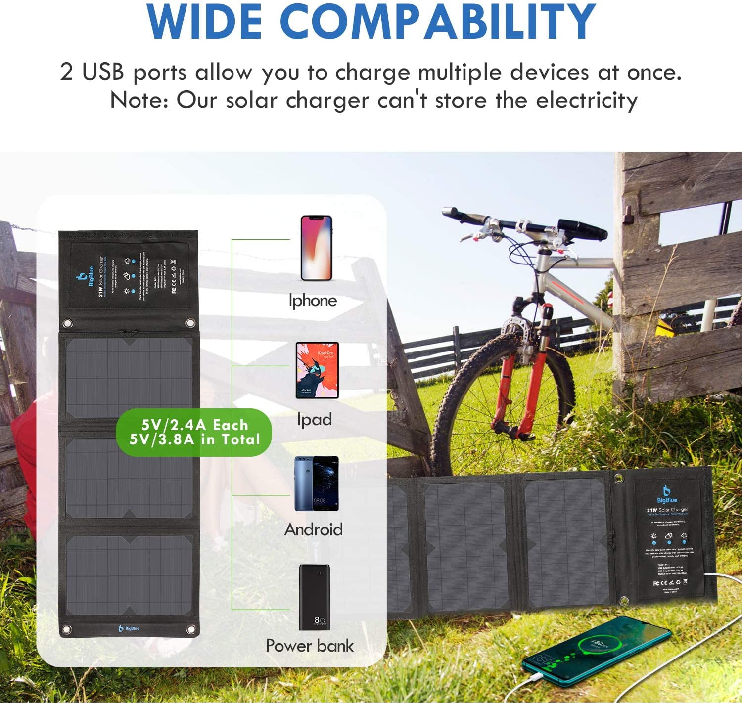 BigBlue 28W Solar Panel Charger With 3 USB Ports Compatible Device: • IPhone 13 / 12/ 11/ XS / XS Max / XR / X / 8 Plus / 8 / 7 Plus / 7 / 6S / 6 iPad mini 2 / 3 / 4 • Samsung Galaxy S22/ S21/ S20/ S10 / S10+ / S10e / S9 / S9+ / S8 / S8+ / Note 9 / Note 8 / Note 7 • Pixel 3/ 3a/ 2/ 1/XL, Nexus 6P/5X/9,LG G6/G5/G4/G3/V20, HTC 10, HTC One A9/M9’Google Pixel / Pixel 3XL, Nexus 5X / 6P, Sony XZ2 Premium, Sony XZ3,Tablets, Driving recorder, Navigator, Camera • Huawei P10 / Mate 9 / Mate 20X / Mate 20 Pro, USB LED flashlight, Tablets How to Use It? 1. Unfold four solar panels in the direct sunlight and no shadow or cover( The best angle is 45° toward the sun) 2. Then connect your phone or other 5V electronic devices to the USB output port. 3. The red LED light will go on when the solar panels works normally; It will flash when there are overcurrent or short circuit. Specification: • Conversion Efficiency: ≥23.5% • Solar Cell: SunPower • USB Output Voltage: 5V •Total Max Output Current: 4.8A •Folded Size: 11.1*6.3*1.3in (28.2*16*3.4cm) •Unfolded Size: 33.1*11.1*0.2 in (84*28.2*0.5cm) •Net Weight: 610g Package: • 28w Solar Panel Charger*1 • Buckles* 4 • USB cable*1 • User Manual*1 FAQ Q: Can they be chained with each other? A: They can be chained with each other using the buckles that comes with. But it is not possible to improve the power of the charge by using two solar chargers together. Each one has its own inner structure that can’t be connected with another one. Q: Is this rugged enough to be kept folded in a typical backpack with other gear pushing against it without damage? A: Of course it is very rugged, but please be careful to not over bend or scratch the panels. Q: Would it be Safe to charge 3 mobile battery packs/mobile batteries at once with this? A: Might take a while but it has 3 usb connections. Q: Do all four panels have to get sun for one usb port to charge? A: All the solar panels need to be exposed under direct sunlight, otherwise, the solar panels that are not exposed to the sun will become resistors, making it impossible to charge. Q: Do the panels have auto-restart while in the sun? A: Of course. It starts charging again the moment it produces enough output for the attached device to charge.