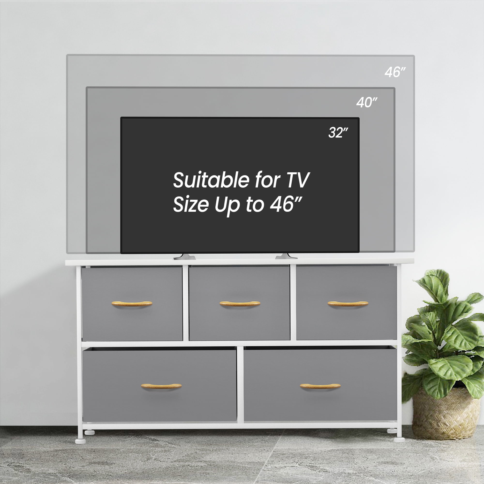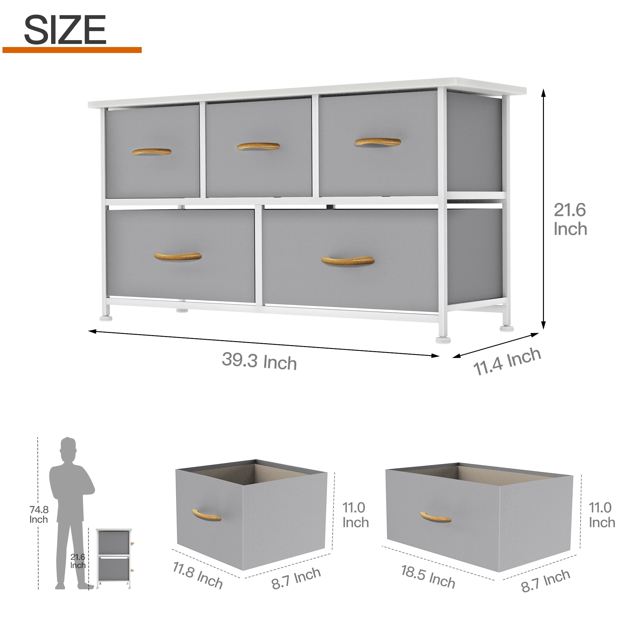 FEATURES: The wooden top provides a hard surface for displaying lamps, alarm clocks, books, eyeglasses, charging stations, and more. The entire unit is portable, lightweight, and easy to relocate to different spaces. 5 DRAWERS IN 2 SIZES: Removable and foldable drawers could store clothes, toys, and other household items. Different sizes meet different needs. Easy to open and close. EASY TO ASSEMBLY: The package comes with all the tools and accessories. Our detailed instructions will show you how to install it. This dresser only takes a few minutes to assemble. Powerful metal frame. Durable MDF wooden top. 5 removable and foldable drawers with wooden handles. 4 adjustable plastic legs that prevent scratches to your floor. A great addition to any bedroom, closet, hallway, and more for instant storage. Specifications Dimension: 39.3 ” W x 11.4″ D x 21.6″ H Material: Metal Frame + MDF board & non-woven Materials Fabric Drawer + wooden handle Product Care: Wipe clean with a wet cloth and let it dry.