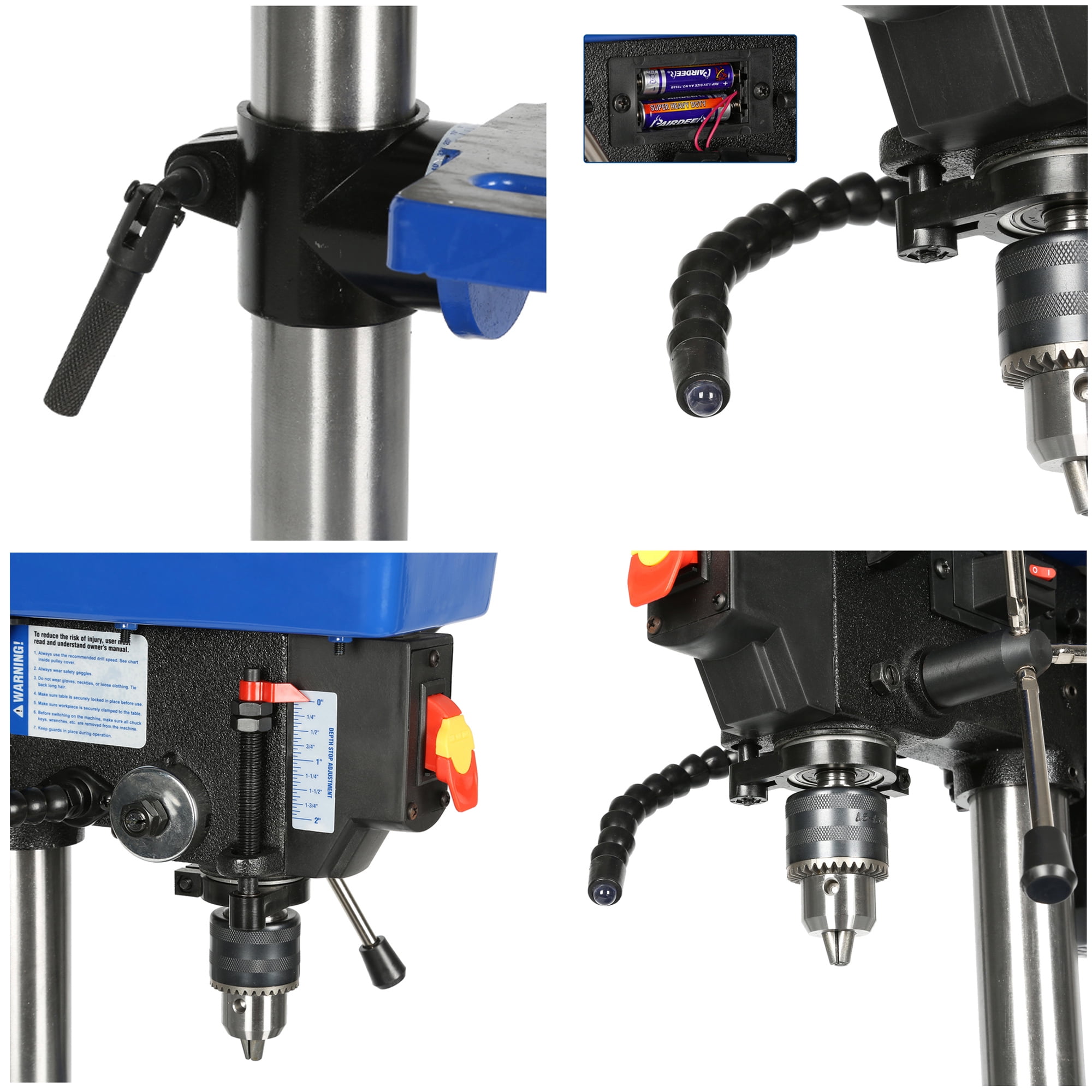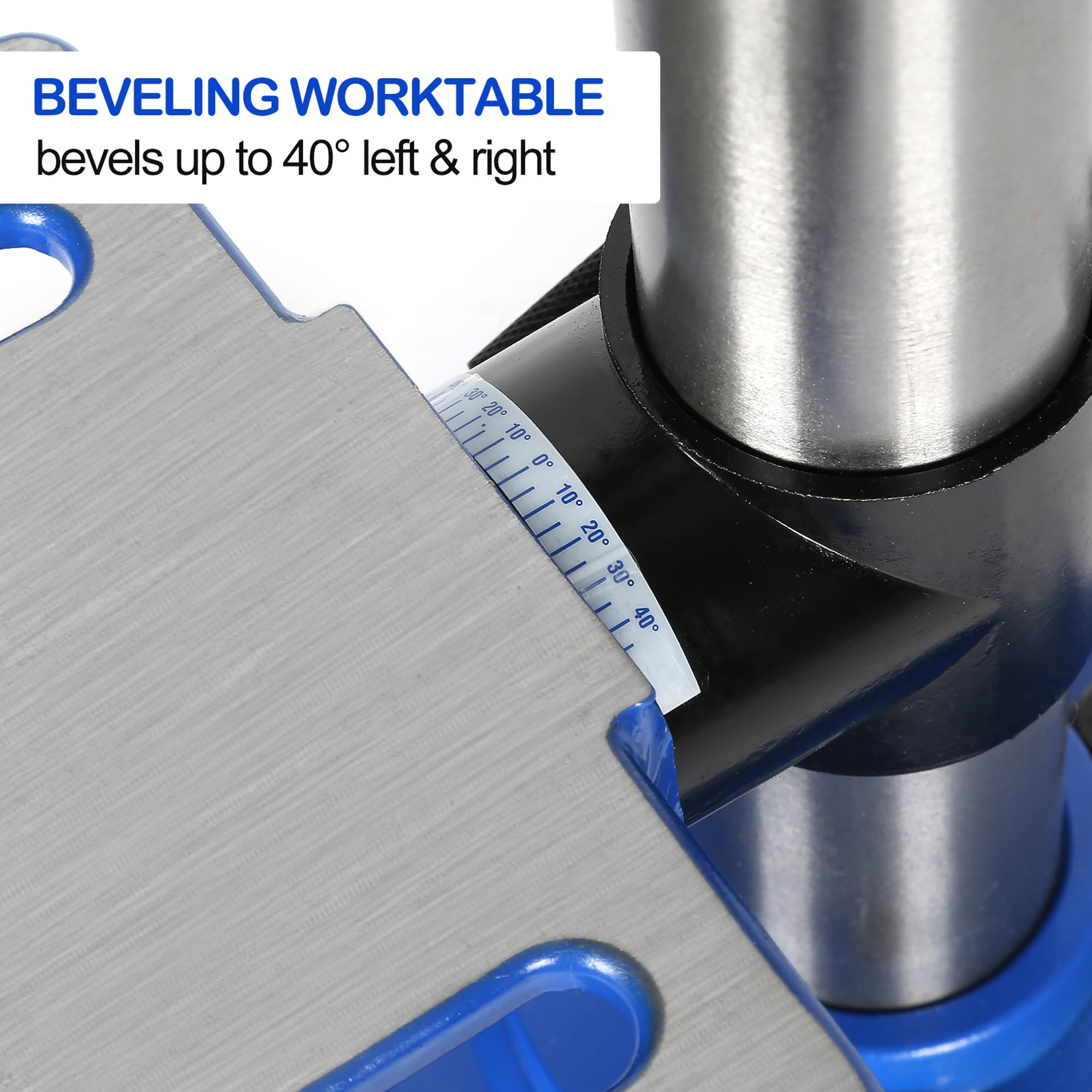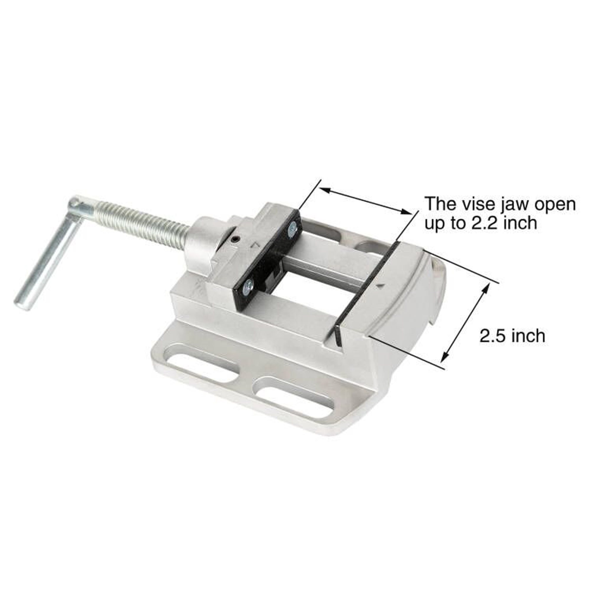 Compact Construction: The frame of the bench top drill press consists of cast iron to ensure durability and accurate drilling. The worktable can bevel 45 degree left and right for angled drilling. The base contains predrilled holes for mounting onto a bench or work stand. The slotted table allows for mounting clamps and vises for effective work-holding. Useful Accessories: 2-1/2-inch jaws open up to 2-1/10 inches, 13 pcs drill bit set range from 1/16 to 1/4 inch, universal and necessary for various applications including but not limited to wood, plastics, and metals. 0.8-inch swing, 2-inch spindle travel