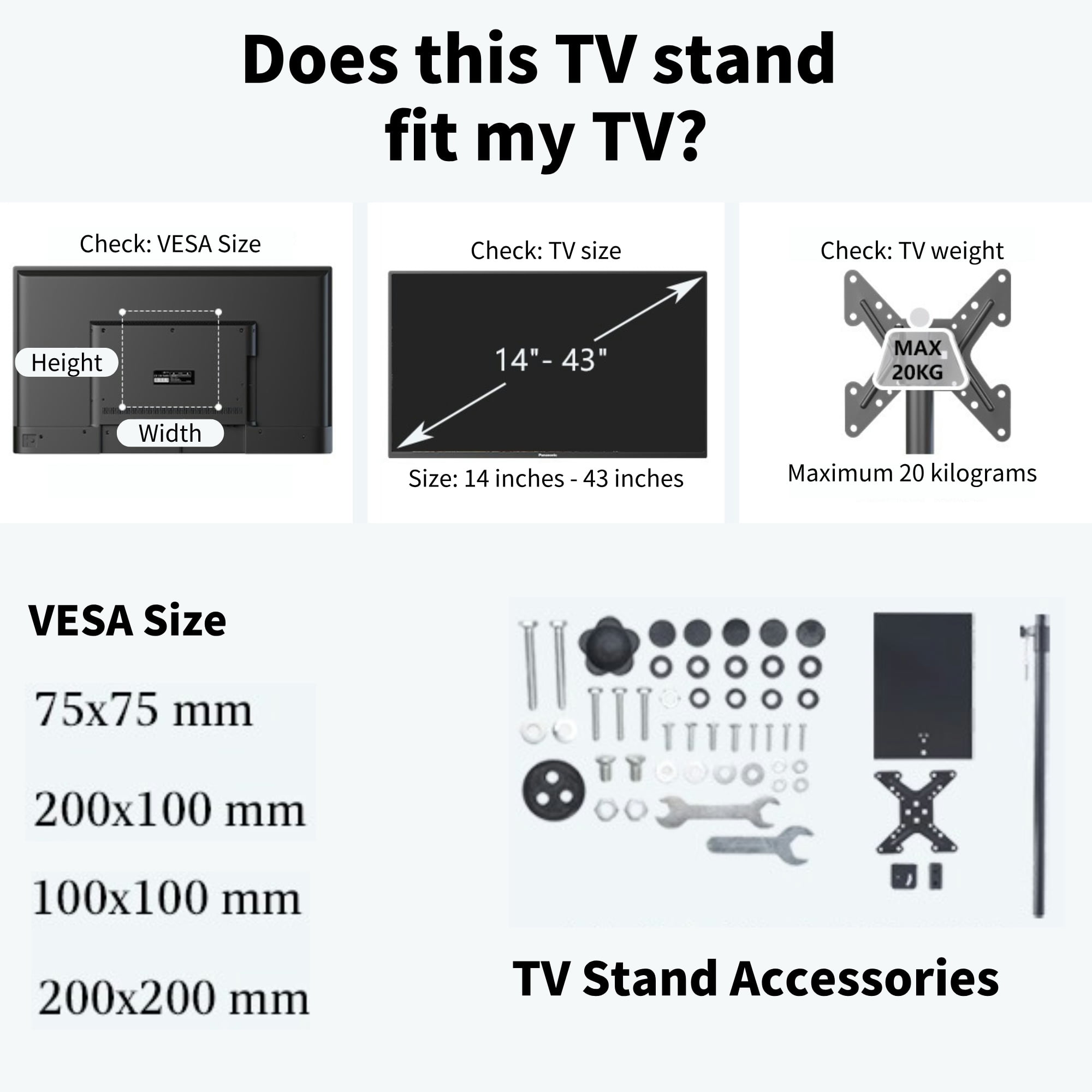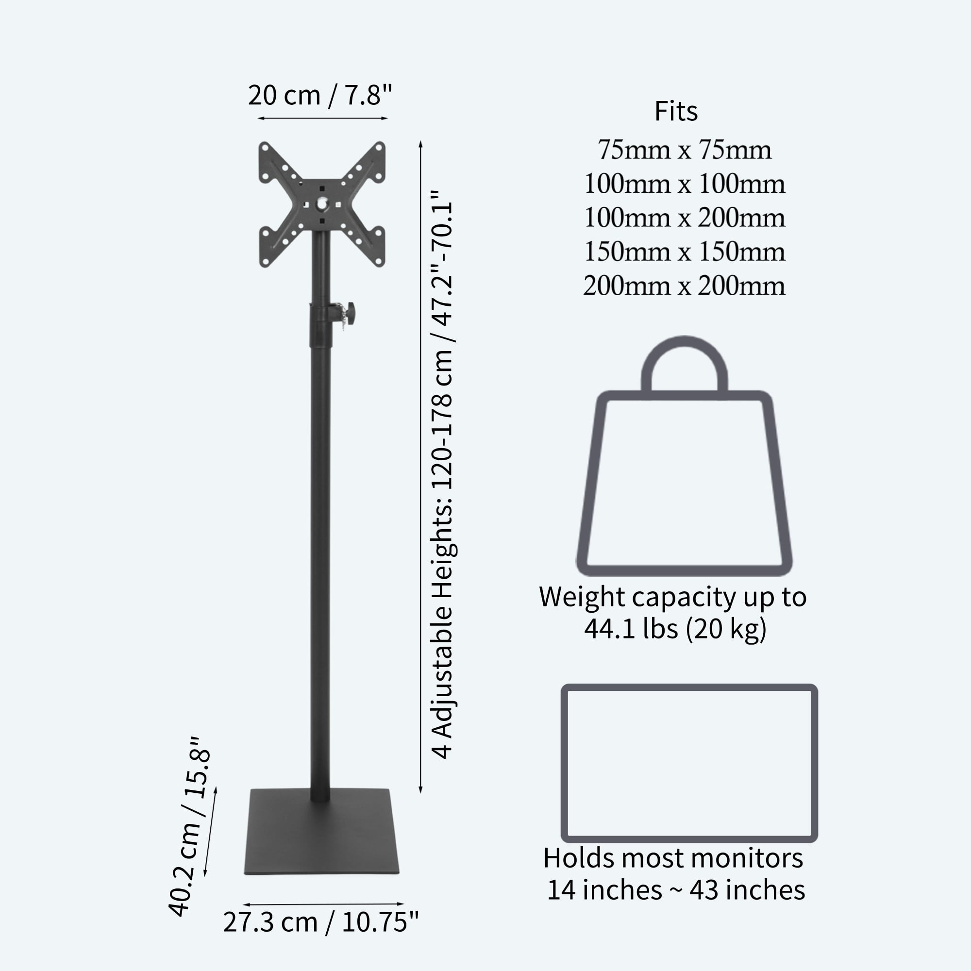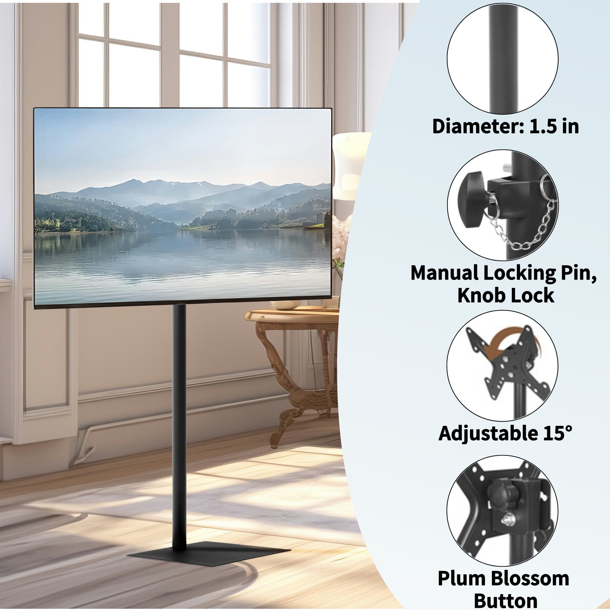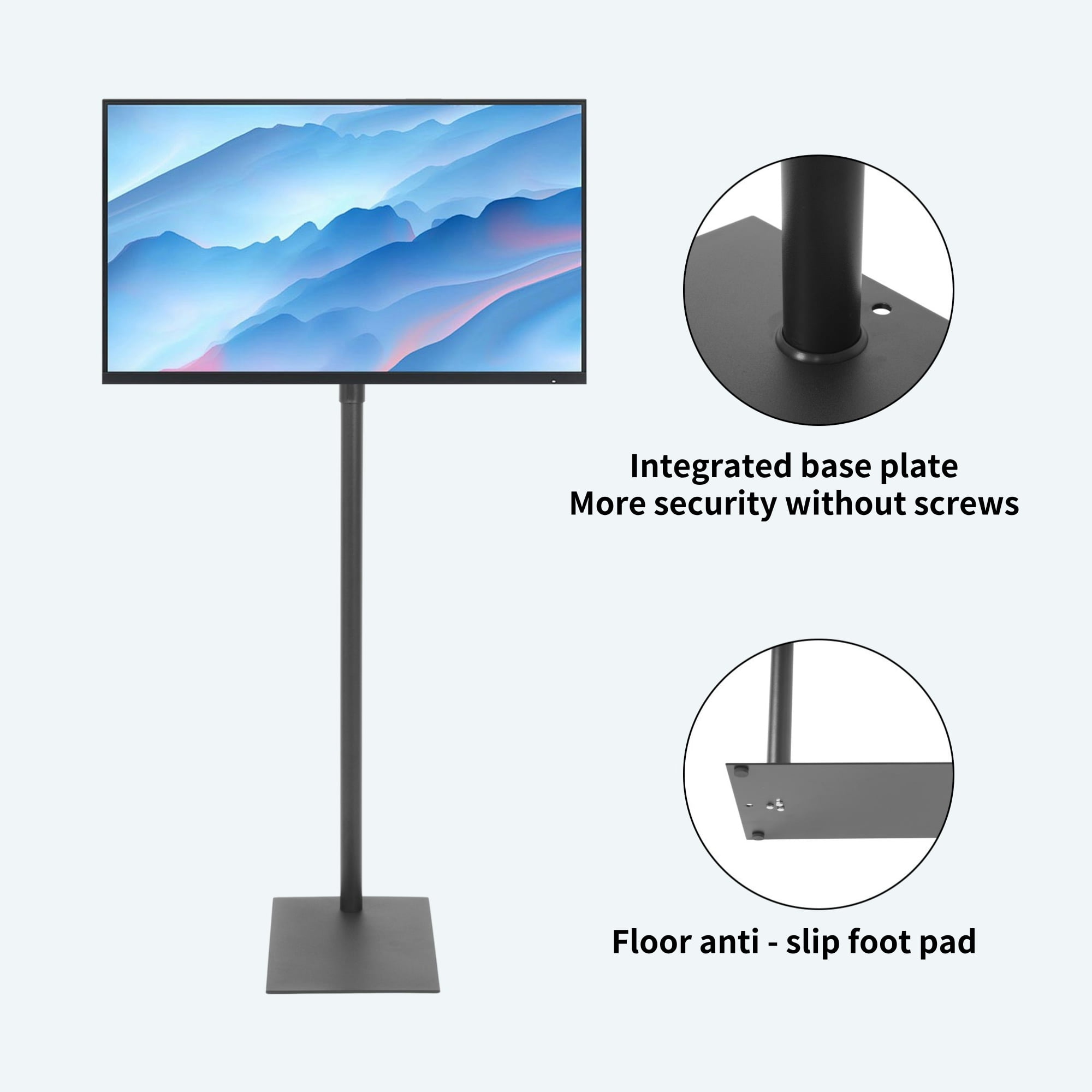 bimiti TV floor stand is crafted from high-quality cold-rolled steel, boasting exceptional thickness and durability. This universal floor-standing TV mount is compatible with a wide range of smart TVs, including LCD, LED, OLED, QLED, and other models available in the market. With adjustable tilt and height features, it ensures ease and comfort in your viewing experience. The stand accommodates TVs ranging from 14 to 43 inches and supports various VESA hole sizes. With a sleek 360-degree swivel design and 5 height adjustment levels, you can effortlessly find the optimal viewing angle. The stand is equipped with a secure lock and anti-slip foot design to guarantee stability and safety. The robust steel base covers a large area, providing reliable support for the TV, and installation is straightforward. Whether it’s a conference room, living room, bedroom, or entertainment room, our TV stand is the ideal choice. Installation steps: Step 1: Install base anti-skid pads Step 2: Install the column, a washer should be placed in the middle of the column Step 3: The U-Shaped connection box is connected with the hanging plate Step 4: Gaskets should be placed on both sides Step 5: Connect the TV with the hanging plate Step 6: Put the hanging plate and the standing pillar together, hold together with manual latch. tip: The black plastic pad is a heightening pad, which is only needed when the screws for installing the TV are to long. Specification: Type: TV Stand Color: Black Material: Cold Rolled Steel Weight Load-bearing: 44 lbs Base Size: 15.8″L x 10.7″W Tilt Adjustment: +15°/ -15° Height Adjustable: 43.3″ to 67″ Recommended Screen Size: 14″ to 43″ VESA Mounting Holes: 3″ x 3″ to 7.8″ x 7.8″ Package Includes: 1 x TV Floor Stand