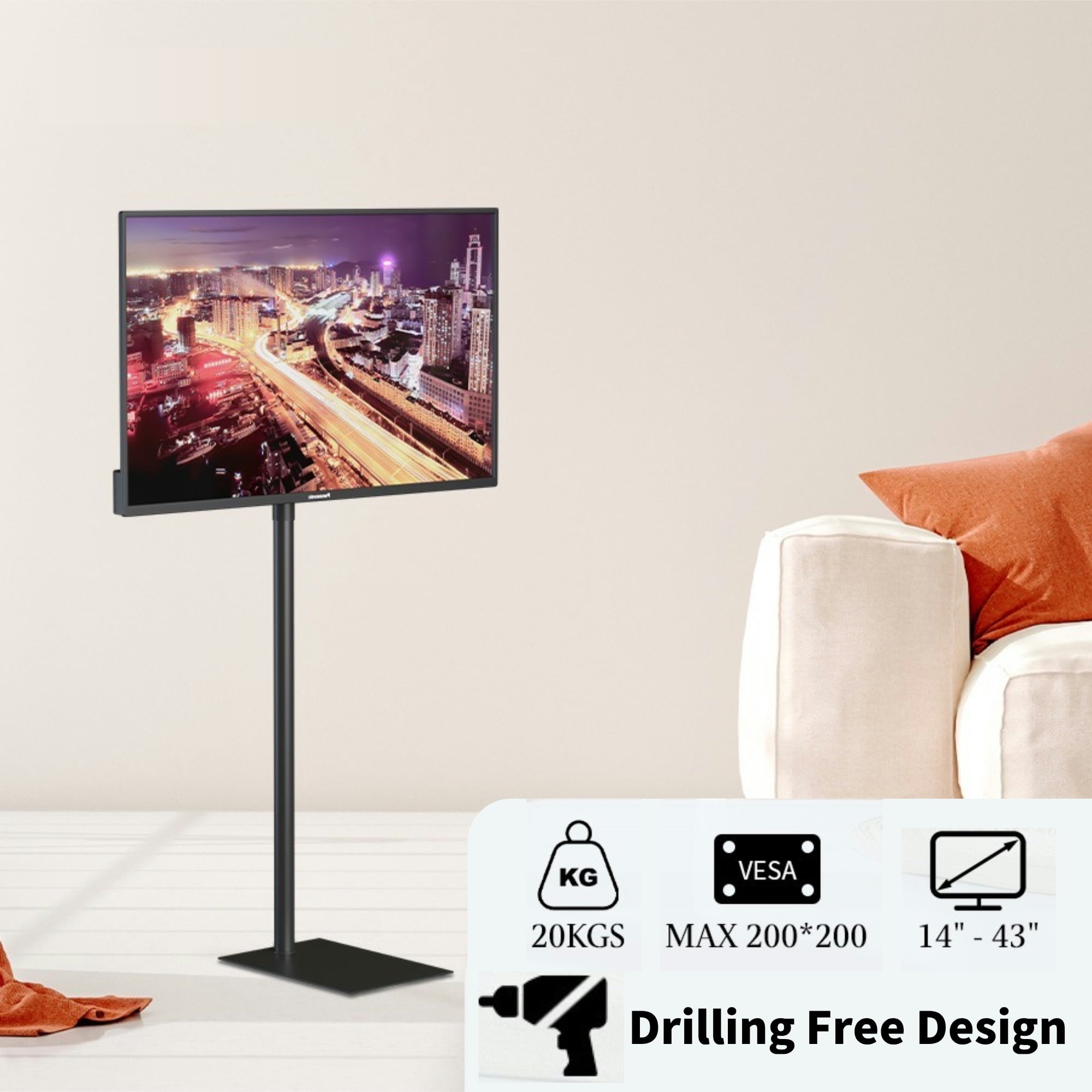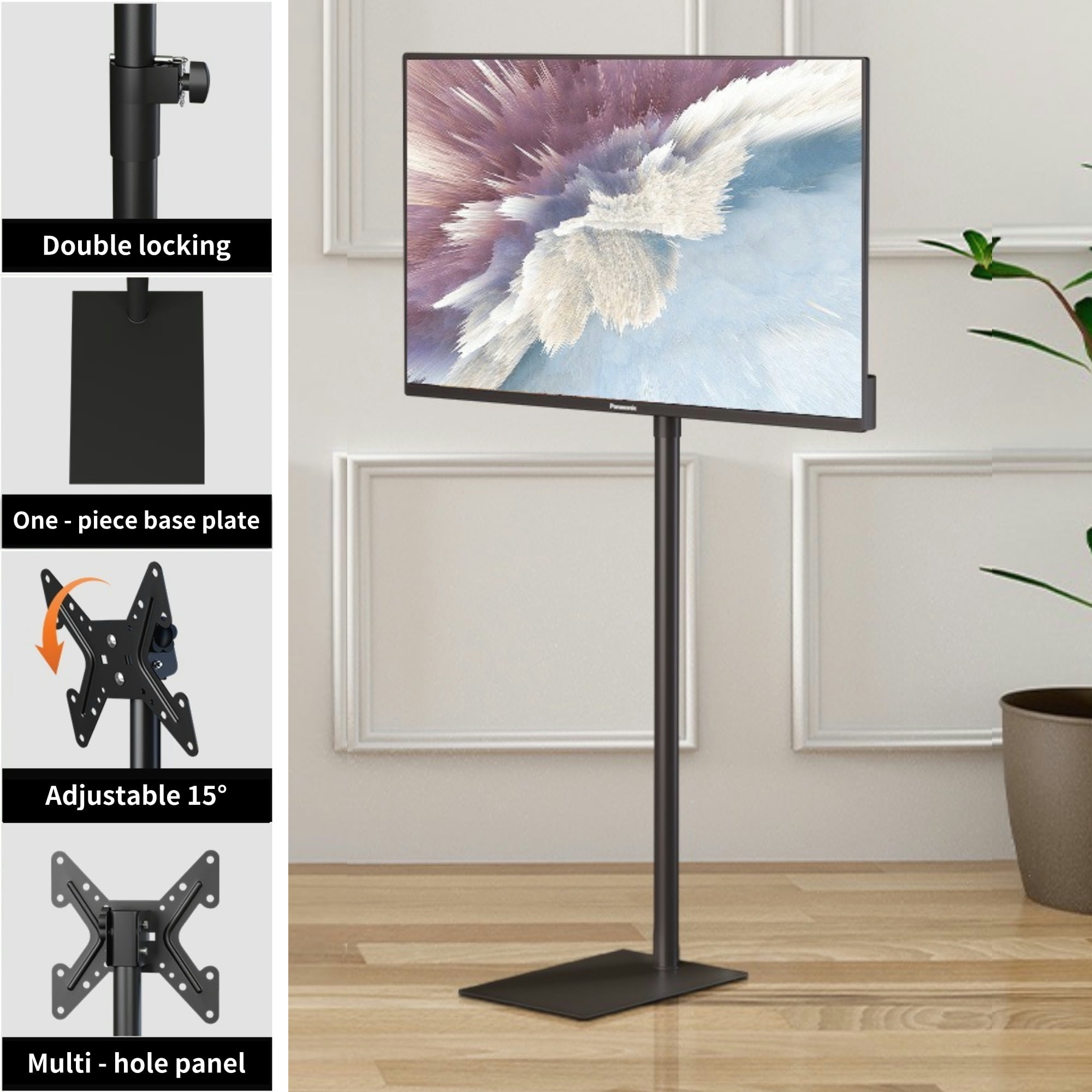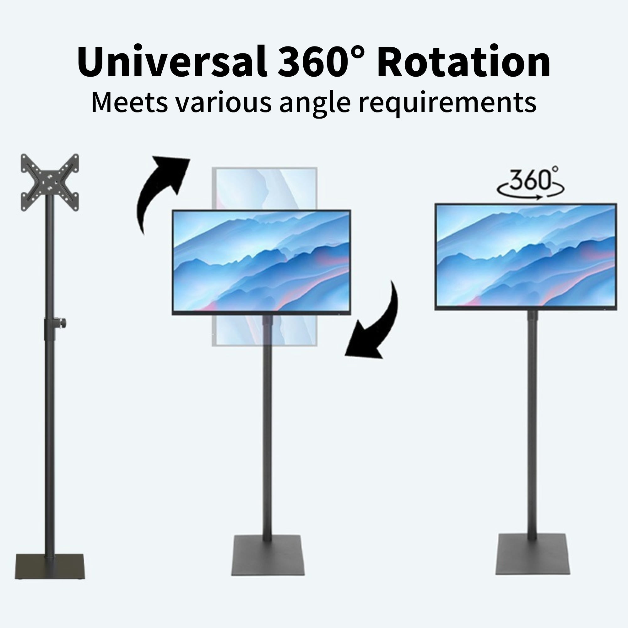 【Universal Design】bimiti universal TV floor stand is suitable for most 14 to 43 inch LCD LED flat panel TVs, and the VESA hole is 3×3 inch, 4×4 inch, 4×7.8 inch or 7.8×7.8 inch. 【Flexible Adjustment】Our simple and attractive 360° left-right swivel floor TV stand has 5 level of height adjustment. Each section is 6.5 inch apart. The height can be adjusted between 43.3 and 67 inch. The top carrier plate can be tilted from -15° to 15° for the best viewing angle. 【Safe Design】There is a safety lock and non-slip foot design on our TV stand mount. After you adjust to the desired height, you only need to twist the knob to lock and insert the hand lock pin, double insurance is more secure. 【Thoughtful Design】The solid steel base measures 15.8 x 10.7 inch and made of cold-rolled steel chassis, which can cover a large area, stably support the TV and not easy to break. 【Wide Range of Uses】Our tv mounts are very easy to install, you can install and use it within 15 minutes after referring to the instruction manual. It is widely used in meeting rooms, living rooms, bedrooms, activity rooms, etc.