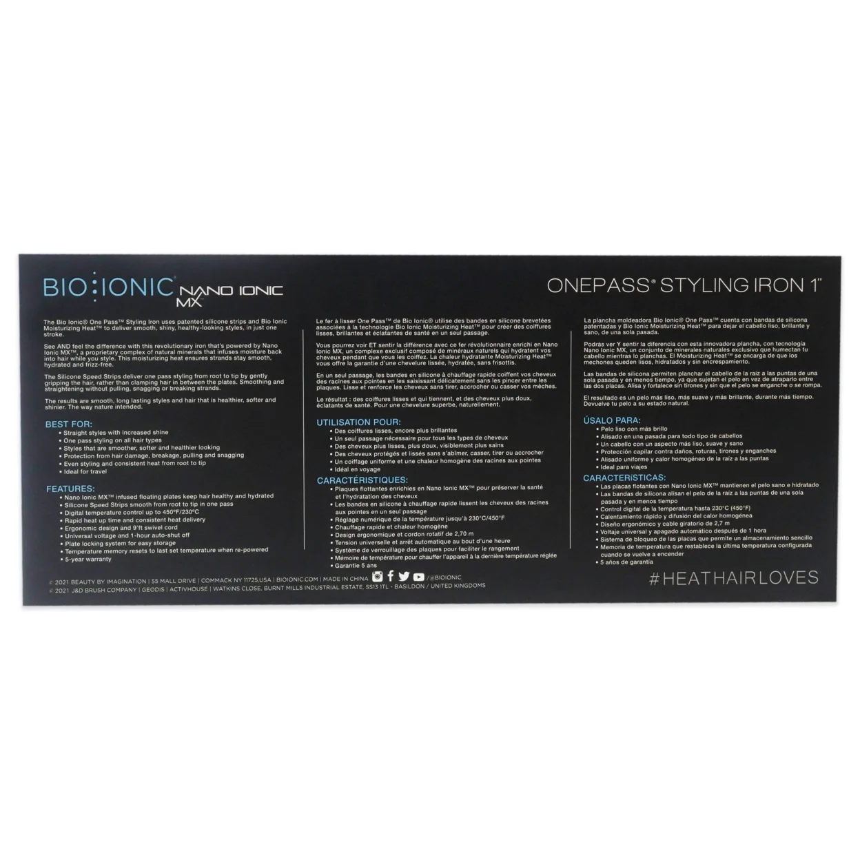 Achieve effortless, vibrant styles with the Bio Ionic OnePass Styling Iron that combines NanoIonic MX and Moisturizing Heat Technology to lock in moisture and seal the cuticle, ensuring quick styling. This straightening iron promotes hydration and delivers exceptional shine, giving you a high-gloss finish like never before. See and feel the difference with this revolutionary Bio Ionic flat iron powered by NanoIonic MX, a proprietary complex of natural minerals that infuse moisture back into hair while you style. This Moisturizing Heat ensures strands stay smooth, hydrated, and frizz-free. The silicone speed strips deliver one-pass hair styling from root to tip by gently gripping the hair, rather than clamping hair in between the plates. This way you can smooth and straighten without pulling, snagging, or breaking strands. The ceramic hair straightener has advanced features including a ceramic mineral complex, adjustable heat settings, and a swivel cord for easy maneuverability. The innovative design effortlessly gives exceptional results and features like a 1-hour auto shut-off, universal voltage, and lightweight design. This styling iron ensures efficient and safe styling, making it a must-have tool for glam days at home. Bio Ionic Onepass Flat Iron, Hydrated and Frizz-Free Hair Styling, 1 Hour Auto Shut-Off, 1-Inch
