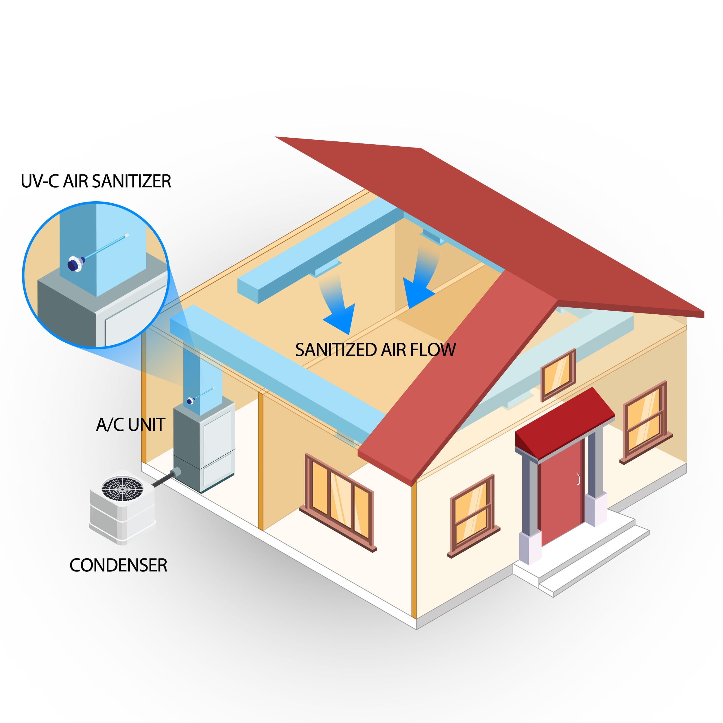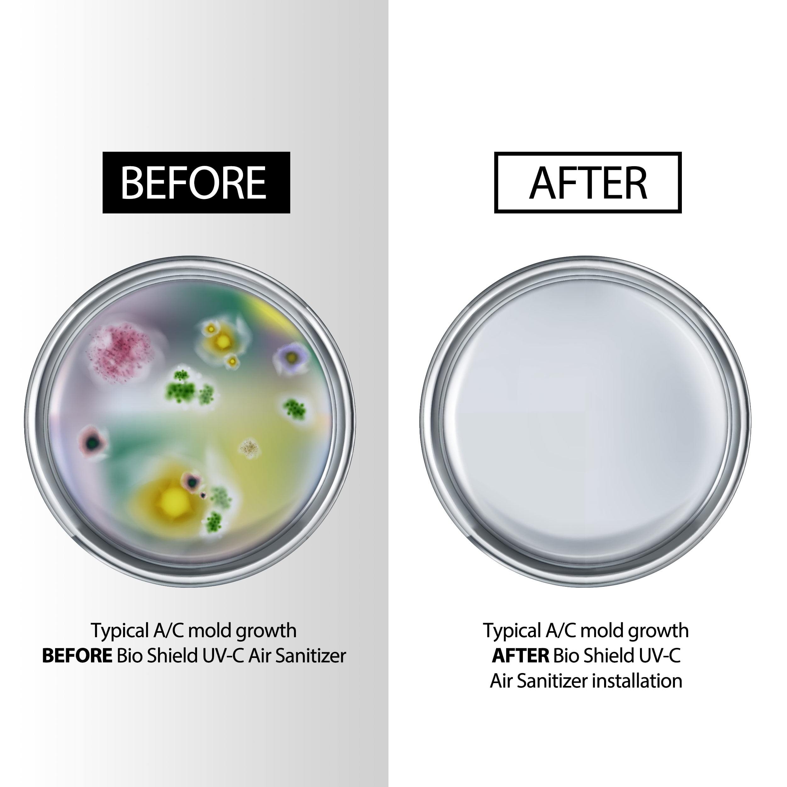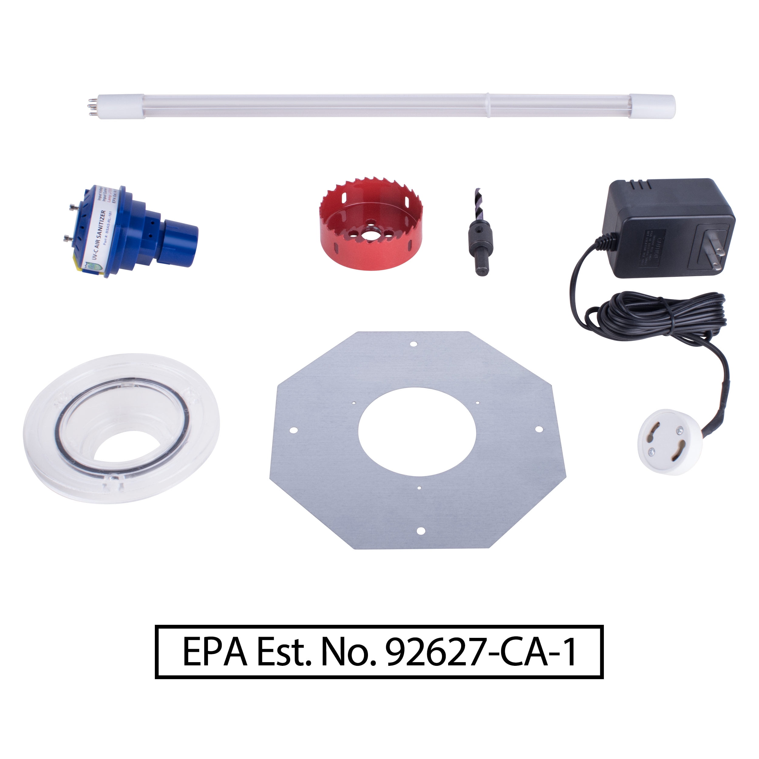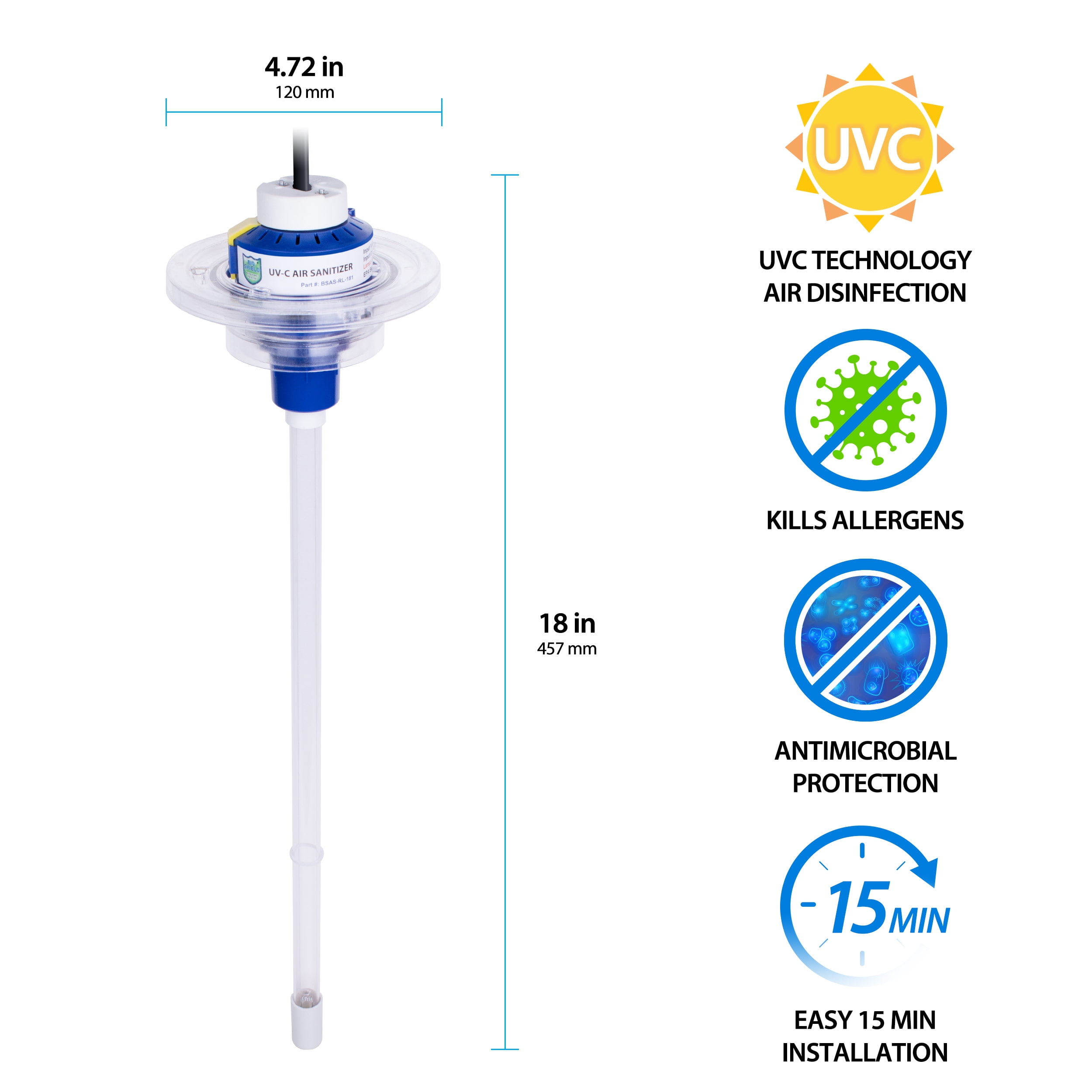Bio-Shield kills the air contaminants that can colds, flu, sinus Sanitizes and protects entire home 22W Blue Light Water resistant lamp and socket Includes Phillips 17 Inch Bulb Eliminates need for costly duct cleaning Installs on exterior of HVAC equipment Replace bulb once a year Includes Hole Saw and Drill Bit Easy and safe DIY installation – 1. Locate duct and attach mounting template. 2. Drill hole in duct with hole saw. 3. Mount bracket with 3 screws. 4. Insert bulb and plug into power source.