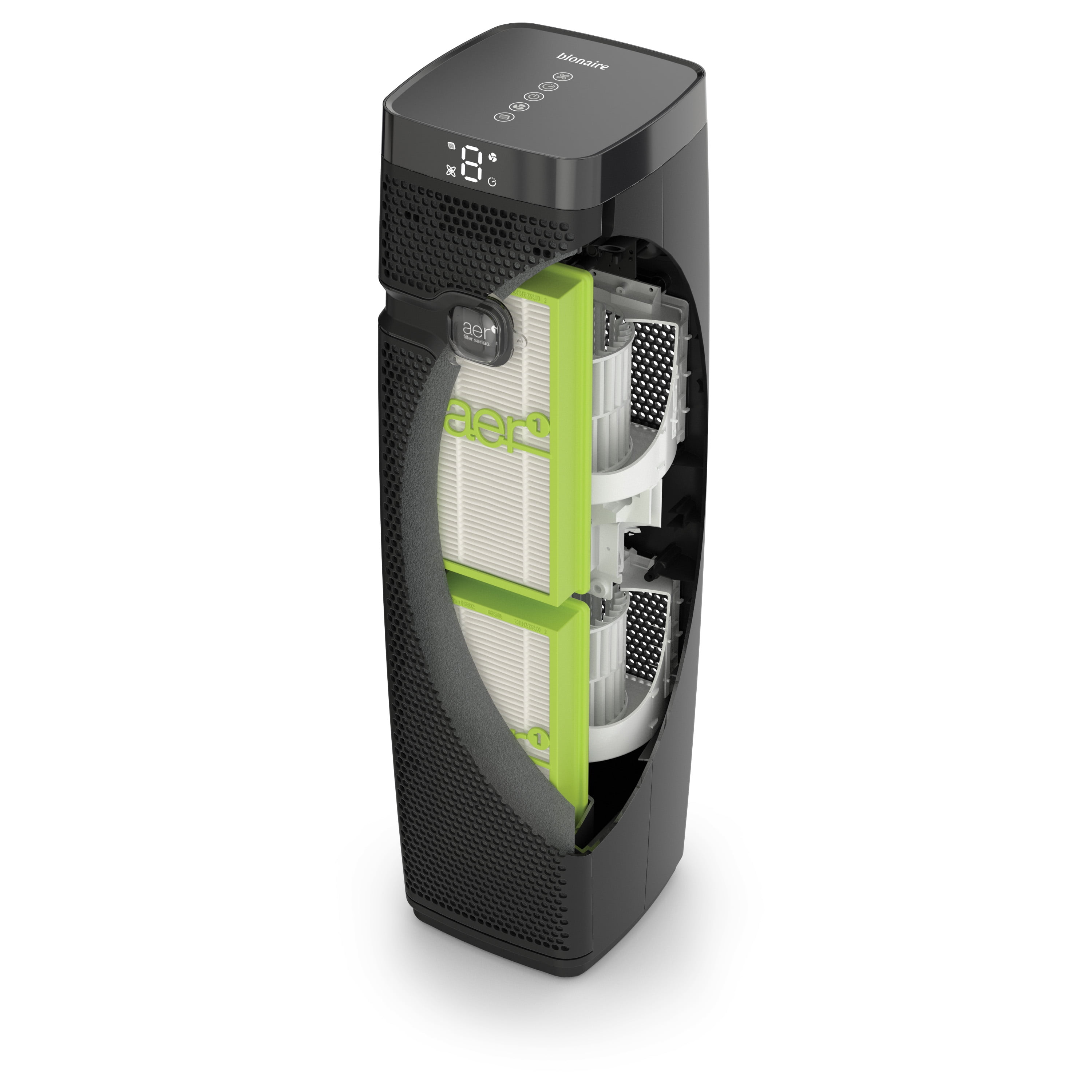 The 4 Stage Filtration System work to remove pollen, dust, mold, pet dander, and smoke from any medium room up to 188 sq ft. Removes up to 99.97% of airborne particles. The Bionaire ® Aer1 True Hepa Air Purifier Tower with Timer and Filter Indicator Light captures particles as small as 0.3 microns from air passing through the filter The Bionaire® Aer1 True Hepa Air Purifier Tower space-saving design easily fits in any corner of the room, leaving clean and crisp air all around your home. Model #: BAP9435