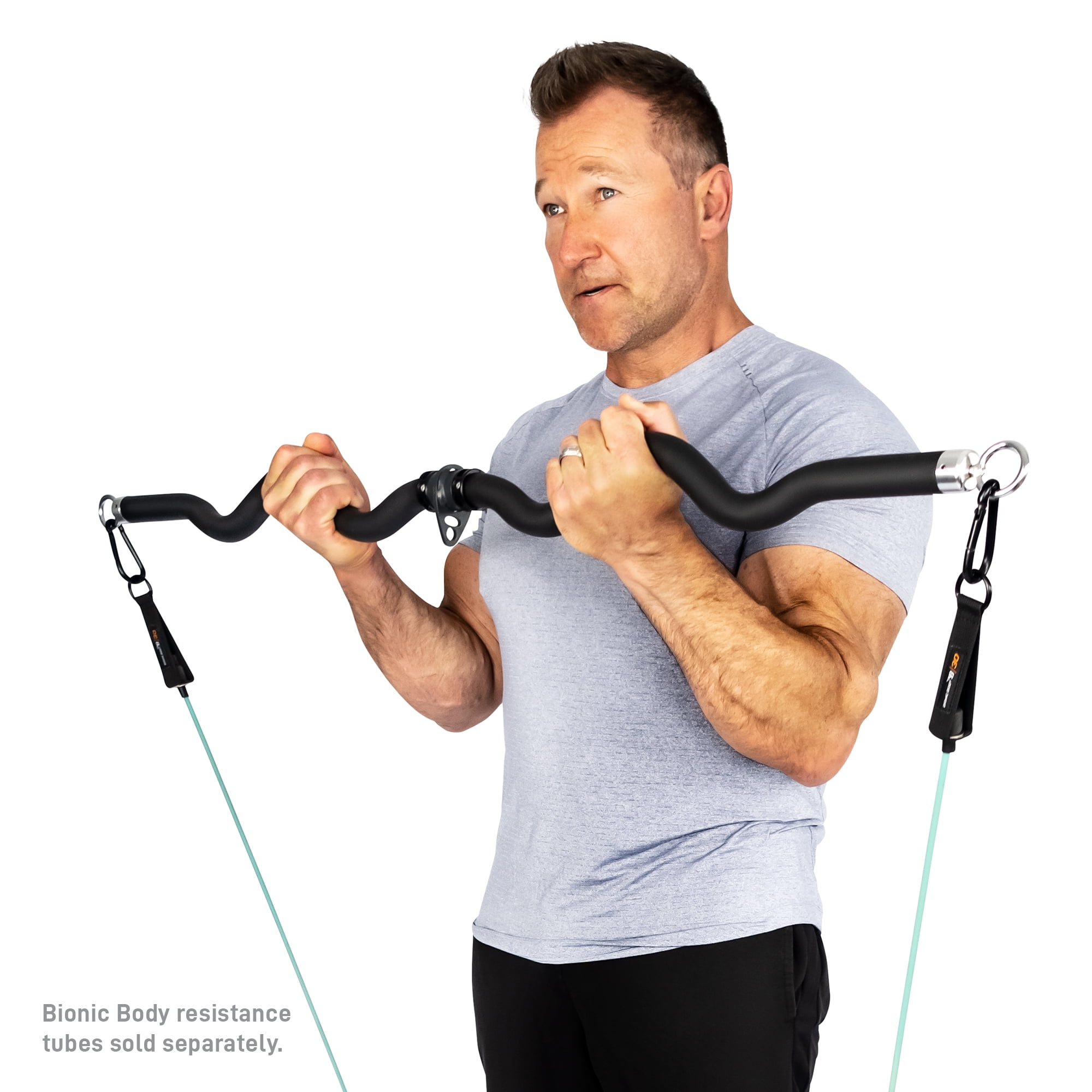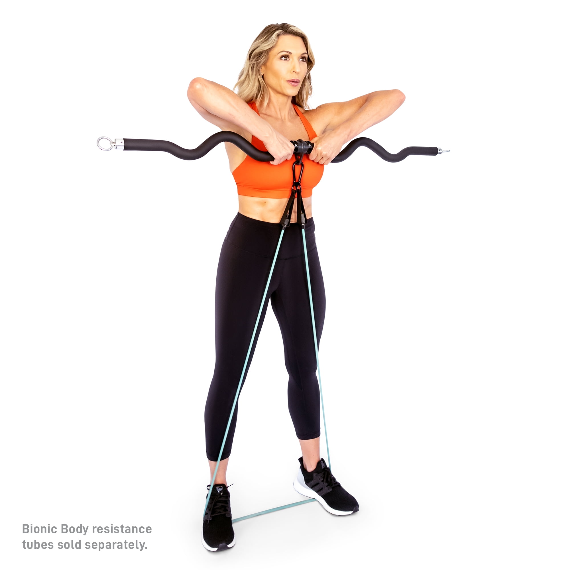 Bionic Body Deluxe Exercise Bar for Lats, Curls and More BBEB-7355: How the Bionic Body Deluxe Exercise Bar Works – The BBEB-7355 Exercise Bar is intended to be used with Bionic Body Resistance Tubes (not included.) Simply attach your resistance tubes to the swivel rings and you have a home gym in your hands. Turn any space in to your home gym – Because the Bionic Body Deluxe Exercise Bar is slim, it is easy to store when not in use and perfect for turning your unused space in to a workout space. Get a full body workout at home, without all the space taken by bulkier equipment. Ergonomic Design – The ergonomic design of this specific workout bar is what makes it special. The curves on the bar make workouts easier on your elbows, wrists, and forearms. In addition, the curves are perfect for lat workouts and curls. Durable Construction – The sturdy steel used to construct the BBEB-7355 ensure your bar will have a long life time. The rubber sleeve protects the steal and even provides a better grip than grabbing the steel directly.. Swivel Points to Ensure Smooth Tension – Your resistance band would attach to the outer rings of the Deluxe Exercise Bar, or to the center ring. All three rings swivel to ensure your workout is smooth no matter which angle works best for you.