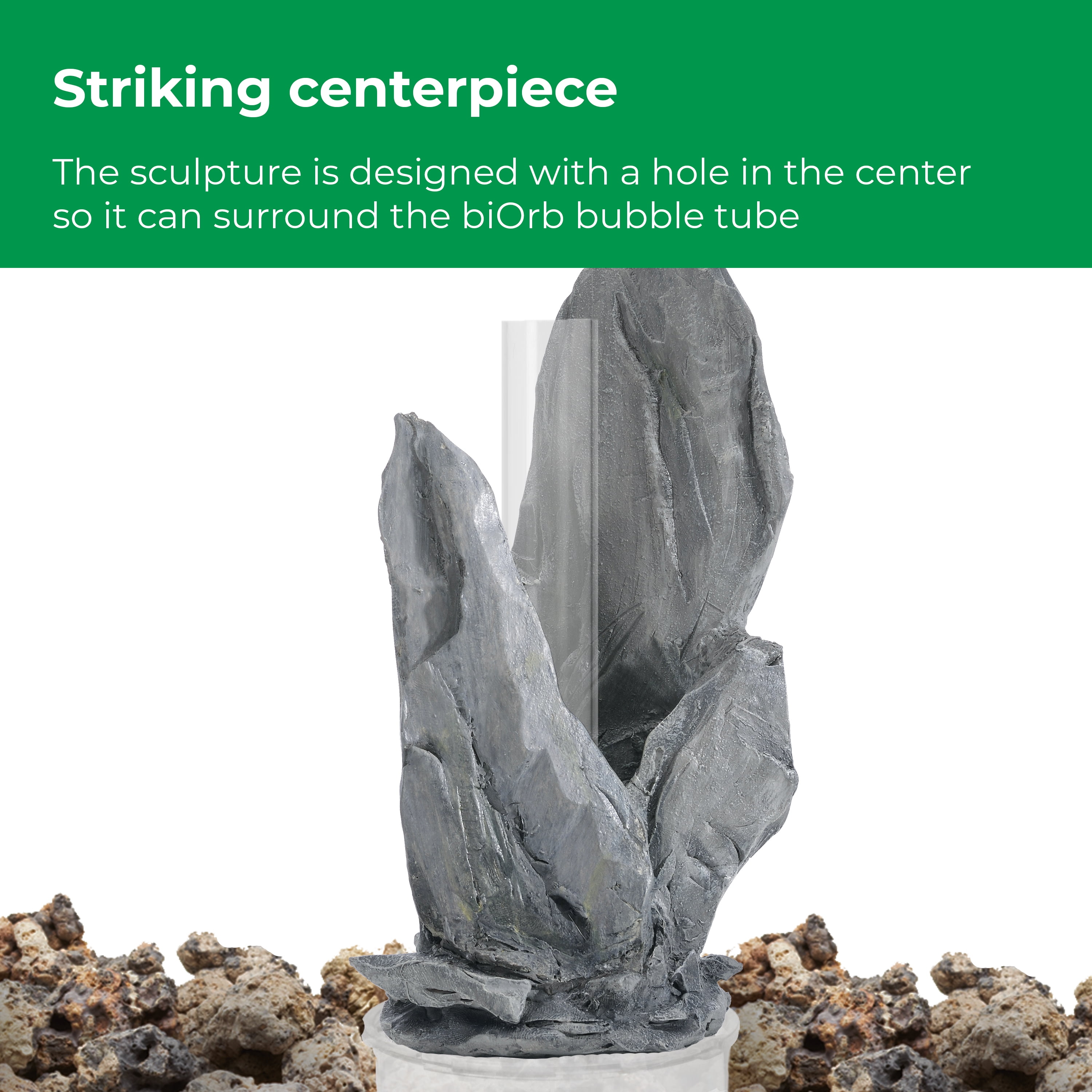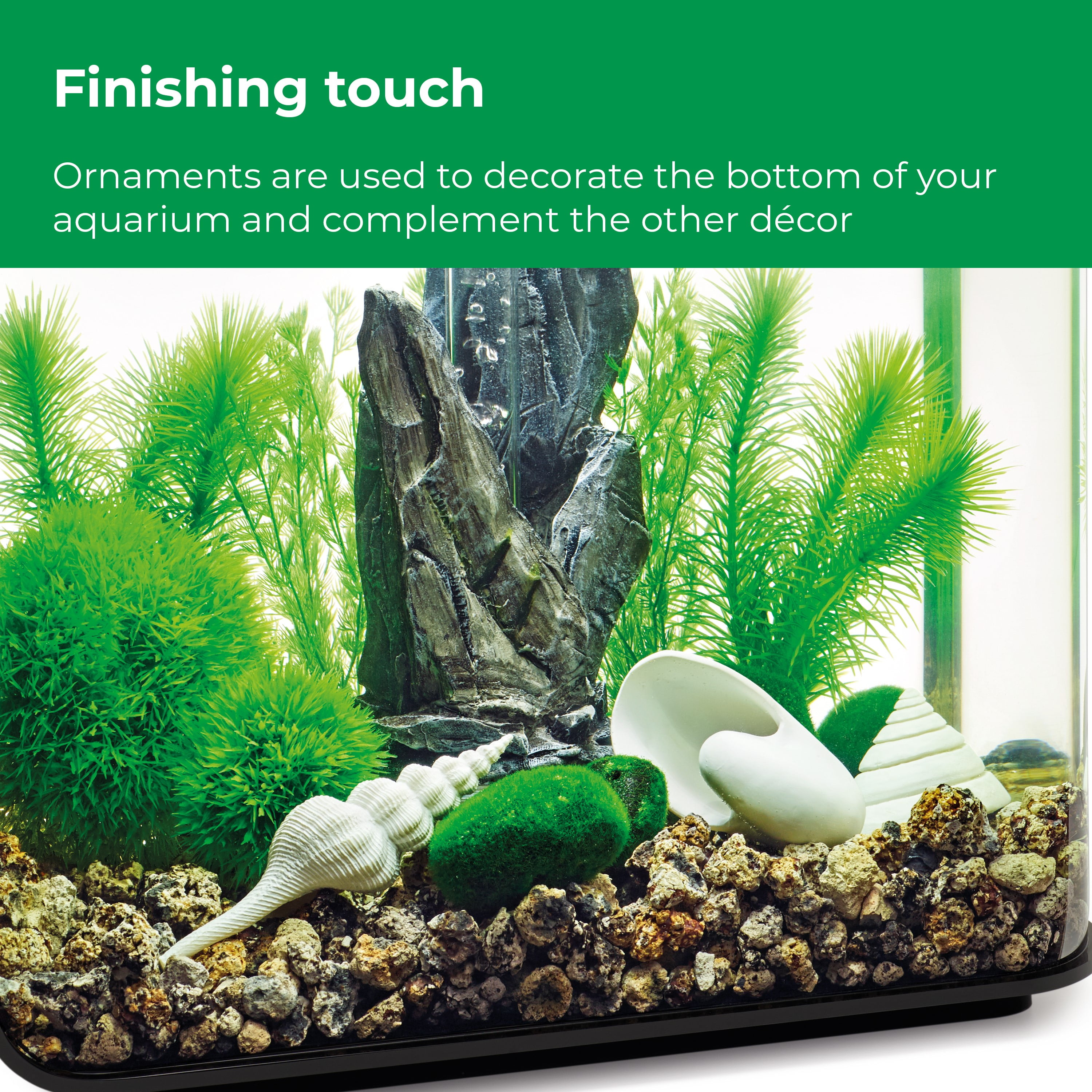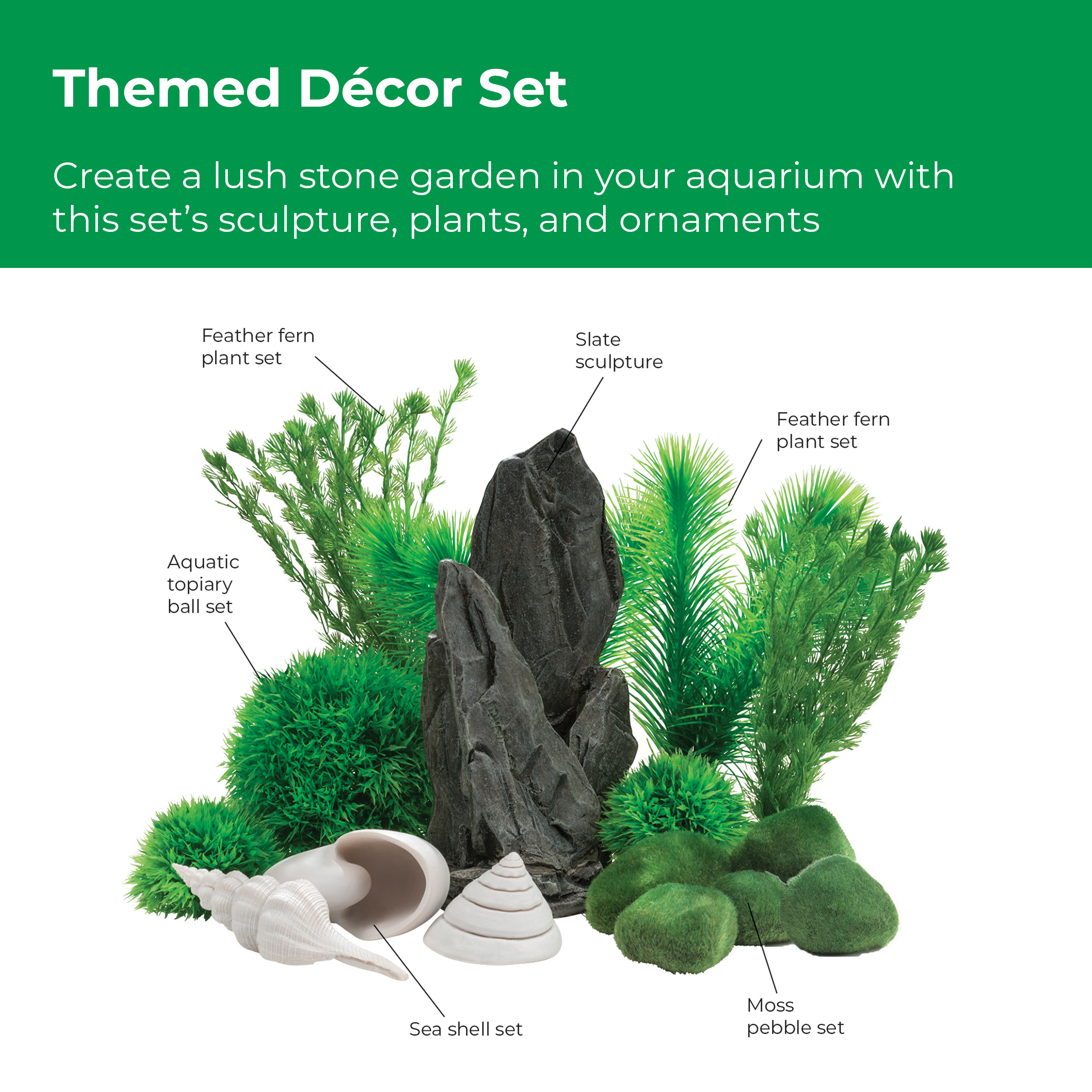 DECORATE YOUR AQUARIUM IN A SNAP! biOrb Décor Sets are a themed collection of some of our favorite pieces, curated for your aquarium. This set features a stunning gray slate Samuel Baker sculpture, two small feather fern sets, an aquatic topiary ball set, a white seashell set, and faux moss pebbles. Each perfectly complements the others. THOUGHTFULLY DESIGNED COMPONENTS — The centerpiece of this set is the durable ceramic resin blend sculpture that effortlessly slides over the biOrb bubble tube. The fish-friendly plants are designed with smooth weighted ball bases that seamlessly blend in with the biOrb ceramic media. Additionally, the durable seashell set consists of three intricately detailed replicas in varying shapes. CONVENIENTLY SIZED — These elements come together to create a lush stone garden scape within a biOrb LIFE 15 and 8 gallon (30 L) and larger biOrb aquariums. SAFE FOR FISH AND EASY TO CLEAN — The materials used to create our décor are non-toxic, easy to clean, and durable. Simply remove, rinse, and return the components to your aquarium to maintain their pristine appearance. COMPATIBILITY IS KEY— All biOrb decorations are compatible with freshwater or saltwater aquarium setups. So, you can create your dream underwater oasis regardless of the type of aquatic environment you prefer.