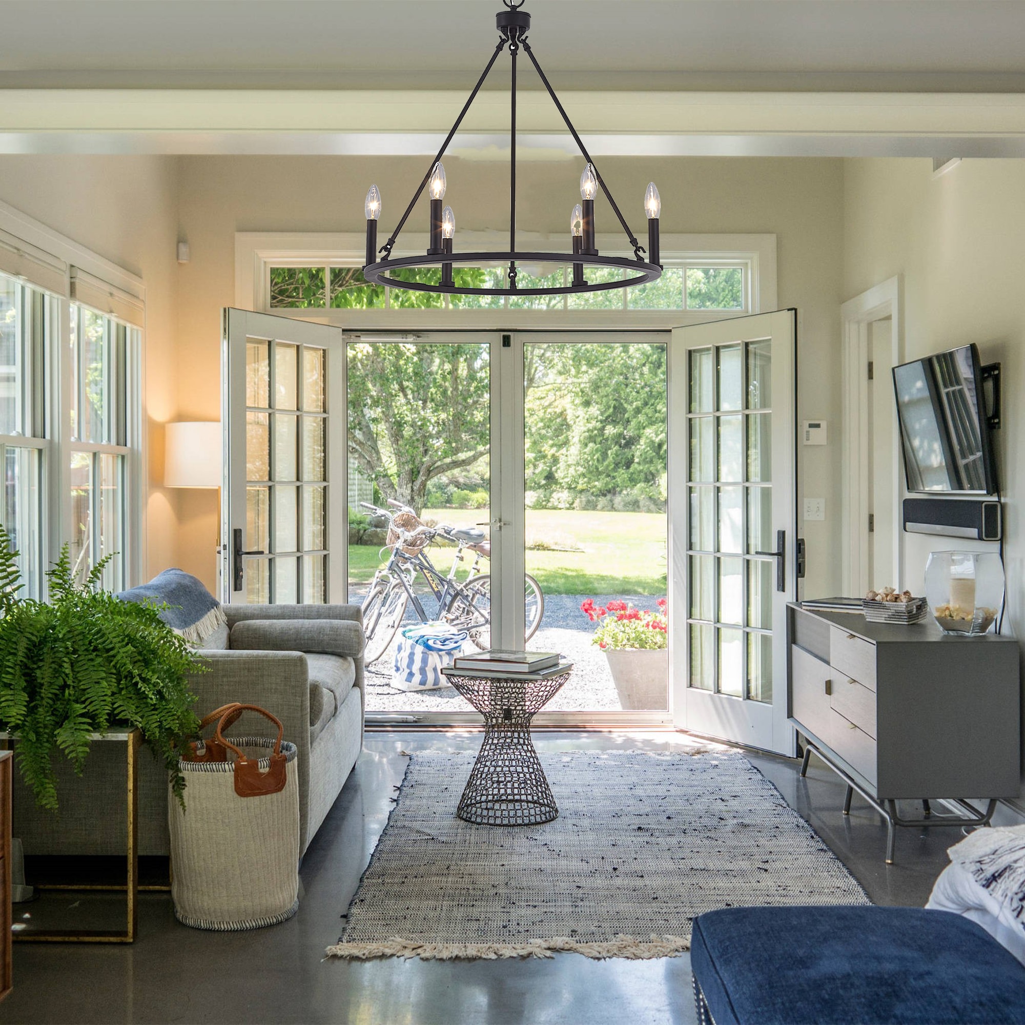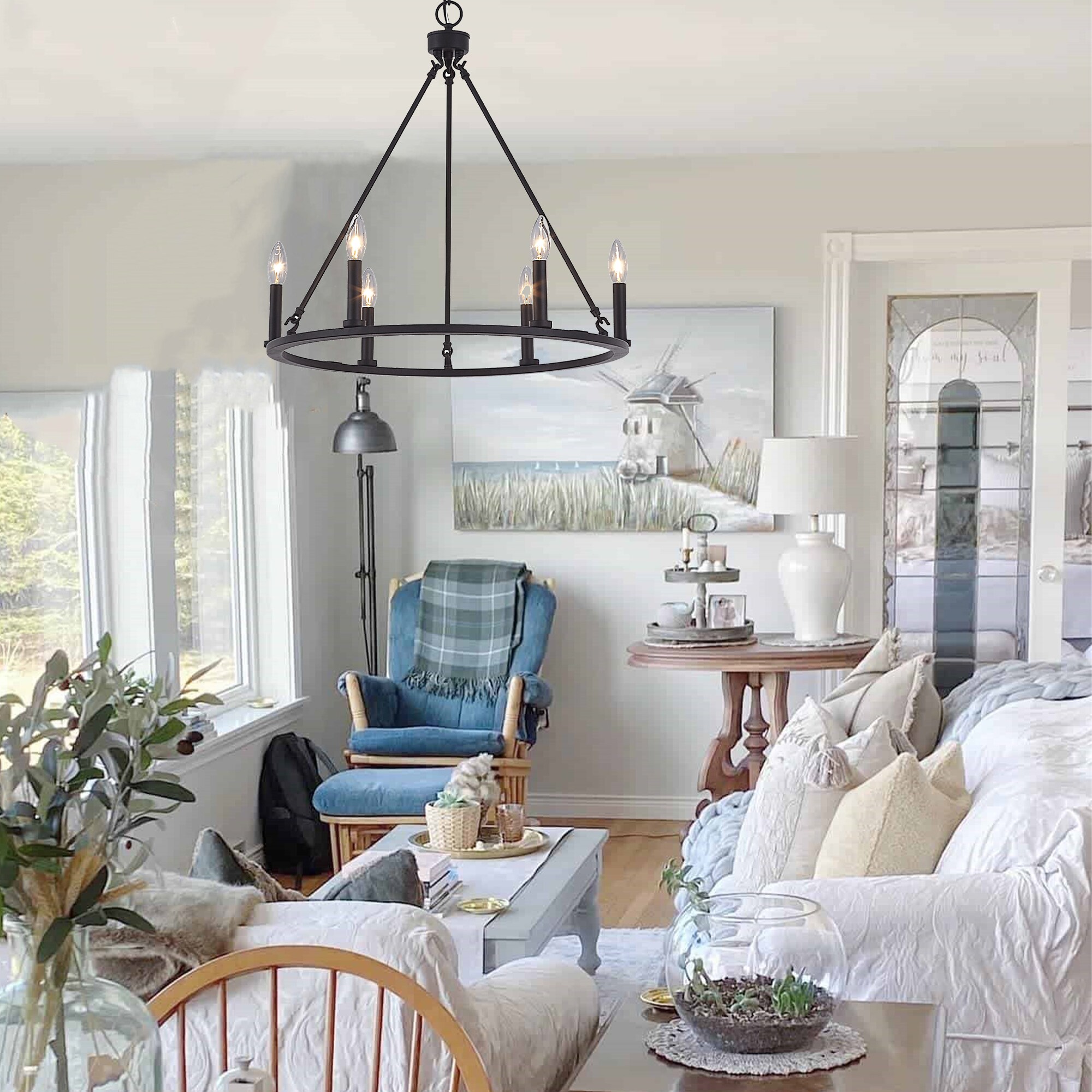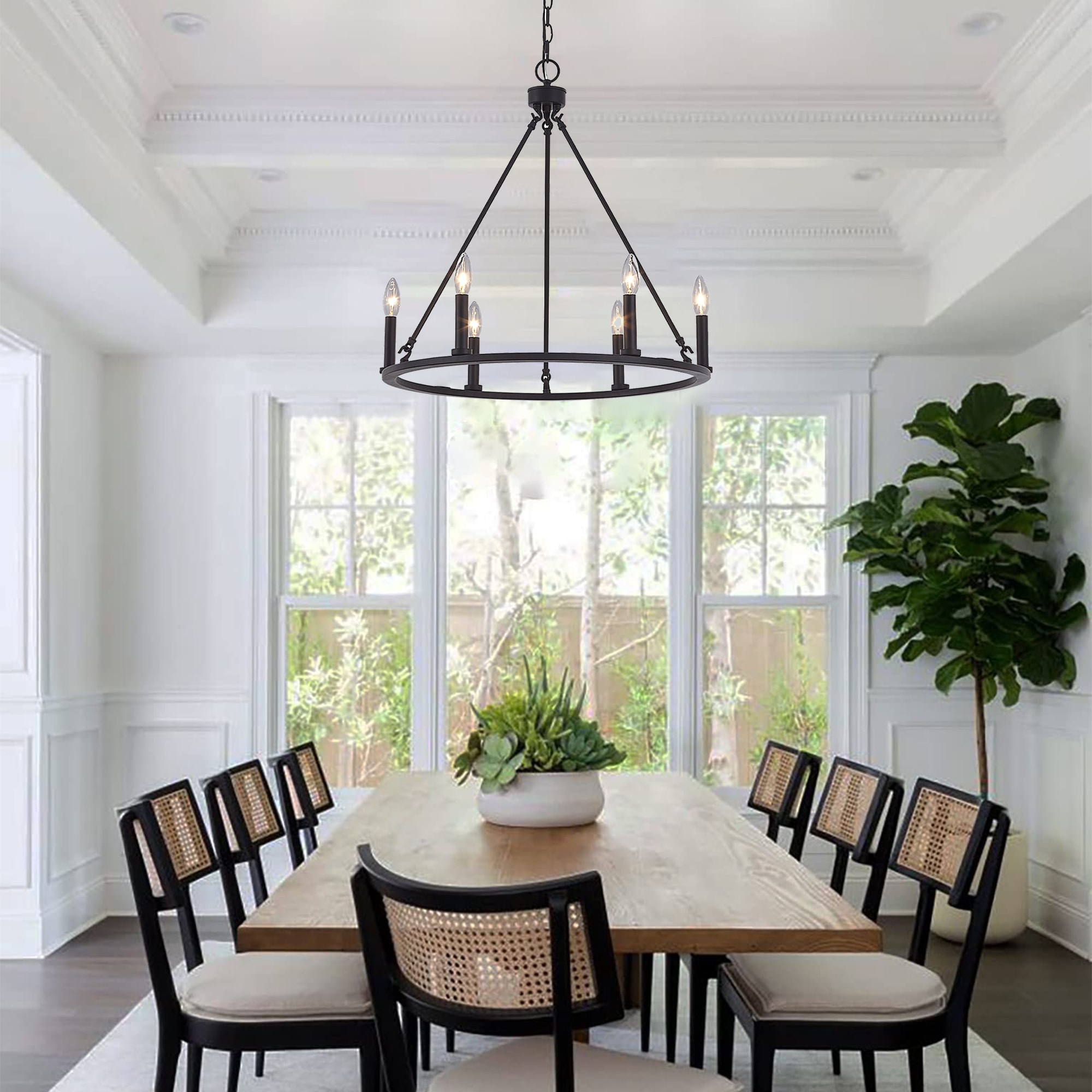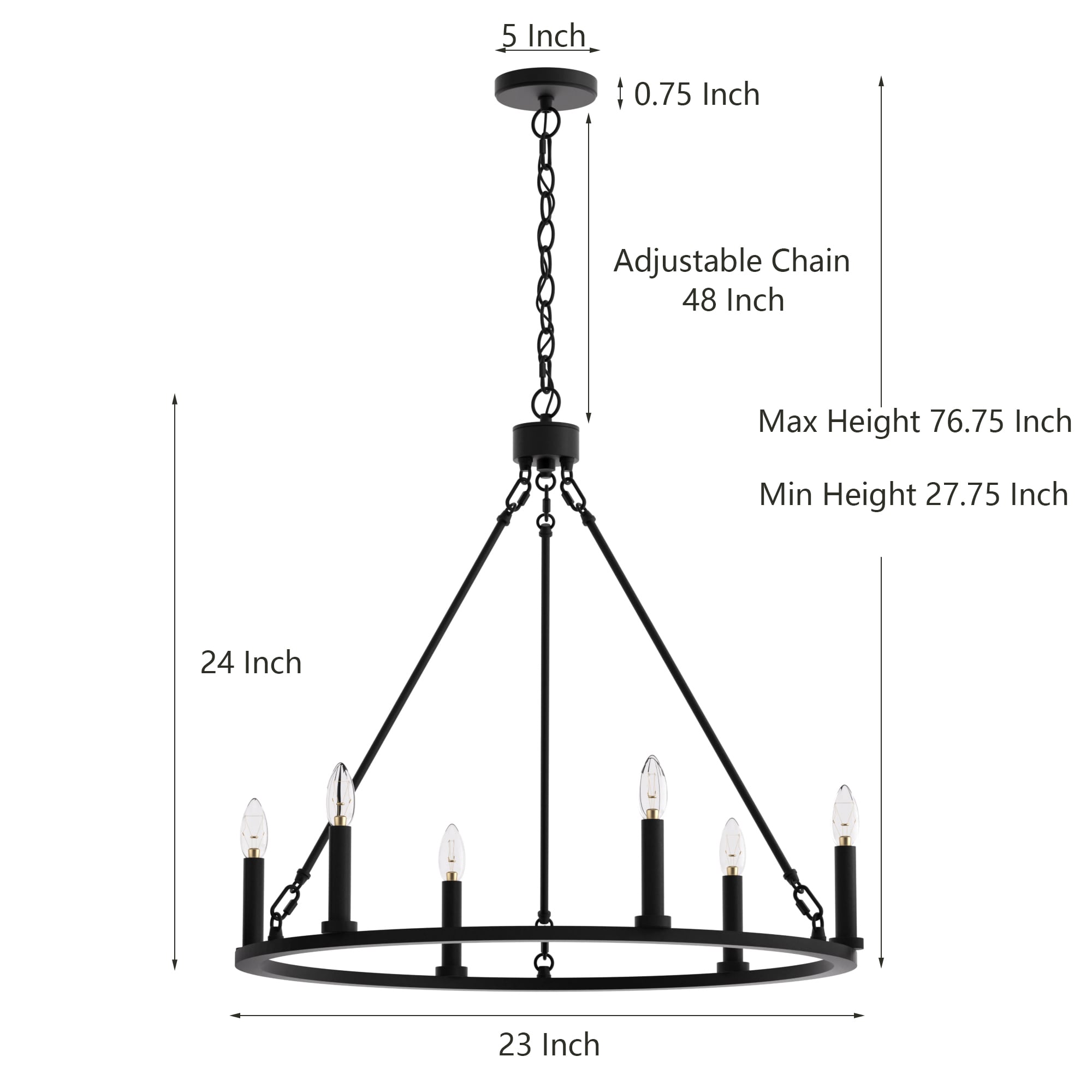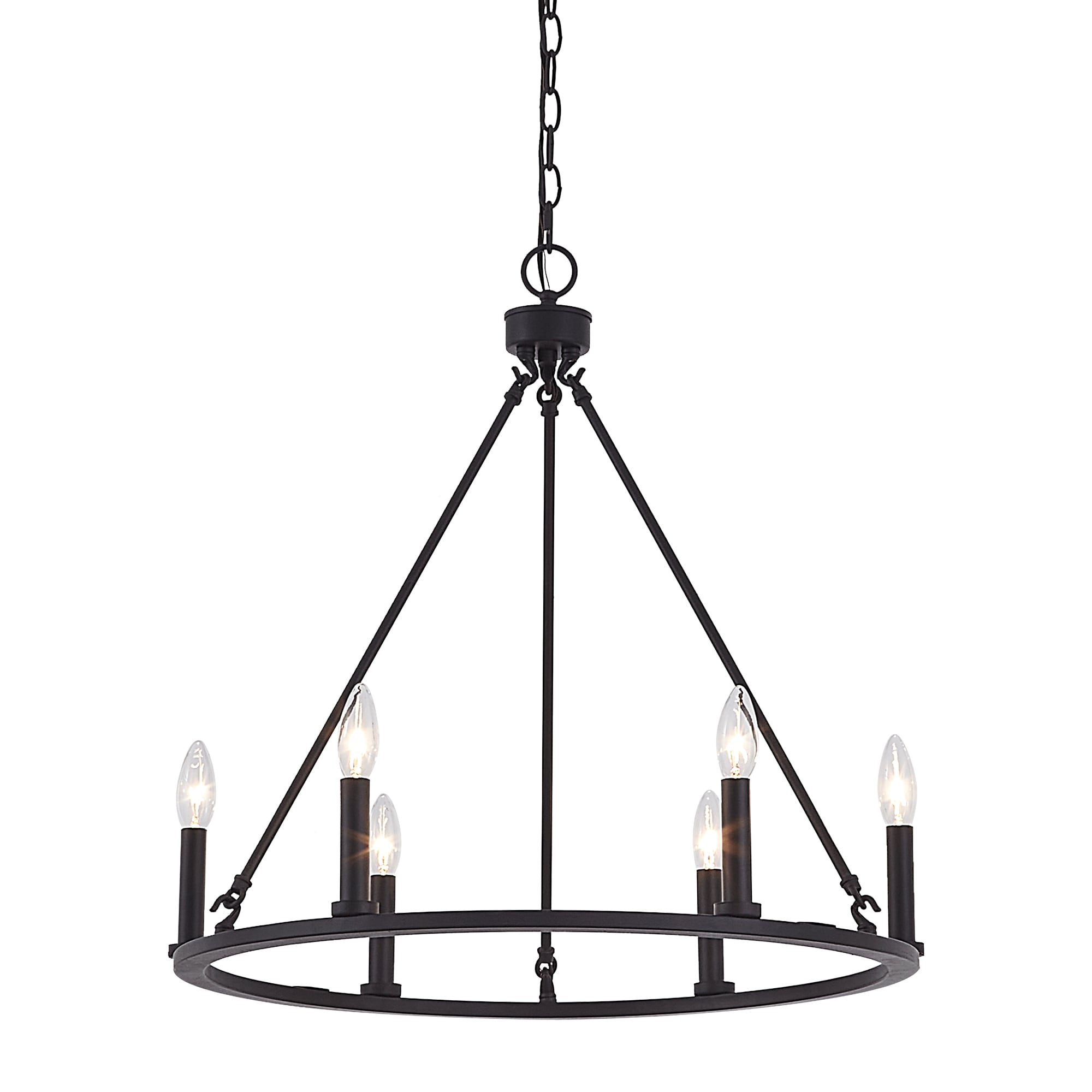 This 6-light chandelier features a classic wagon wheel design that stands out in your living room or a larger entryway. Made from metal with a distressed finish for an antique-inspired look, it also shows off candle-style holders that give off a traditional vibe with the proper flame-shaped bulbs sold separately. Three angled support beams connect to the central fixture to provide plenty of stability, and it hangs with the help of a height-adjustable chain. The included canopy is compatible with sloped ceilings for your convenience. Plus, this chandelier is dimmable, so it’s able to move you effortlessly from day to night.