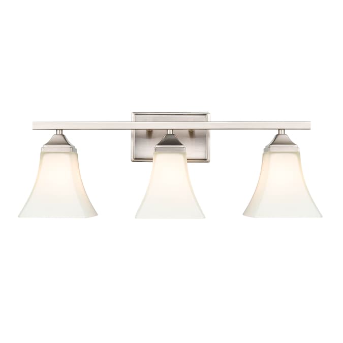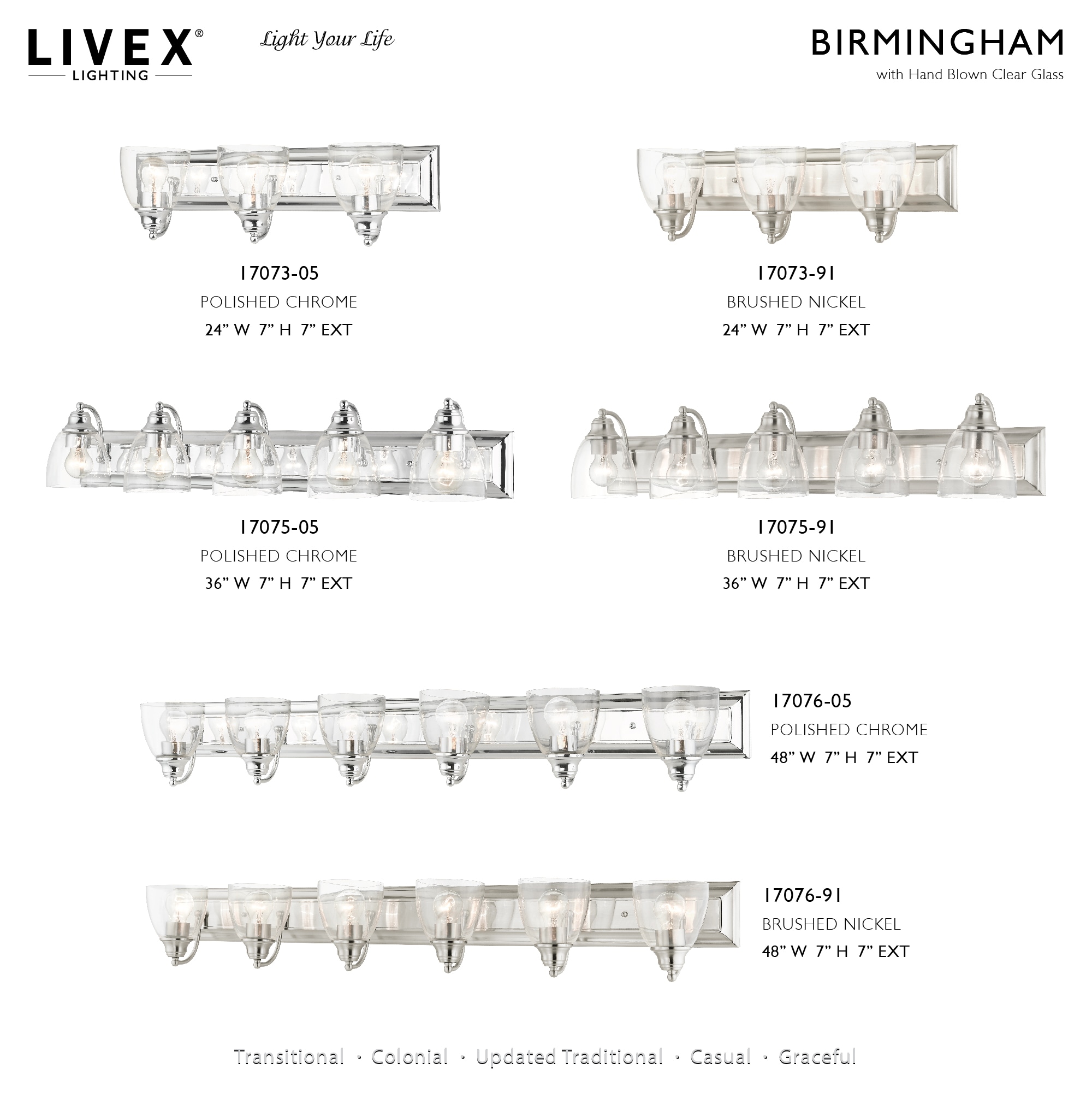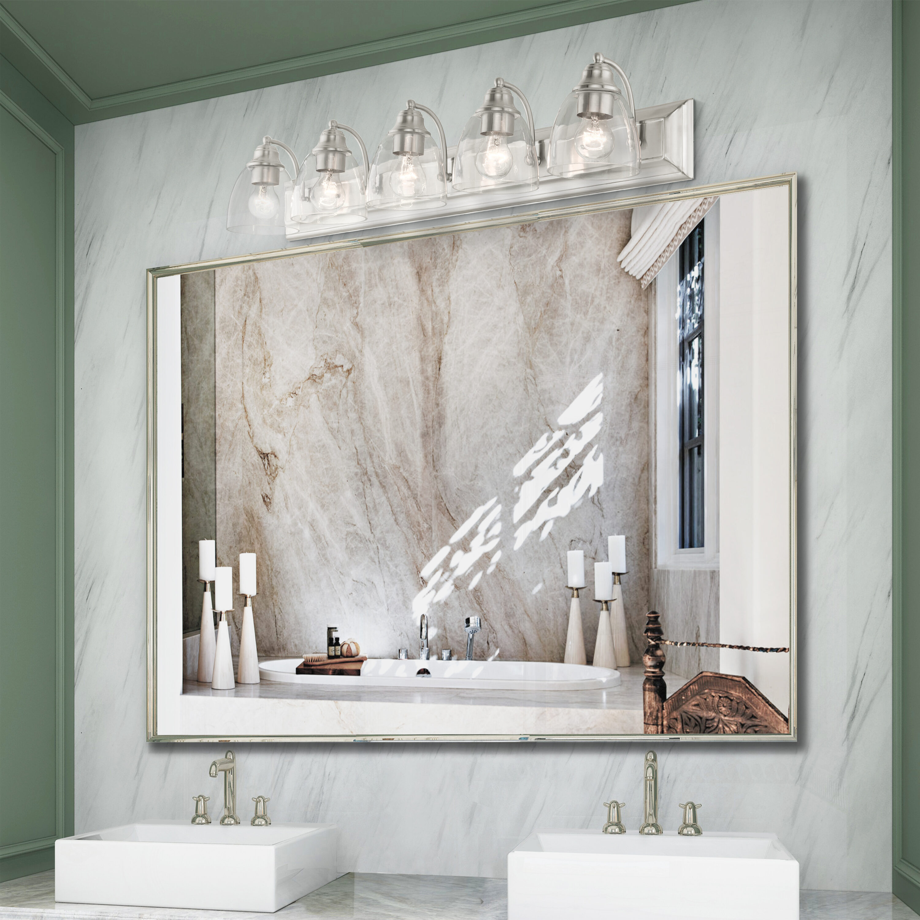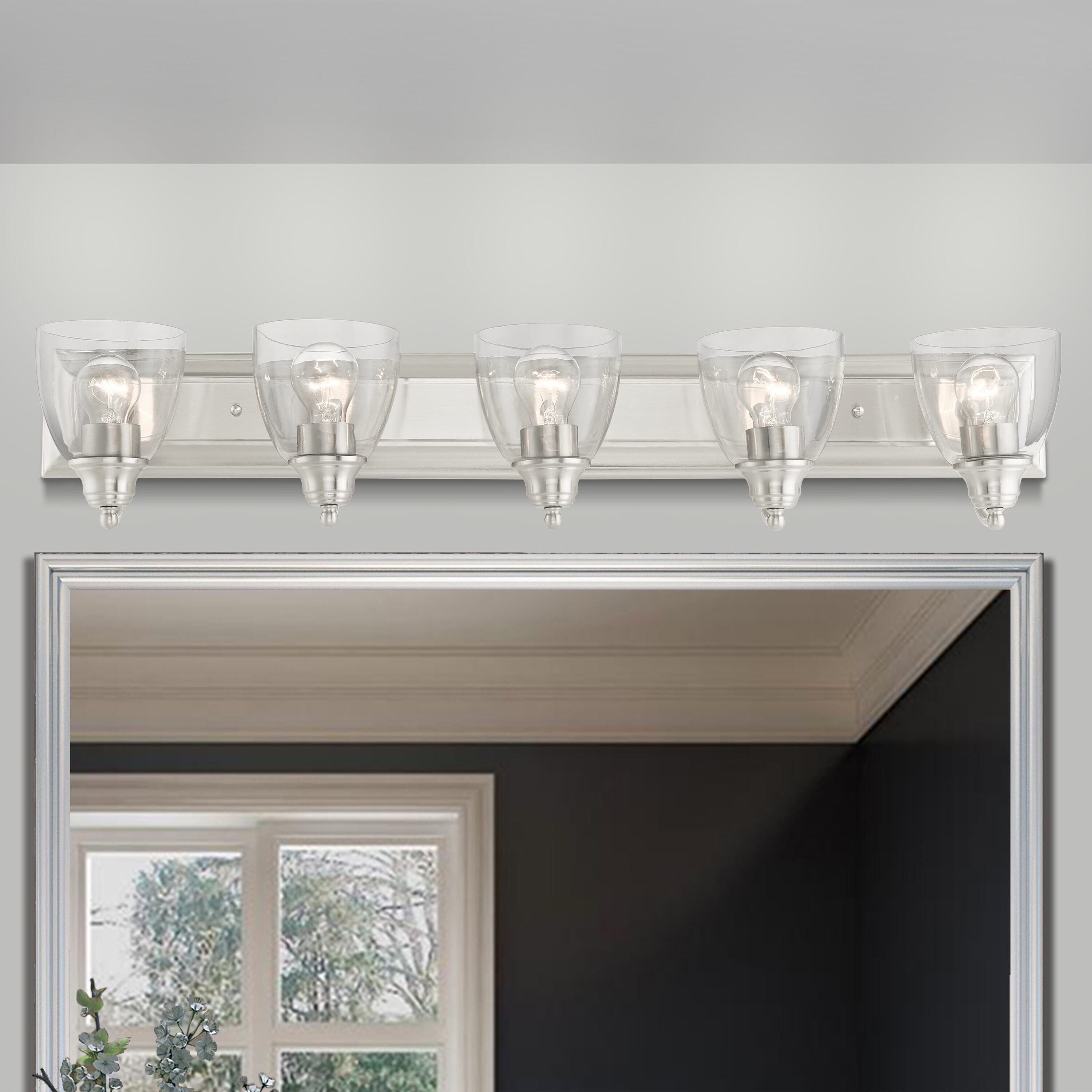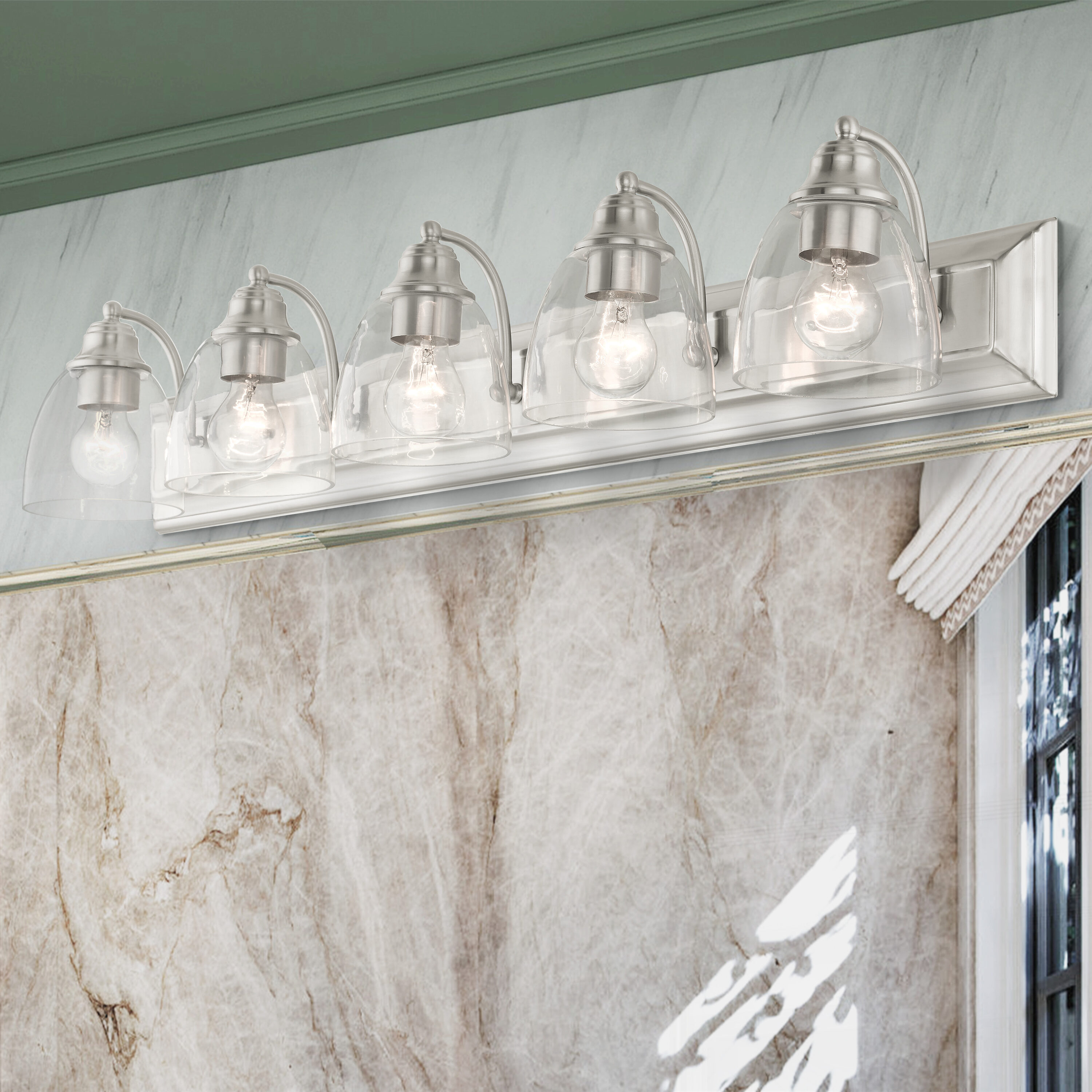 Bring a beautiful new look to your bathroom or vanity area with this charming large five-light vanity sconce from the Birmingham collection. A wide rectangular brushed nickel finish back plate supports five simple graceful arms that hold five hand blown clear glass shades. The clean lines of this updated classic will make this piece an appealing part of your home.