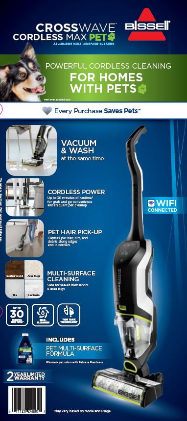 BISSELL® CrossWave® Cordless Max Pet multi-surface cleaner combines tasks, vacuuming and washing at the same time to save you time! The 36V lithium-ion battery provides up to 30 minutes* of powerful cordless cleaning for homes with pets, so you can move throughout your home without being tied to an outlet. Its multi-surface cleaning capabilities let you switch from cleaning sealed hard floors to refreshing area rugs in an instant. CrossWave Cordless Max Pet multi-surface cleaner also captures pet hair, dirt, and debris along edges and in corners. Its Two-Tank Technology keeps clean and dirty water separate, so unlike mopping, only clean water and formula are dispersed on your floor. When you’re finished cleaning, CrossWave Cordless Max Pet multi-surface cleaner’s self-cleaning cycle cleans the brush roll and inside of the machine, to maximize cleaning performance. It also comes with a PET Multi-Surface Brush Roll and two PET Multi-Surface formula’s with Febreze Freshness to help eliminate pet odors. And this machine doesn’t just clean up after pets, it helps save them, too! BISSELL proudly supports BISSELL Pet Foundation® and its mission to help save homeless pets. When you buy a BISSELL product, you help save pets. We’re proud to design products that help make pet messes, odors and pet homelessness disappear. *May vary based on mode and usage.