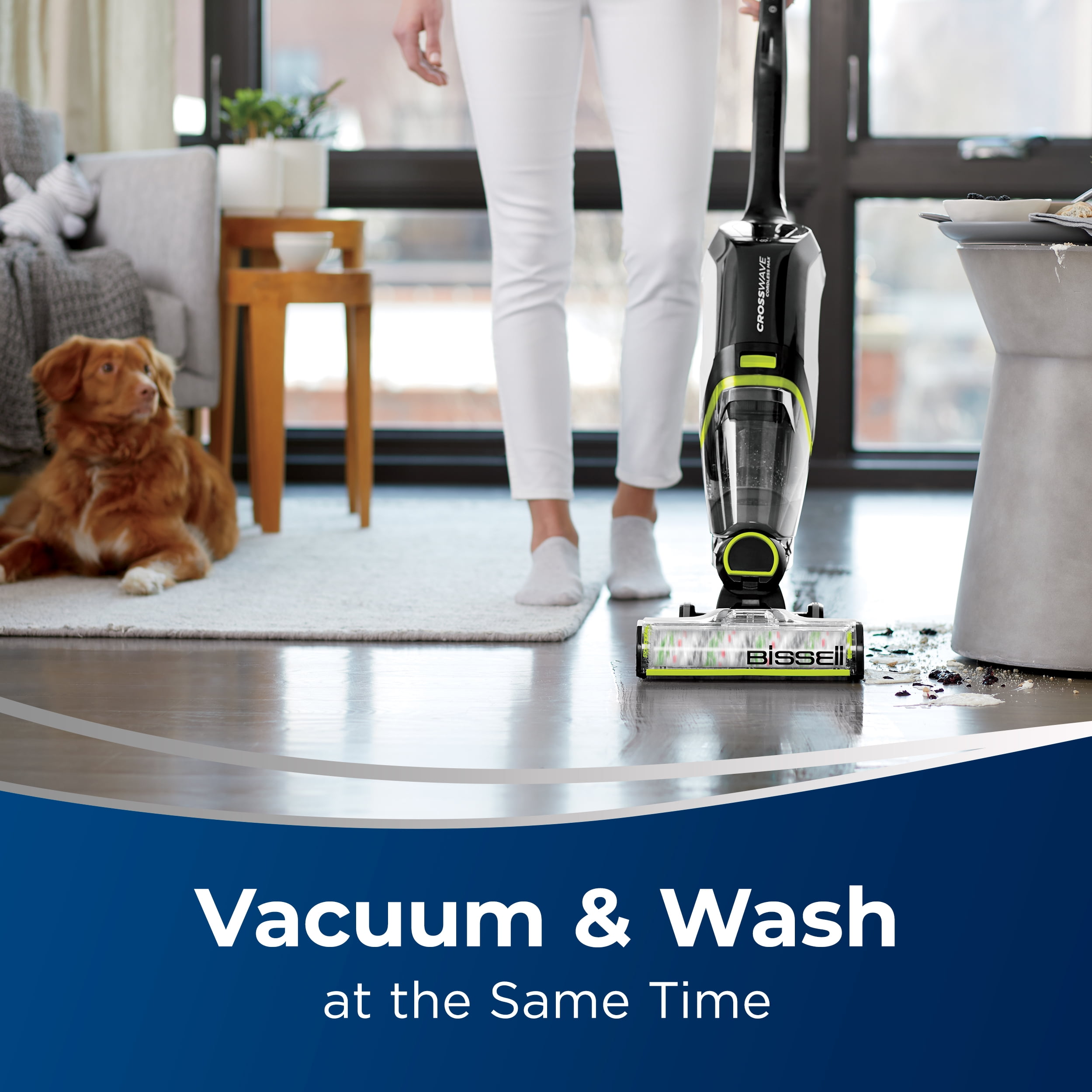 Every Purchase Saves Pets™. BISSELL proudly supports BISSELL Pet Foundation® and its mission to help save homeless pets. Vacuum & Wash at the Same Time. Combine floor cleaning chores with cordless freedom. Powerful Cordless Cleaning for Homes with Pets. 36V lithium-ion battery provides up to 30 minutes of run time.* Pet Hair Pickup. Clean up pet hair, dirt and debris along edges and in corners. Pet Hair Strainer. Separates and traps pet hair and debris in the dirty water tank for an easy empty. Multi-Surface Cleaning. Safe and effective for use on tile, sealed wood floors, laminate, linoleum, rubber floor mats, pressed wood floors, and more. It even refreshes area rugs! Self-Cleaning Cycle. Cleans the brush roll and inside of the machine to help maintain cleaning performance. Two-Tank Technology. Keeps clean water and formula separate from dirty water and debris. Formula, Brush Roll & Dock Included. Comes with two PET Multi-Surface with Febreze Freshness to help eliminate pet odors, a PET Multi-Surface Brush Roll, and a 3-in-1 Docking Station. WiFi Connected Capabilities. Works with the BISSELL Connect app to provide helpful alerts, maintenance tracking and usage tips. May vary based on mode and usage. Certain trademarks used under license from The Procter & Gamble Company or its affiliates.