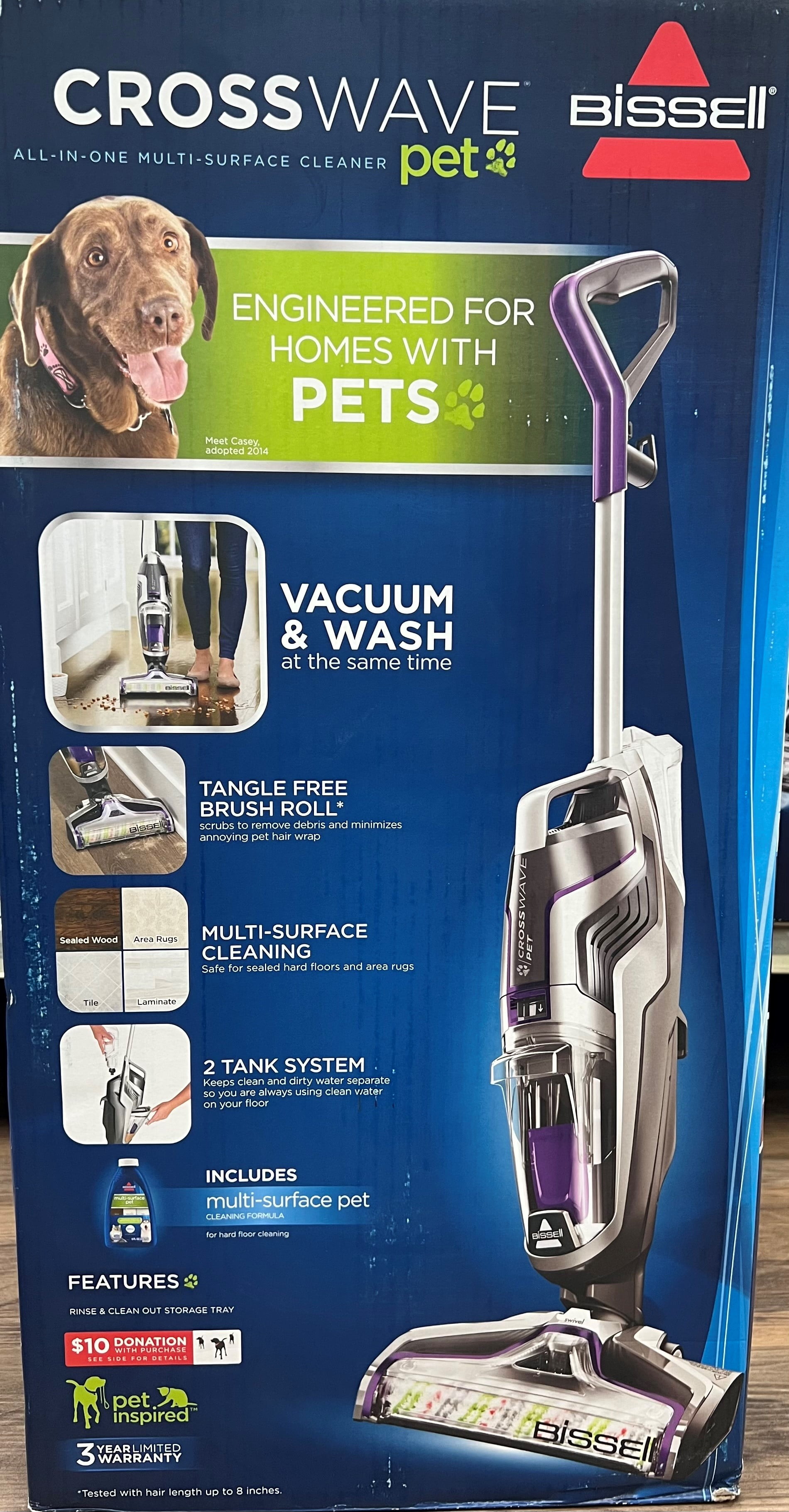 Every Purchase Saves Pets™. BISSELL proudly supports BISSELL Pet Foundation® and its mission to help save homeless pets. Vacuum and Wash at the Same Time. BISSELL® CrossWave® Turbo Pet Pro floor cleaner cleans multi-surfaces better and faster than a sponge mop and bucket.2 Multi-Surface Cleaning. Safe and effective on tile, wood, laminate, linoleum, vinyl, rubber mats, pressed wood floors, and rugs. Pick Up Pet Messes. CrossWave® Pet Pro multi-surface cleaner is equipped with a Tangle-Free Brush Roll, Pet Hair Strainer, and PET Multi-Surface Formula that comes with Febreze Freshness. Hassle-Free Clean. Reduce pet hair wrap on brush, prevent sink clogs with strainer, and eliminate odors in one clean. Antimicrobial Treated1 FreshStart Filter. Safeguard your filter from unpleasant odors. Self-Clean Out Cycle + Rinse & Cleanout Storage Tray. Easily clean your machine with 8oz. FreshStart Clean Out Cycle Formula.