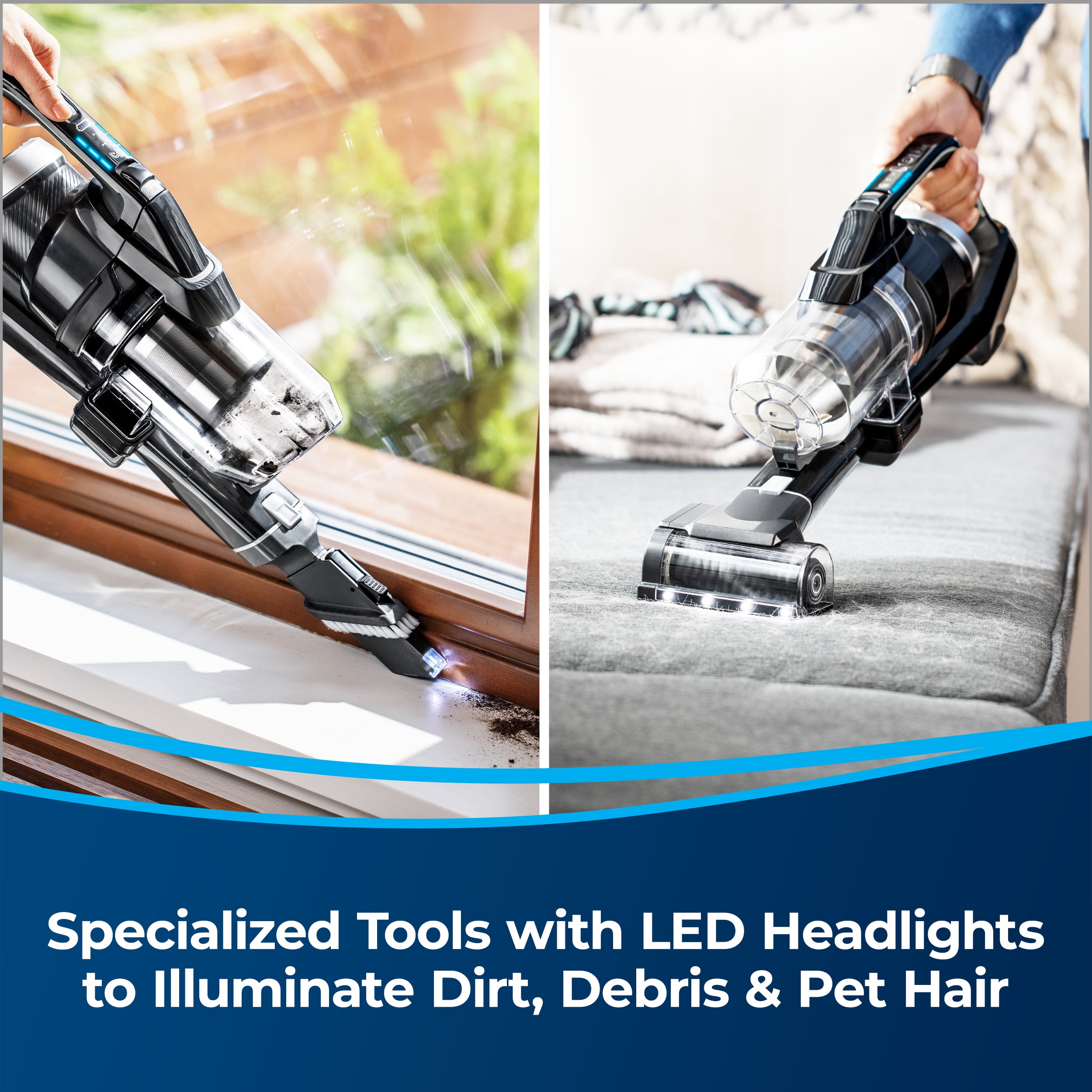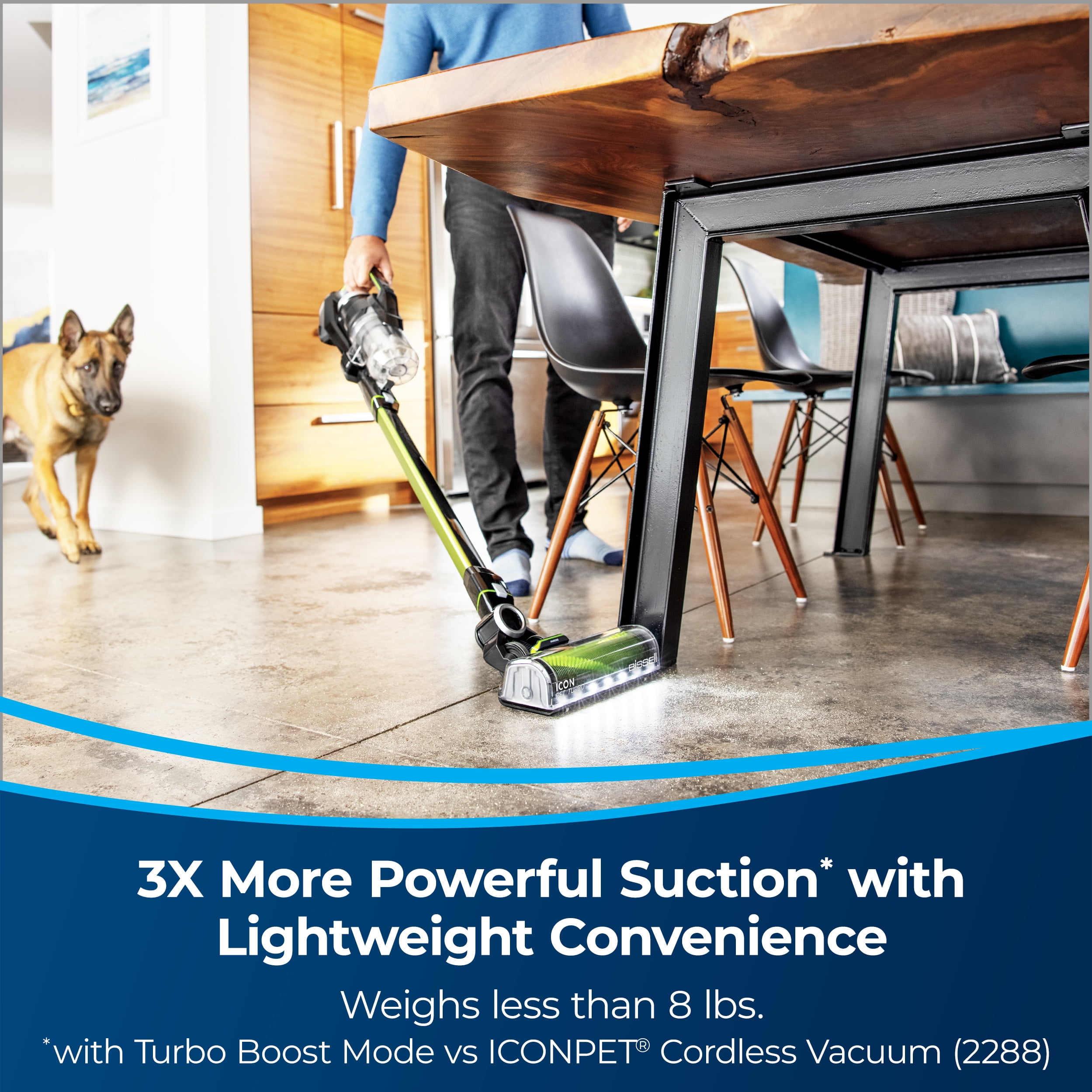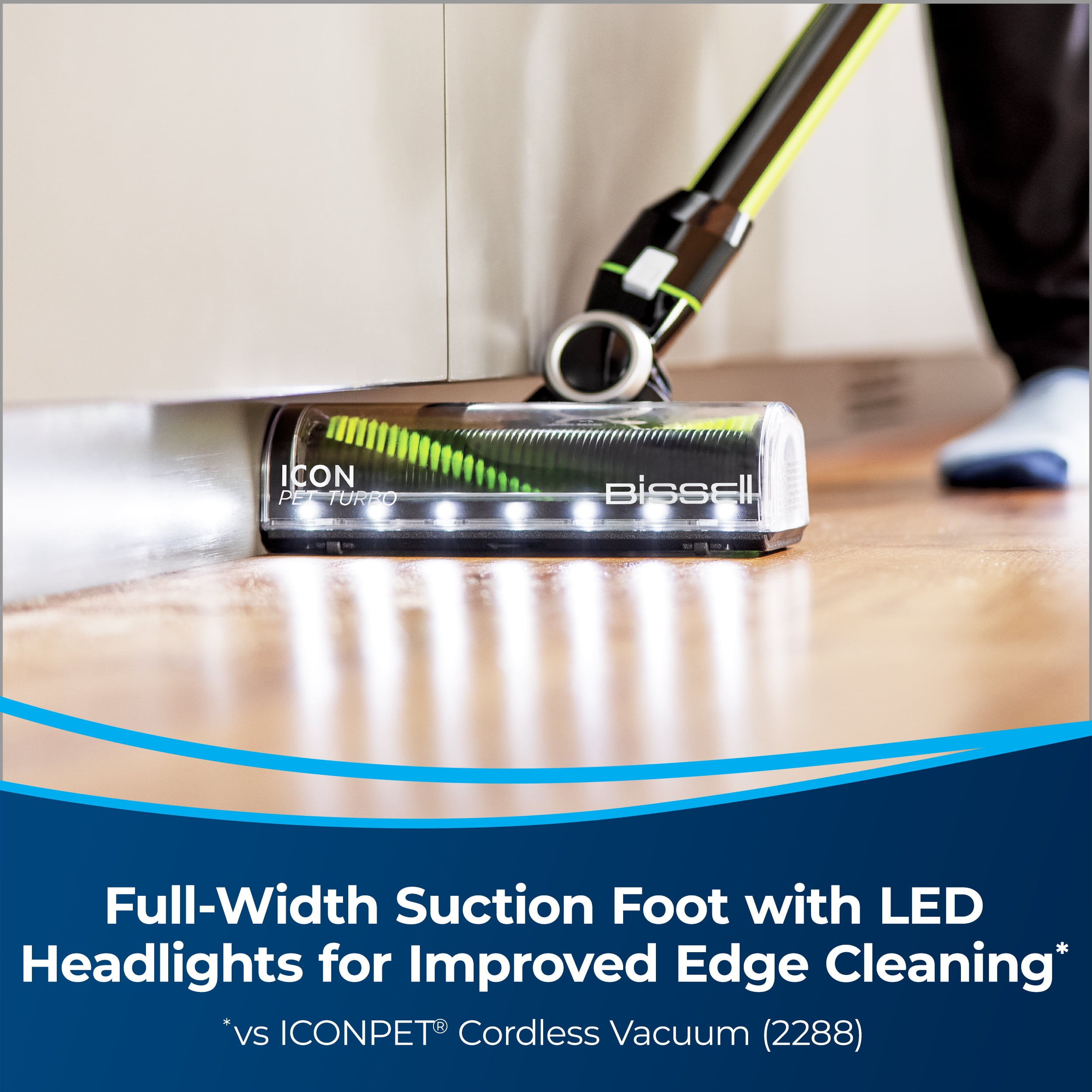 Every Purchase Saves Pets™. BISSELL proudly supports BISSELL Pet Foundation® and its mission to help save homeless pets. Extra Powerful & Lightweight Cleaning for Limitless Surfaces in Your Home. Enjoy versatile and effective cleaning in a vacuum that weighs less than 8 pounds. 3X More Powerful Suction. Engineered with Turbo Boost Mode, a high-performance digital motor and 25V lithium-ion battery. Full-Width suction foot with LED lights for improved edge cleaning. Actively Prevents Hair Wrap. Tangle-Free Brush Roll lets you vacuum pet hair anywhere without having to worry about removing hair from the brush roll when you’re done cleaning. New & Innovative Parking Brake Feature. Locks the wheels in place, so you can rest the vacuum against the wall. SMARTSEAL® ALLERGEN SYSTEM. Traps fine dust and allergens inside the vacuum so you can breathe easy. Up to 50 Minutes of Run Time**. Varies based on cleaning mode and attachments. Includes Specialized Tools & Storage Solutions. Comes with a LED Crevice + Dusting Brush Tool, LED Motorized TurboBrush Tool, Pet Dusting Brush, Extension Hose, and a wall mount for storage. *vs ICONPET® Cordless Vacuum (2288) **In low mode.