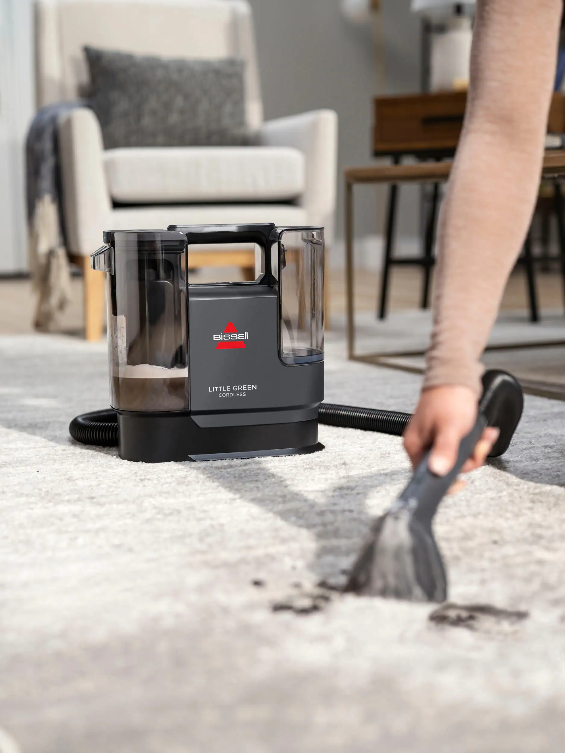 BISSELL Little Green Cordless portable carpet and upholstery deep cleaner combines the ultimate in cordless cleaning freedom with the power of a corded machine. Loosen, lift, and remove tough stains with the powerful 165W motor and the cordless convenience of a lithium-ion battery. With two cleaning modes, Little Green Cordless machine offers customized cleaning with up to 35 minutes of run time. Easily clean tough kid, pet and everyday life messes on upholstery, carpet, patio furniture, car interiors and everything in between. BISSELL proudly supports BISSELL Pet Foundation and its mission to help save homeless pets. When you buy a BISSELL product, you help save pets, too. We’re proud to design products that help make pet messes, odors and pet homelessness disappear.
