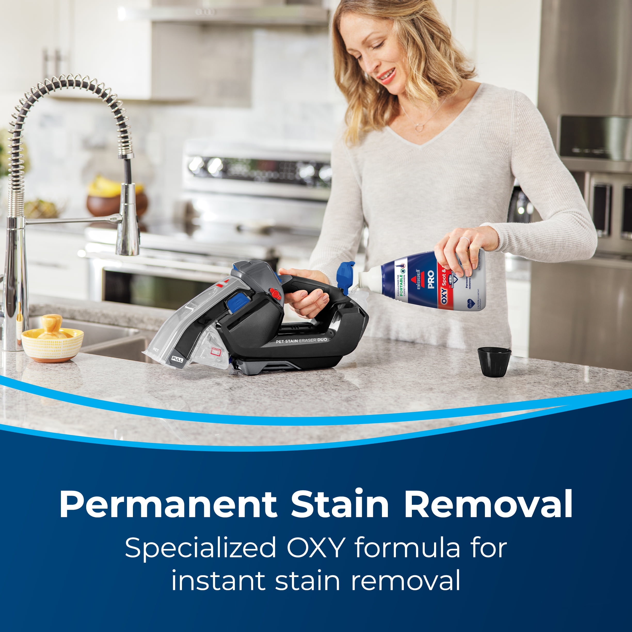 BISSELL Pet Stain Eraser Duo is a cordless portable deep cleaner plus hand vacuum that’s ready to tackle tough pet messes whenever and wherever. cordless convenience to remove pet and household messes like dirt, spills, accidents and hair from carpets, upholstery, stairs, auto interiors, and more. Spray, scrub, and suction away tough pet stains with the powerful combination of the deep cleaner attachment and instant stain removal of BISSELL PRO OXY Spot and Stain formula. In addition, the hand vacuum makes cleaning up dry messes like pet food a breeze when accidents happen. Unlike other spot cleaners, this machine cleans both wet and dry messes, keeping them separate for easy clean-up after the job is done. Plus, you can store the ready-to-use formula in the tank when it’s not in use. BISSELL proudly supports BISSELL Pet Foundation and its mission to help save homeless pets. When you buy a BISSELL product, you help save pets, too. We’re proud to design products that help make pet messes, odors and pet homelessness s disappear.