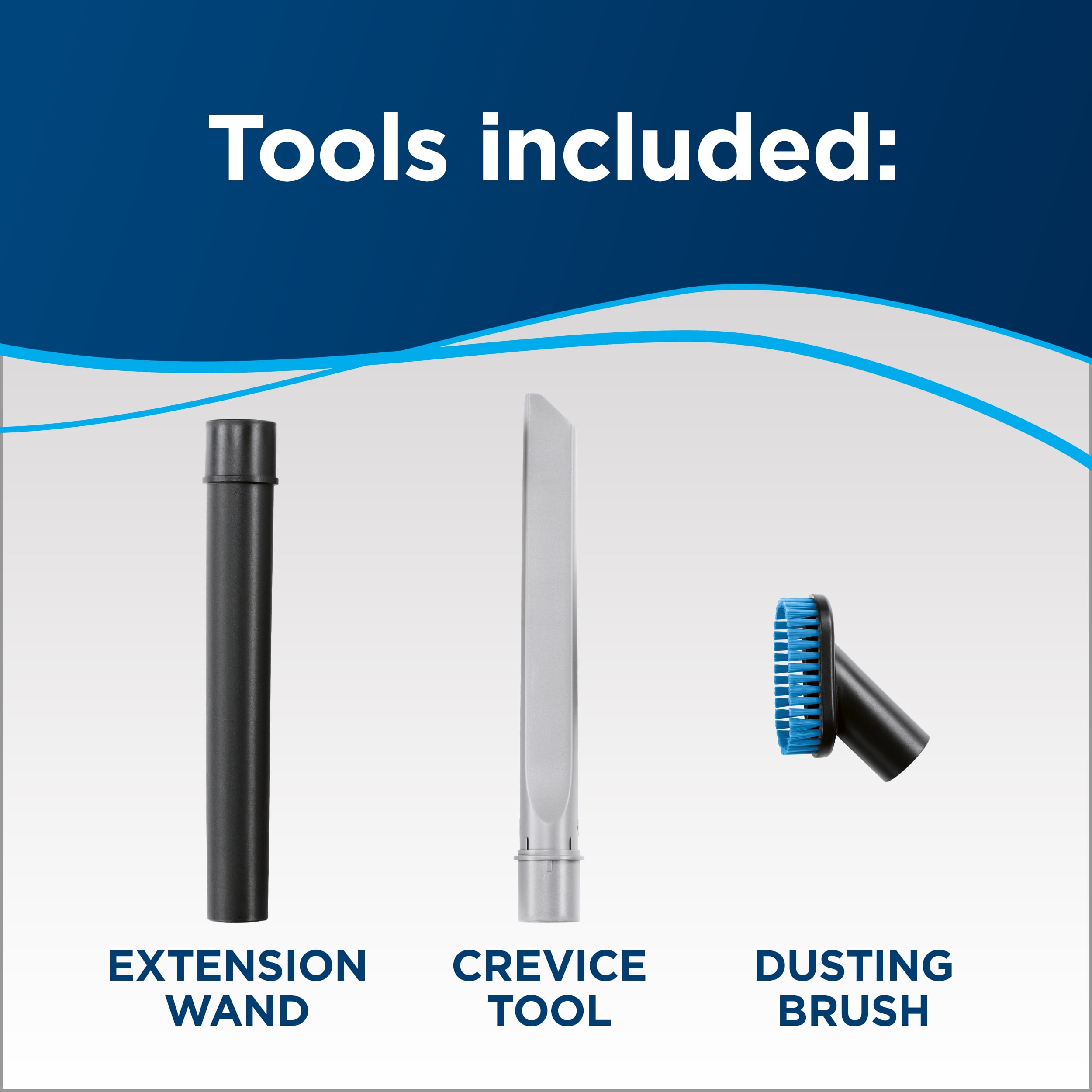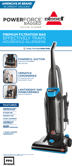 Maintain a clean and tidy home with the help of the BISSELL Power Force Bagged Upright Vacuum 1739. It captures dirt, dust, and other particles and allergens with a one-step filtration system and collects them in a Febreze bag to reduce odors. Multiple attachments are included with this bagged vacuum cleaner, such as a crevice tool for between cushions and other tight spaces and an extension wand for a longer reach or less bending down. On-board storage offers a convenient place to keep these accessories. Choose from five height settings to clean both carpeted and hard floors and experience efficient performance with the 13″-wide cleaning path. The BISSELL Power Force upright vacuum is also equipped with a flexible, stretching hose and a power cord over 20′ in length for a greater range of movement. The Power Force® Bagged Vacuum includes premium allergen filtration bags for mess-free disposal. The powerful suction removes embedded dirt and hair. When the bag gets full, just remove it from the vacuum and throw it away Febreze and the Febreze logo are trademarks of the Procter & Gamble Company, Cincinnati, Ohio used under license by BISSELL Homecare, Inc.