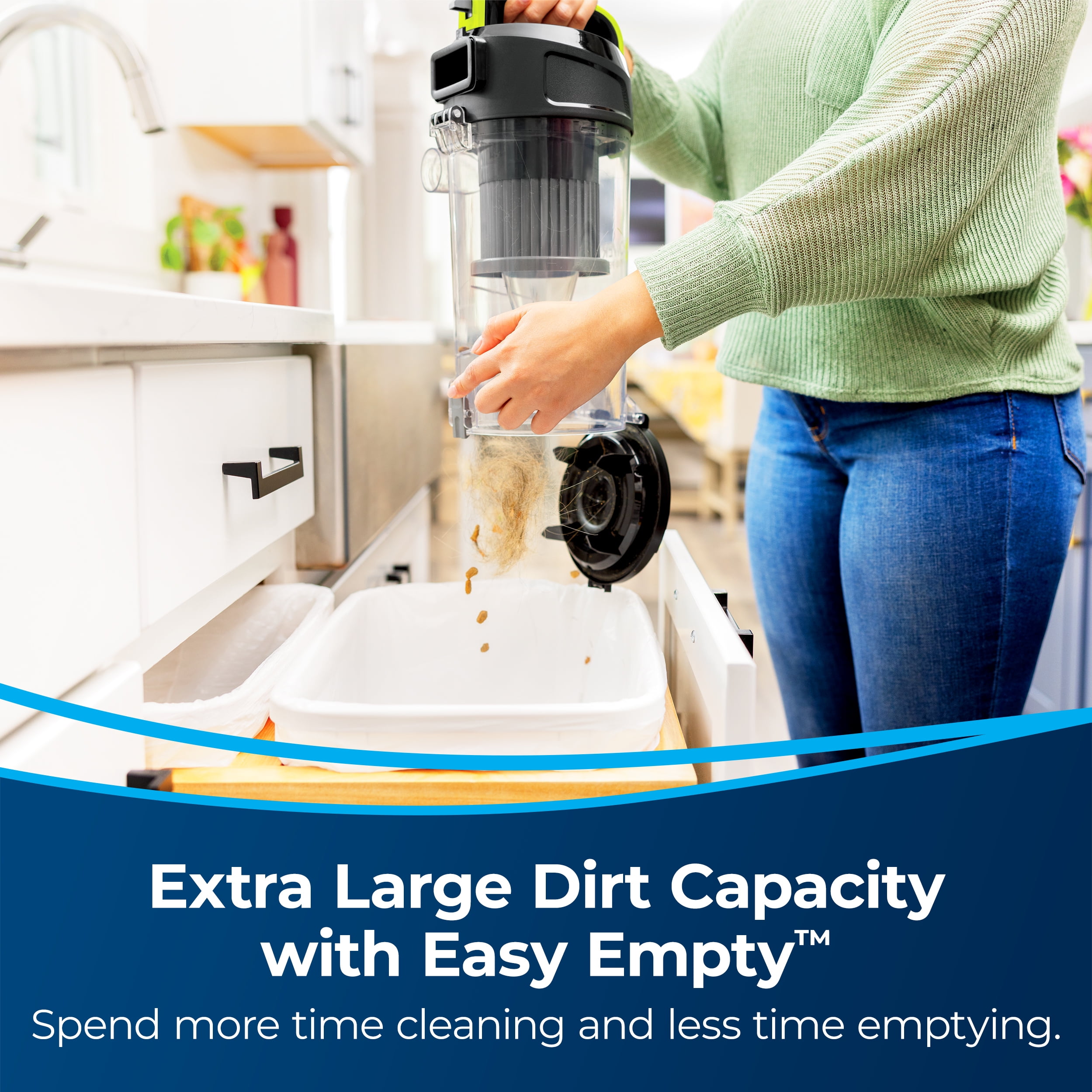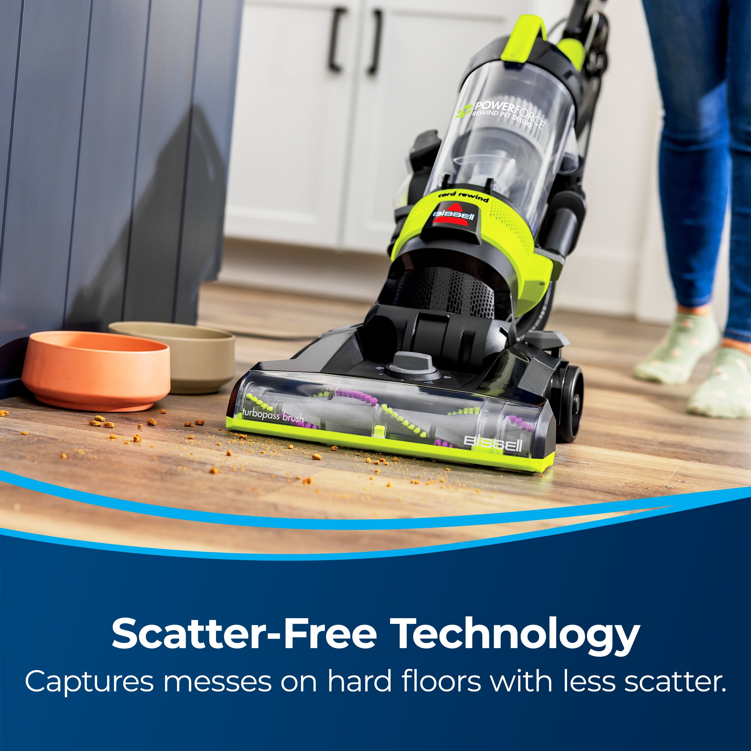 Every Purchase Saves Pets™. BISSELL proudly supports BISSELL Pet Foundation® and its mission to help save homeless pets. Scatter-Free Technology. Captures messes on hard floors with less debris scatter. Active Extension Wand. Clean above floors and hard-to-reach areas in one easy step, with up to 10 ft reach. Extra Large Dirt Capacity with Easy Empty™ Dirt Tank. Enjoy an easy and mess-free empty and more time cleaning with a large capacity dirt tank. Powerful Pet Hair Pickup. Powerful and convenient cleaning in one machine for pet hair pickup. Automatic Cord Rewind. Rewind the cord with the press of a button for quick and easy storage.