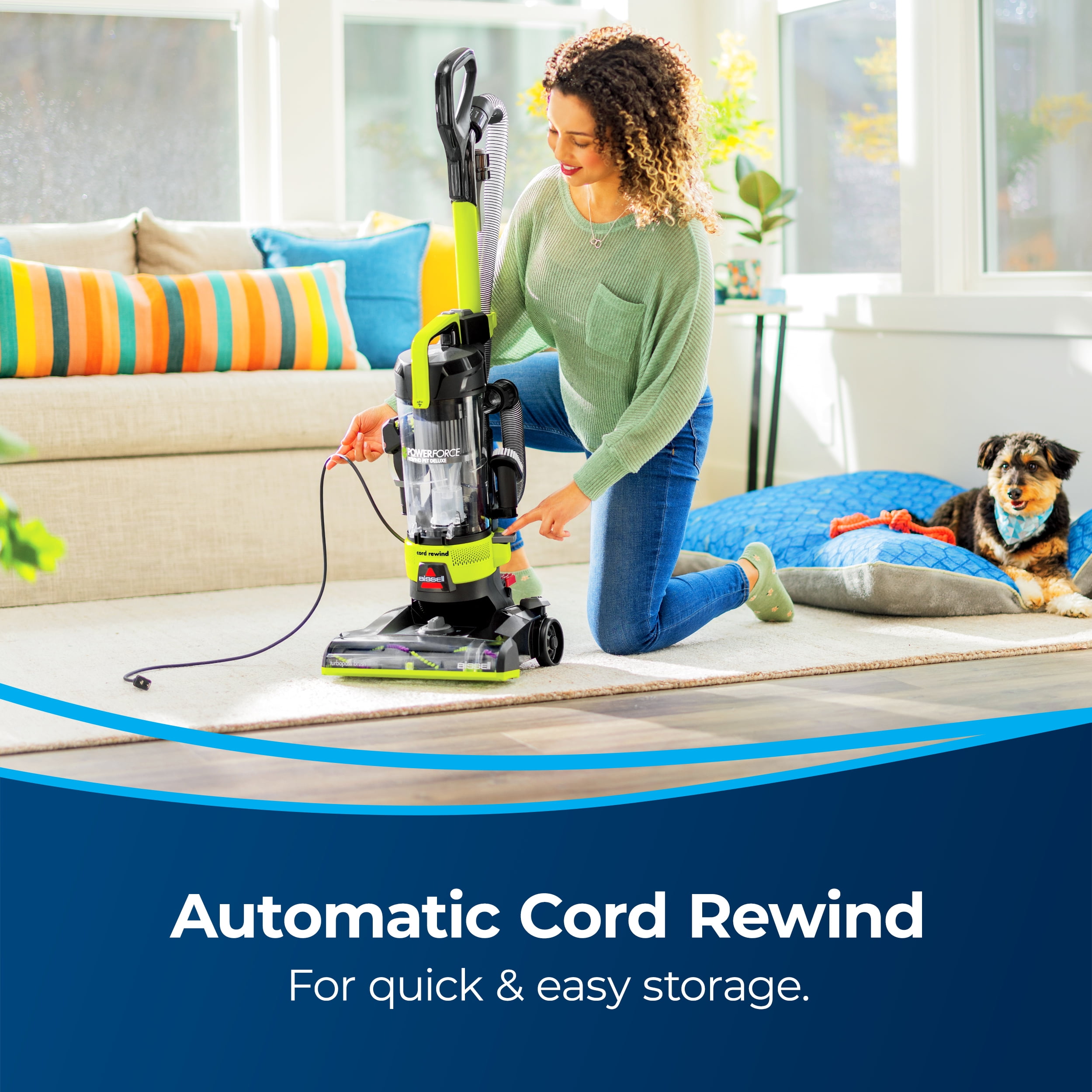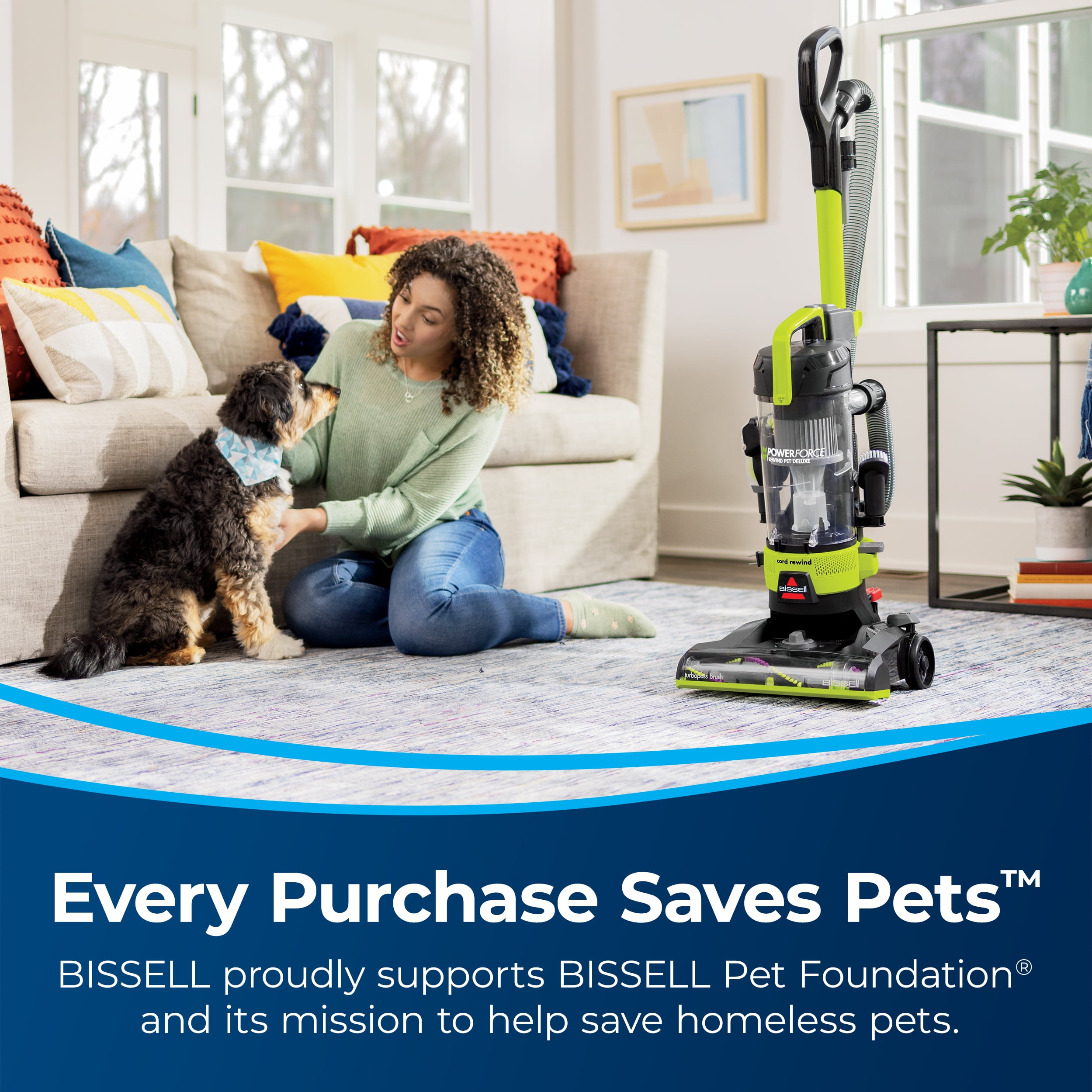 BISSELL® PowerForce® Rewind Pet Deluxe upright vacuum is lightweight, maneuverable and the perfect companion for cleaning debris and pet hair. Clean upholstery, stairs and hard-to-reach areas around your home with the included convenient tools, like the specialized Pet TurboBrush® Tool, Dusting Brush, Extension Wand, and Crevice Tool. With an Active Extension Wand, you can clean above floors and hard-to-reach spaces in one easy step. PowerForce® Rewind Pet Deluxe upright vacuum also features washable filters, so you don’t have to replace them as often. When the cleaning is done, rewind the cord with the press of a button for easy storage. Plus, this vacuum doesn’t just clean up after pets, it helps save them! BISSELL proudly supports BISSELL Pet Foundation® and its mission to help save homeless pets. When you buy a BISSELL® product, you help save pets, too. We’re proud to design products that help make pet messes, odors and pet homelessness disappear.