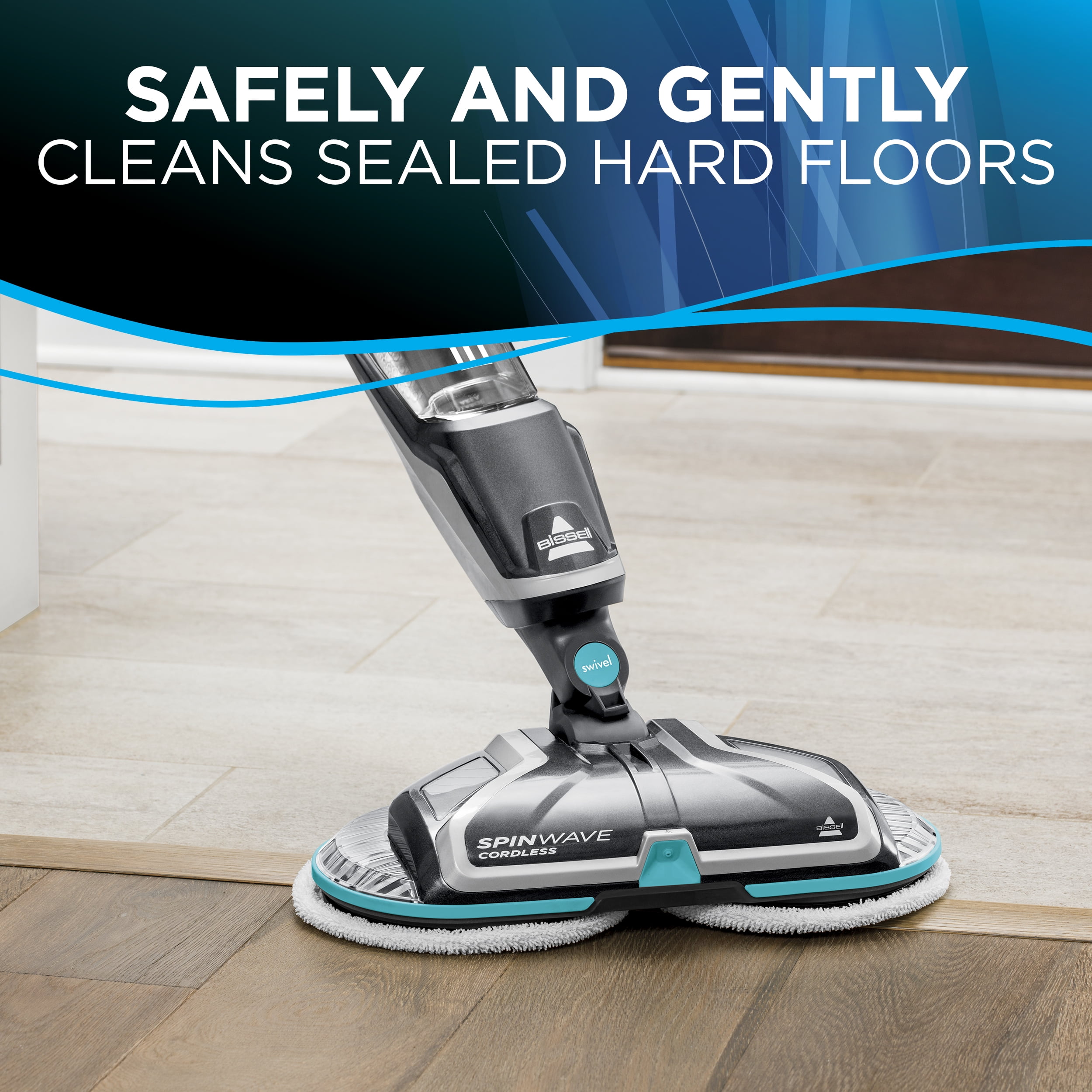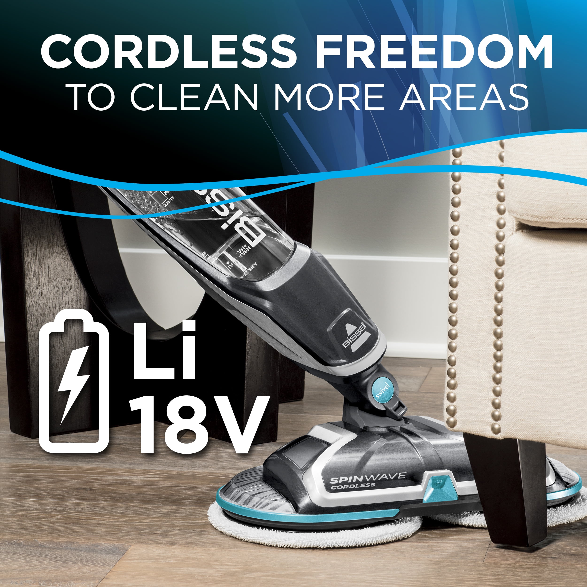 BISSELL Spin Wave Cordless, 2315A: Powerful hard floor spin mop reduces cleaning efforts by scrubbing floors for you Enjoy the convenience of cordless freedom to clean more areas in your home 18v lithium-ion battery provides cordless cleaning for up to 20 minutes The on-demand spray allows you to control the amount of solution you put on your floors Gently and safely clean your sealed hard floors The integrated carry handle makes it easier to carry this lightweight machine from room to room The included storage tray helps align mop pads on the foot of the machine and store the machine after use Washable mop pads