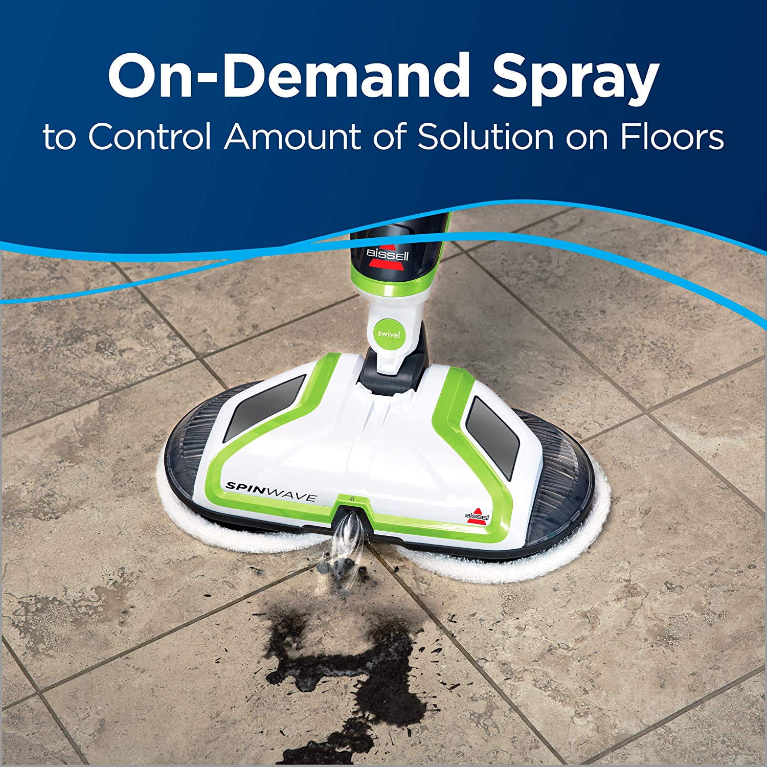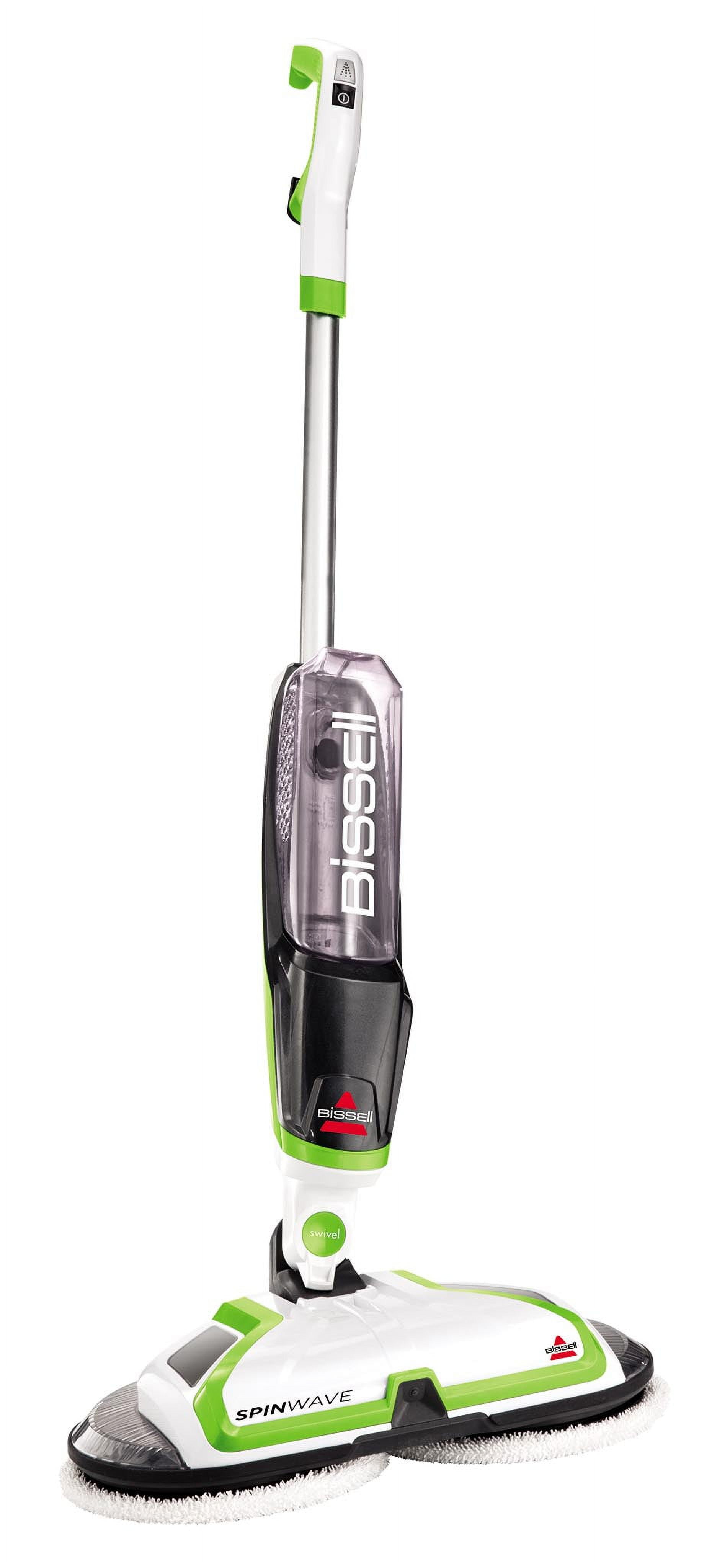 Tired of scrubbing your floors let the Bissell Spinwave powered hard floor mop do it for you. Safe for cleaning sealed, hard-surface floors like tile, linoleum, vinyl flooring, and hardwood floors, this versatile machine comes with a set of soft-touch cleaning pads for everyday cleaning and scrubby pads for tough, sticky messes. Power spin pads reduce cleaning effort while giving you a hands-and-knees clean. Bissell Spinwave is also equipped with on-demand spray that allows you to dispense just the right amount of Multi-Surface solution onto your floors. In addition, swivel steering makes it easy to maneuver around and under furniture.