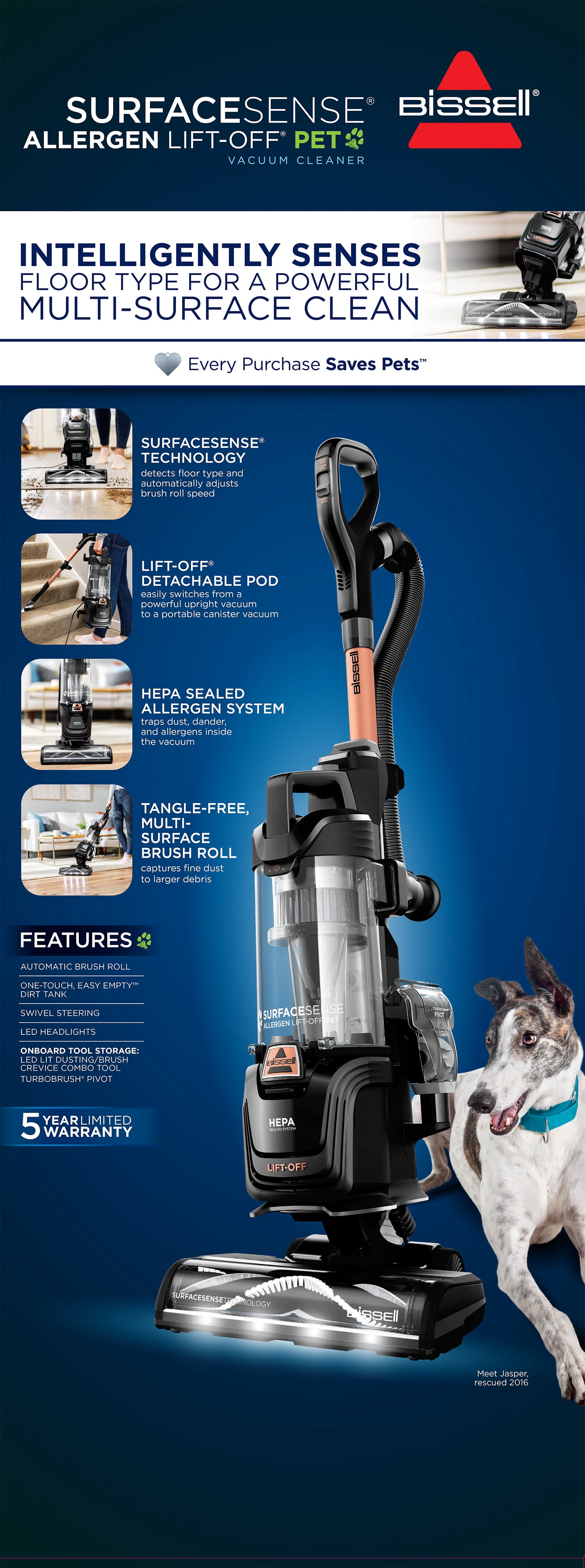 SurfaceSense® Technology. Automatically transition from carpets to hard surfaces. Lift-Off® Detachable Pod. Easily switches from a powerful upright vacuum to a detachable, portable canister vacuum. Sealed HEPA Allergen System. Helps capture and hold dust and allergens1 inside the vacuum so they don’t escape back into the air you breathe. May be helpful for pet owners and allergy sufferers. LED Headlights. Illuminate dirt and pet hair wherever it’s hiding. XL Capacity Dirt Tank. No need to clean your vacuum after you use it thanks to the Tangle-Free Brush Roll and a Hands-Free Empty Dirt Tank that empties with the push of a button. Swivel Steering. Make vacuuming around furniture a breeze.