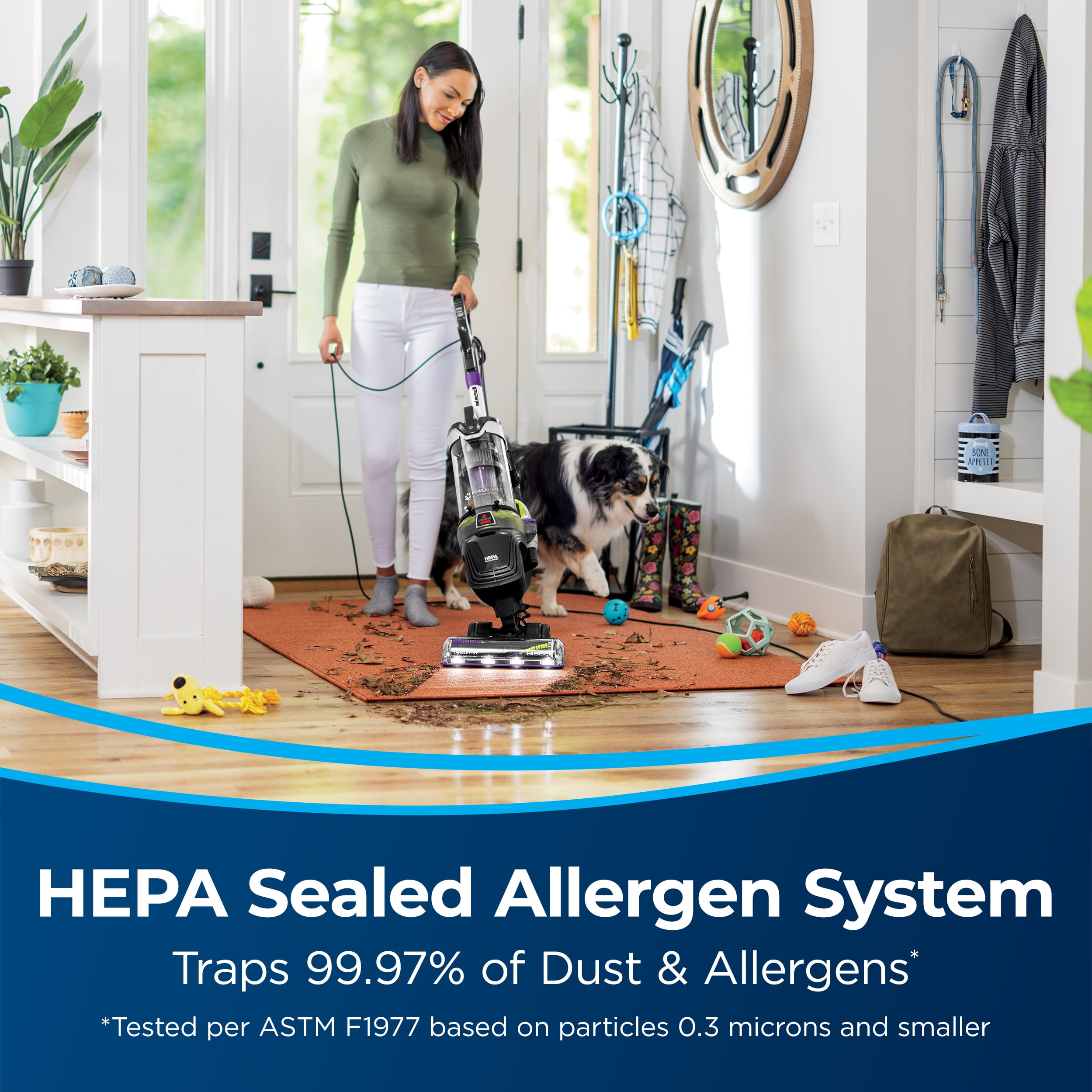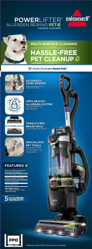 BISSELL® PowerLifter™ Allergen Pet Rewind Vacum is designed with pet parents in mind. Tackling difficult pet messes is easier than ever with its lightweight design, powerful suction, and swivel steering. Your air stays cleaner with our HEPA Sealed Allergen System. Clean from room to room without having to unplug as often with the flexibility of a 25-foot power cord. When you’re done, the cord rewind button lets you easily store the cord in seconds. BISSELL proudly supports BISSELL Pet Foundation® and its mission to help save homeless pets. When you buy a BISSELL® product, you help save pets, too. We’re proud to design products that help make pet messes, odors and pet homelessness disappear.