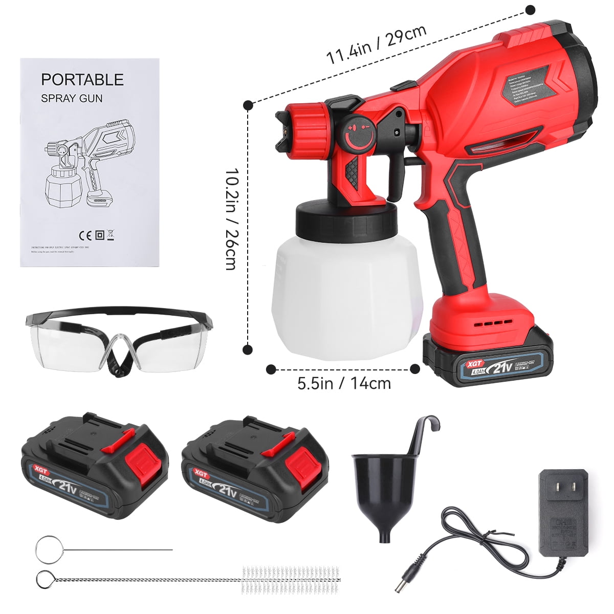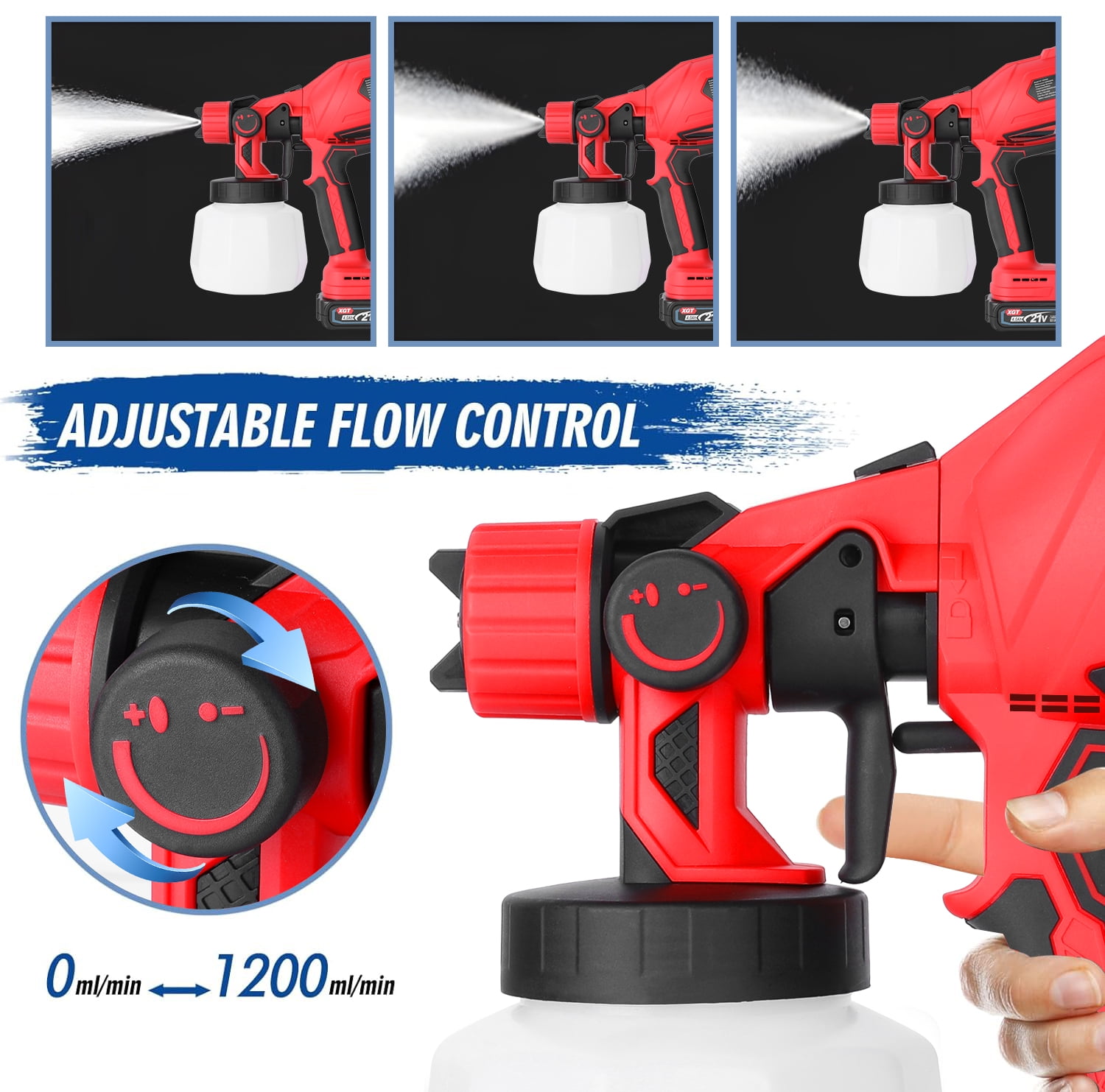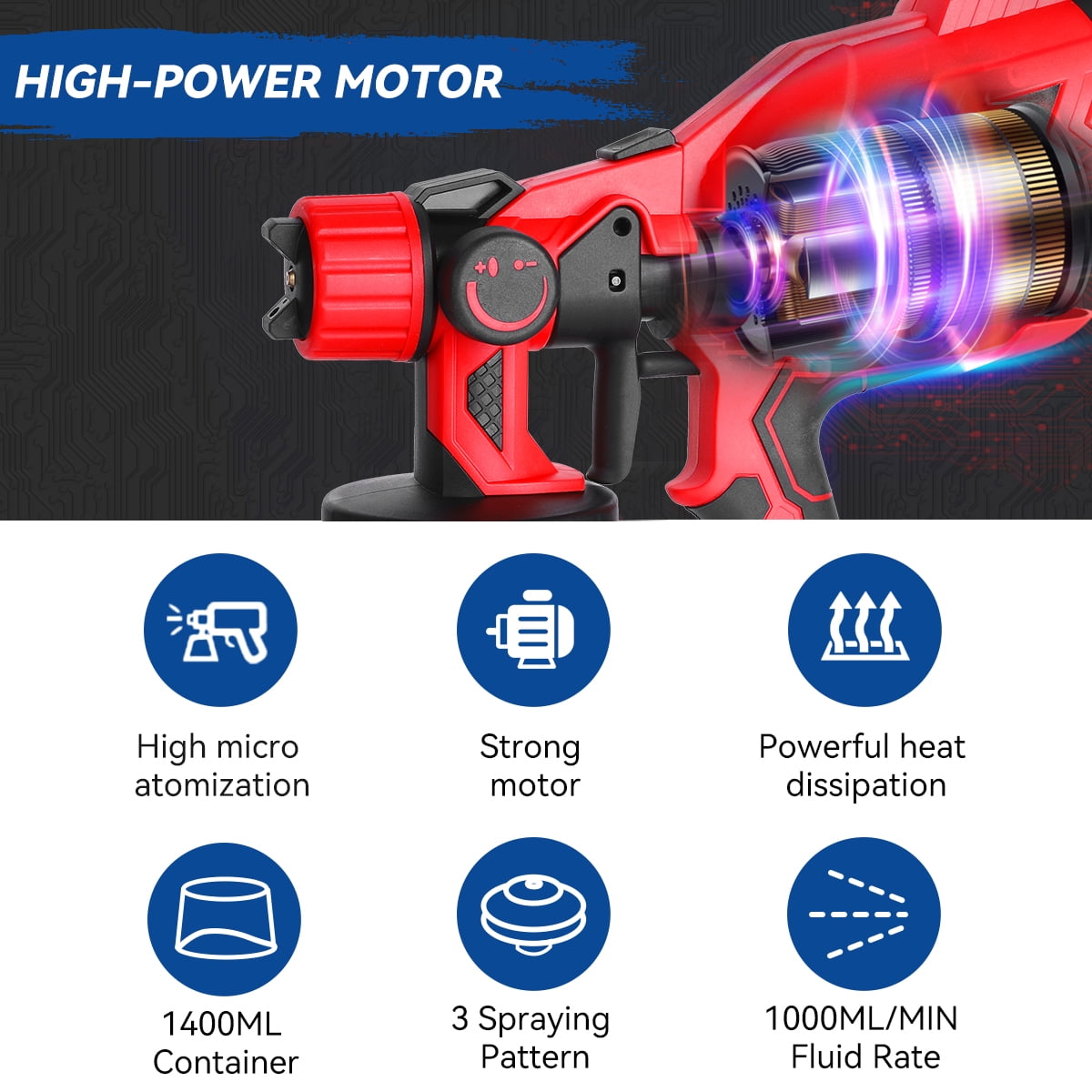 Description: This BIUBLE paint gun uses HVLP technology.HVLP paint sprayer ejects higher-volume airflow with lower pressure, finely atomizing the paint and significantly reducing over-spray, dripping, and paint waste. It delivers a much finer finish than a paintbrush and roller, and it is highly suitable for home, garden & DIY projects on cars, doors, decks, fences, ceilings, furniture, wall siding, and artwork. Type: BIUBLE Cordless Paint Sprayer Material: Nylon + Powder Metallurgy + Plastic Power Supply: Rechargeable 24V Lithium Battery Battery Capacity: 2000mAh Fit the nozzle:∮1.0mm,∮1.8mm,∮2.5mm(0.8mm,1.2mm) Power: 800W Frequency: 50/60Hz Pot Capacity: 1400ml Rated Speed: 18000rpm Air Flow: 1200ml/Min Paint Flow: 0-1200ml/min Fluid Rate: 1000ml/min Optimal Spraying Distance: 15-30cm / 5.9-11.81inch Max. Viscosity: <=100din Battery Quantity: 2