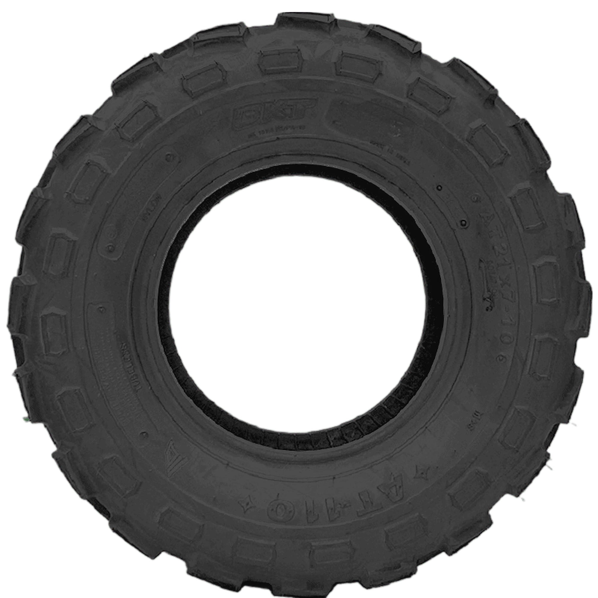 BKT AT 110 21X8.00-9 22F B OVERVIEW Designed for ATV and UTVs, the BKT AT110 is an all-terrain tire with a pattern of extended, angled, hollowed-out knobs for excellent traction and control on hard or soft surfaces. The AT110 features a reinforced casing for rough terrain and a high void ratio for good self-cleaning of mud and debris.