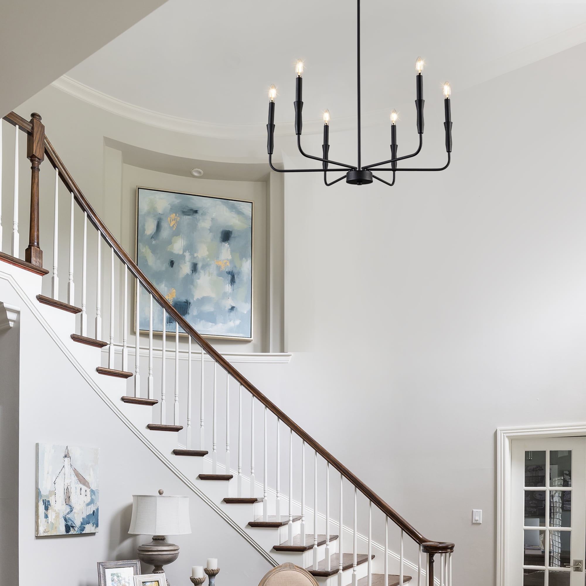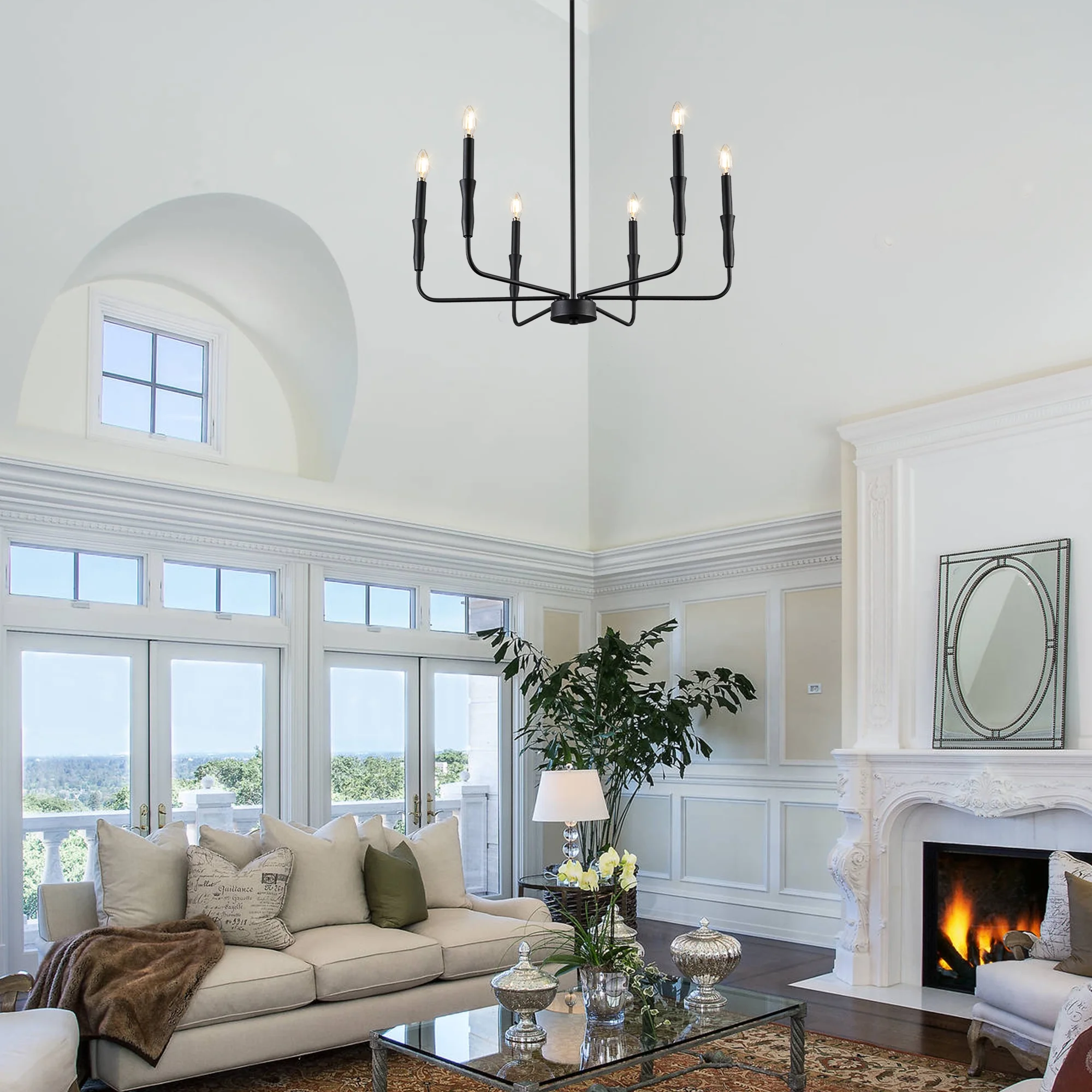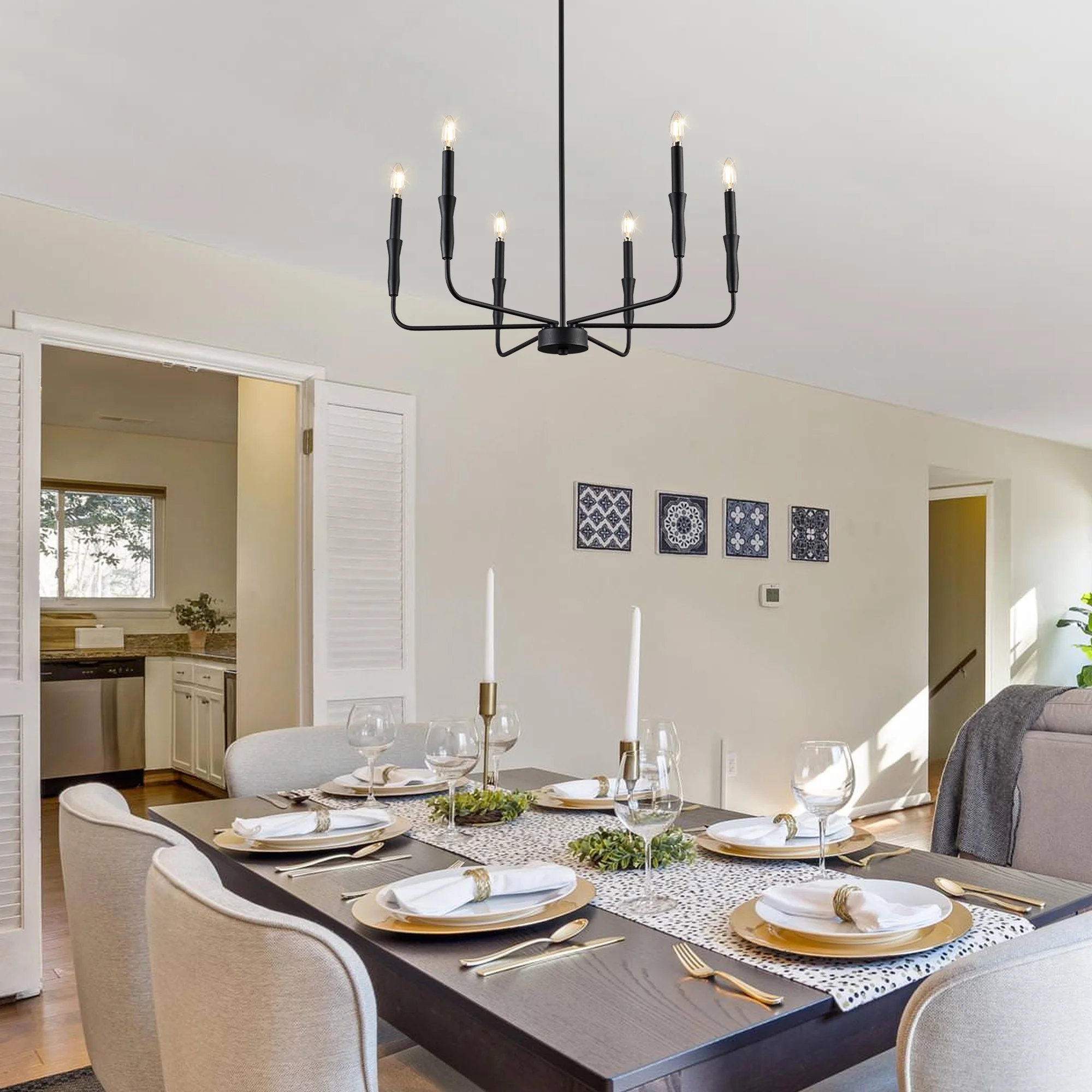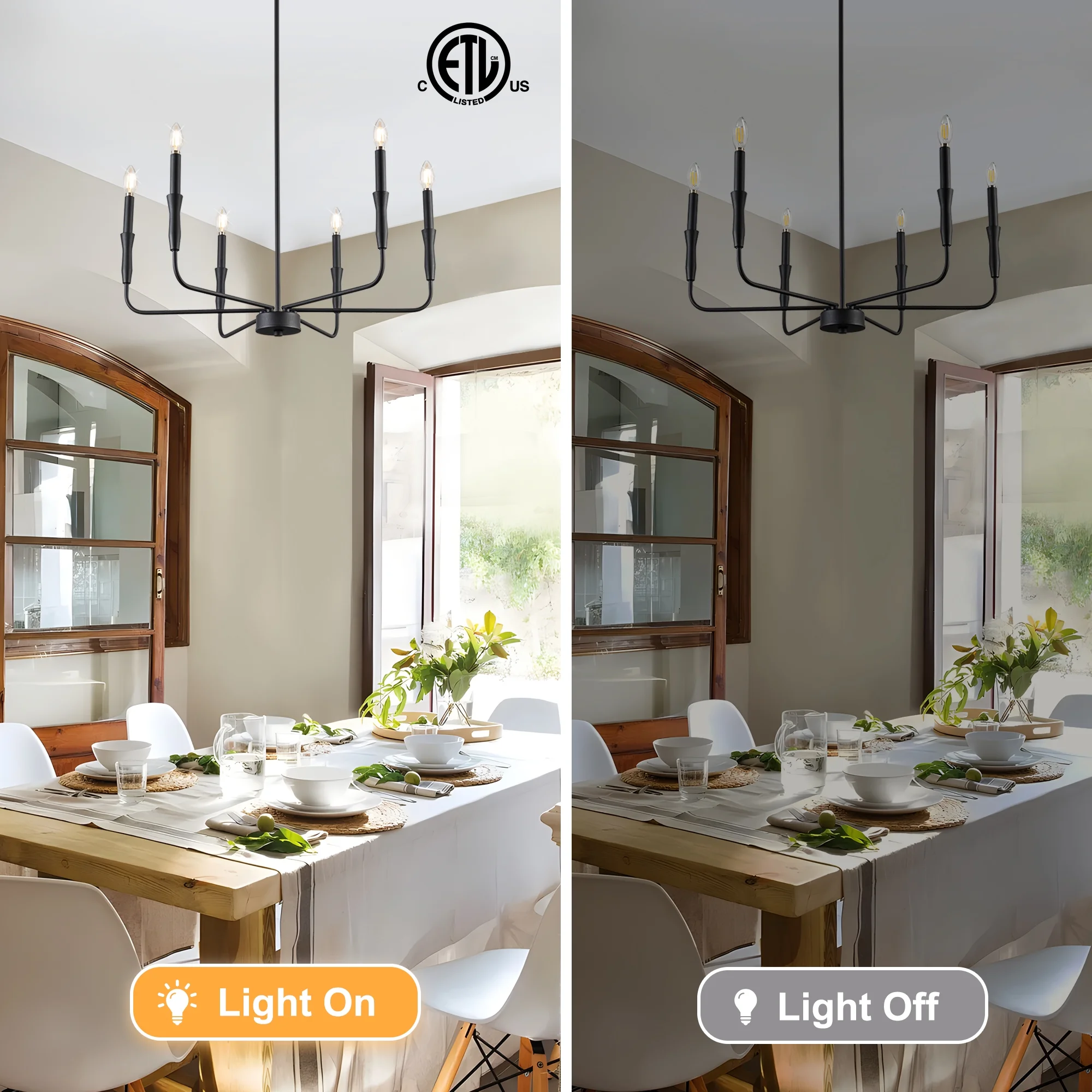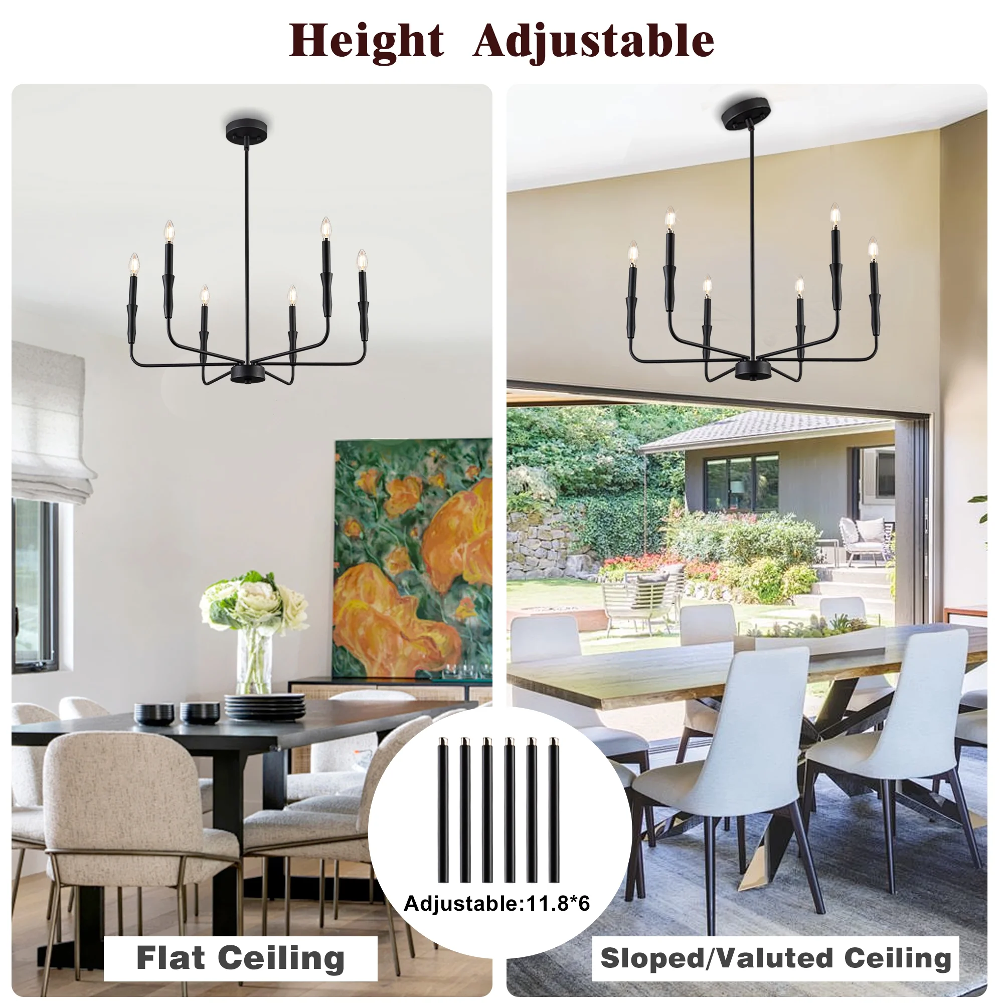 This Uznhty modern chandelier consists of 6 arms shaped like candlesticks, the arm material is made of strong and durable metal material The surface of the farmhouse pendant light is made of frosted black lacquer spraying process, the overall style is classic and simple, add different beauty to your home, the chandelier lighting fixture suitable for dining room, bedroom, living room, corridor, hallway, restaurant, staircase. This dining room light features 6 E12 lamp heads (bulbs not included), is ETL certified, has a maximum wattage of 40W, and is fully dimmable when used with a dimmable bulb and a compatible dimmer switch. With a maximum height of 73 inches and a minimum height of 14 inches, this ceiling light for dining room offers a 70.8-inch removable lamp so you can determine the hanging height as needed. The installation of the dining room chandelier is simple and can be done with either a slanted or flat ceiling.