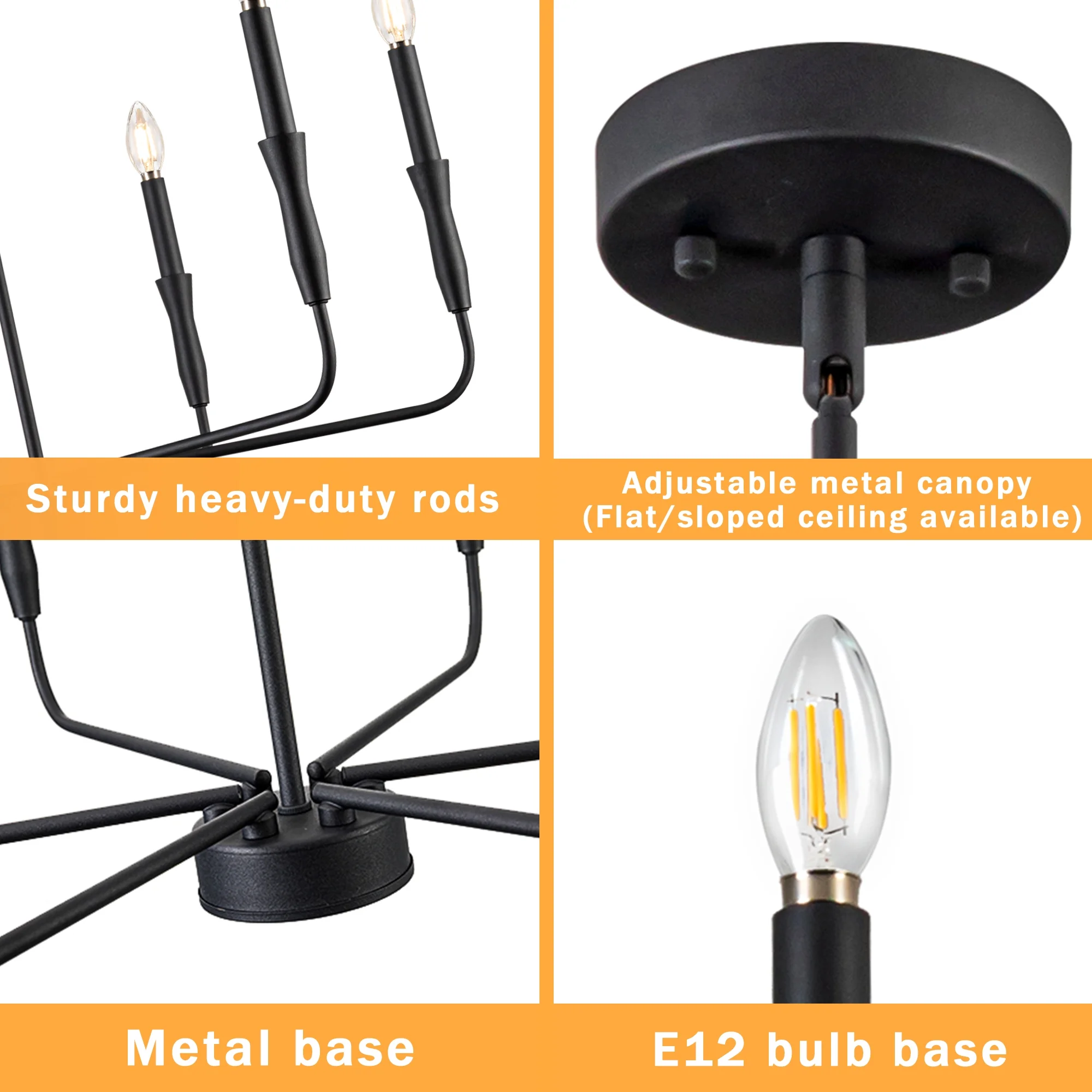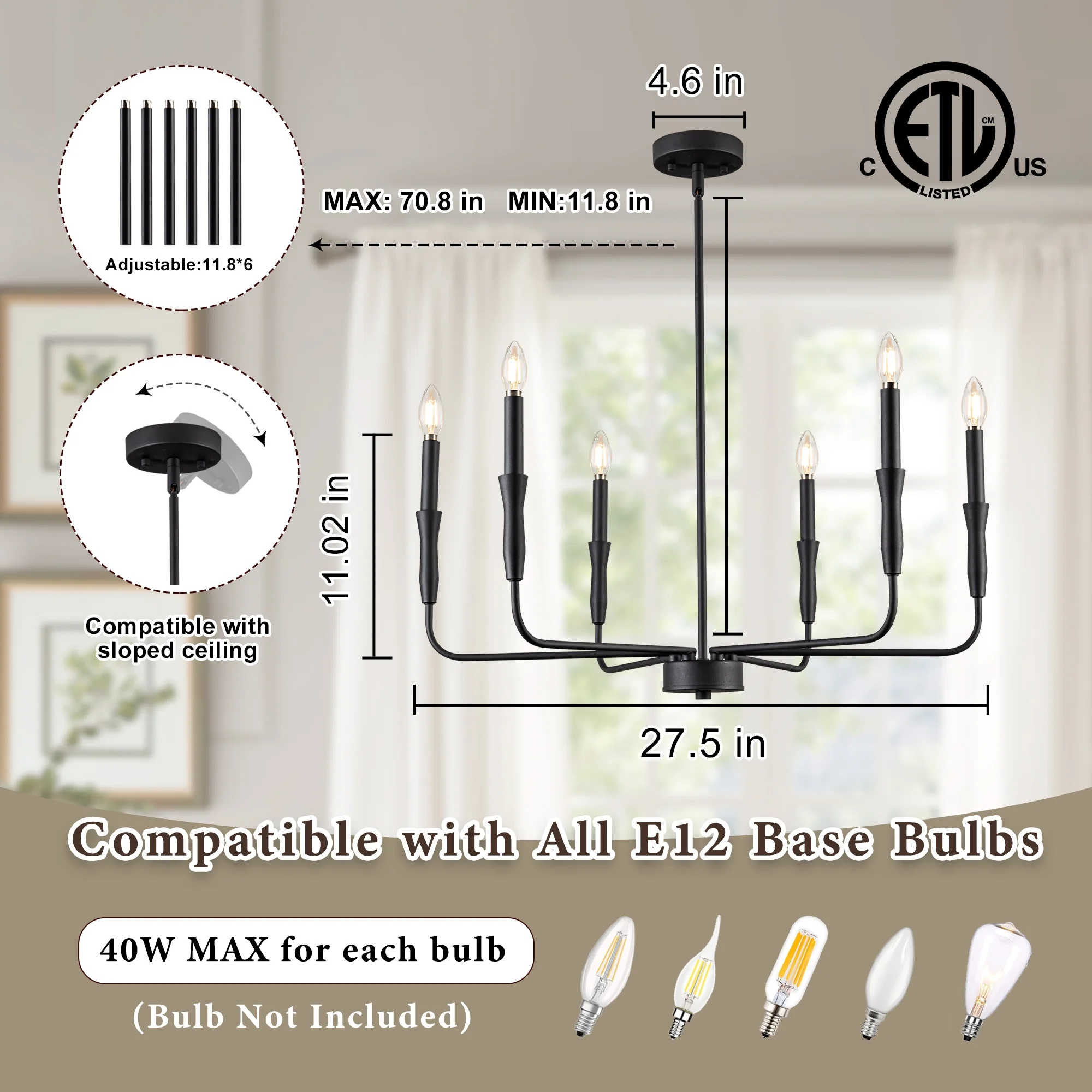 Frosted black paint spraying process, classic and simple style. Adjustable Height: maximum height is 70.8 inches and the minimum height is 15 inches. Suitable for flat or sloping ceilings. Come with 6 E12 standard bases,max 40W (bulbs not included). ETL Certification: safe and reliable. Simple installation: all internal wiring is done, just tighten the light pole