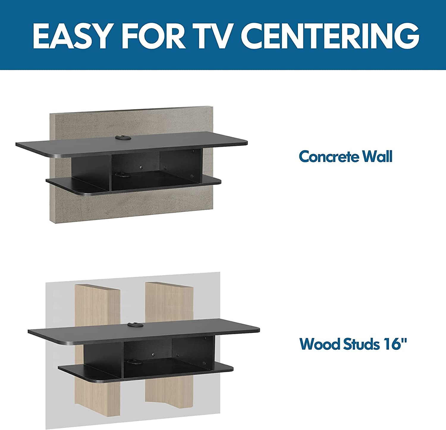 Mounts to the wall creating a floating media storage unit Shelves is perfect for router, set-top box, DVD player, CDs, remote, projector cable box, game console, TV component and decorations. Easy care, robust and clean surface with a soft cloth makes your life more simple and convenience.