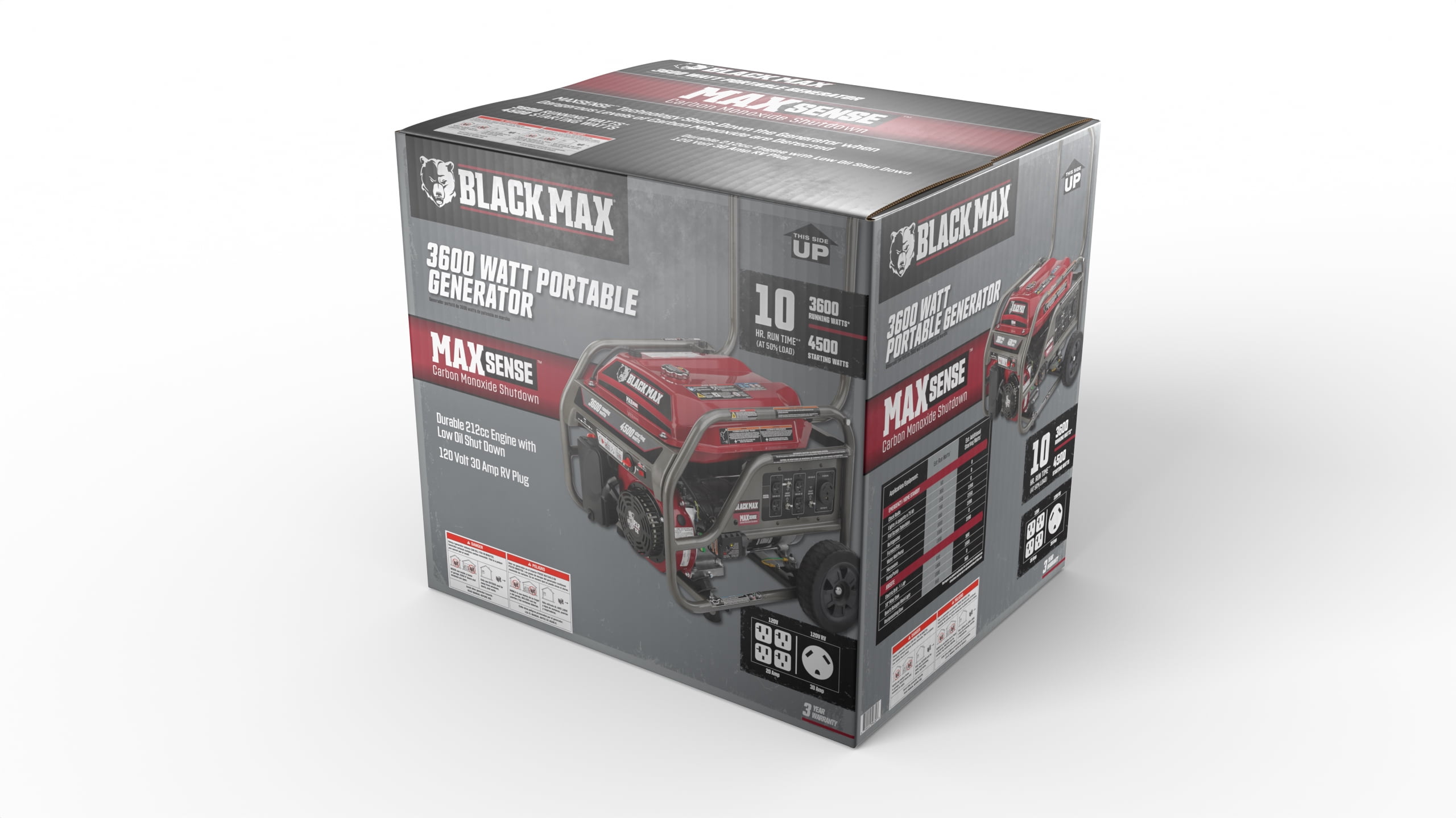 MaxSense CO Sensor Technology PGMA Compliant Black Max 212cc OHV Engine 4 Gallon Metal Fuel Tank Hand Truck Frame Design 10 Hour Runtime @ 50% Load Quick Release Fold-Down Handle Flat Free Wheels Low-Oil Shut Down 50 State compliant Pull Cord Motor Starter TT-30R 120V 30A Outlet