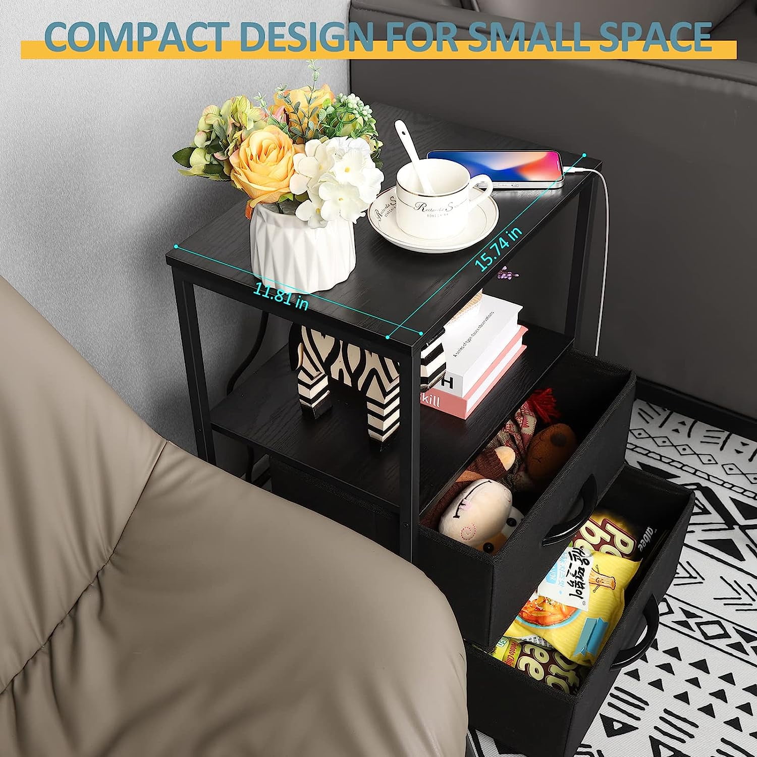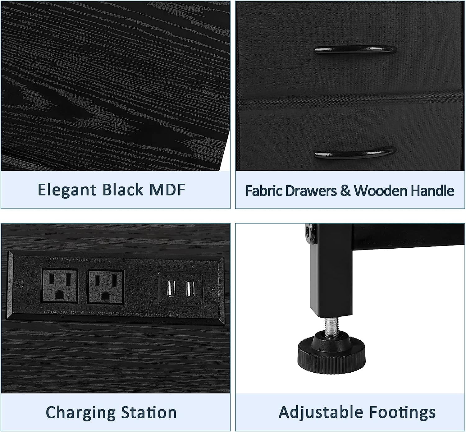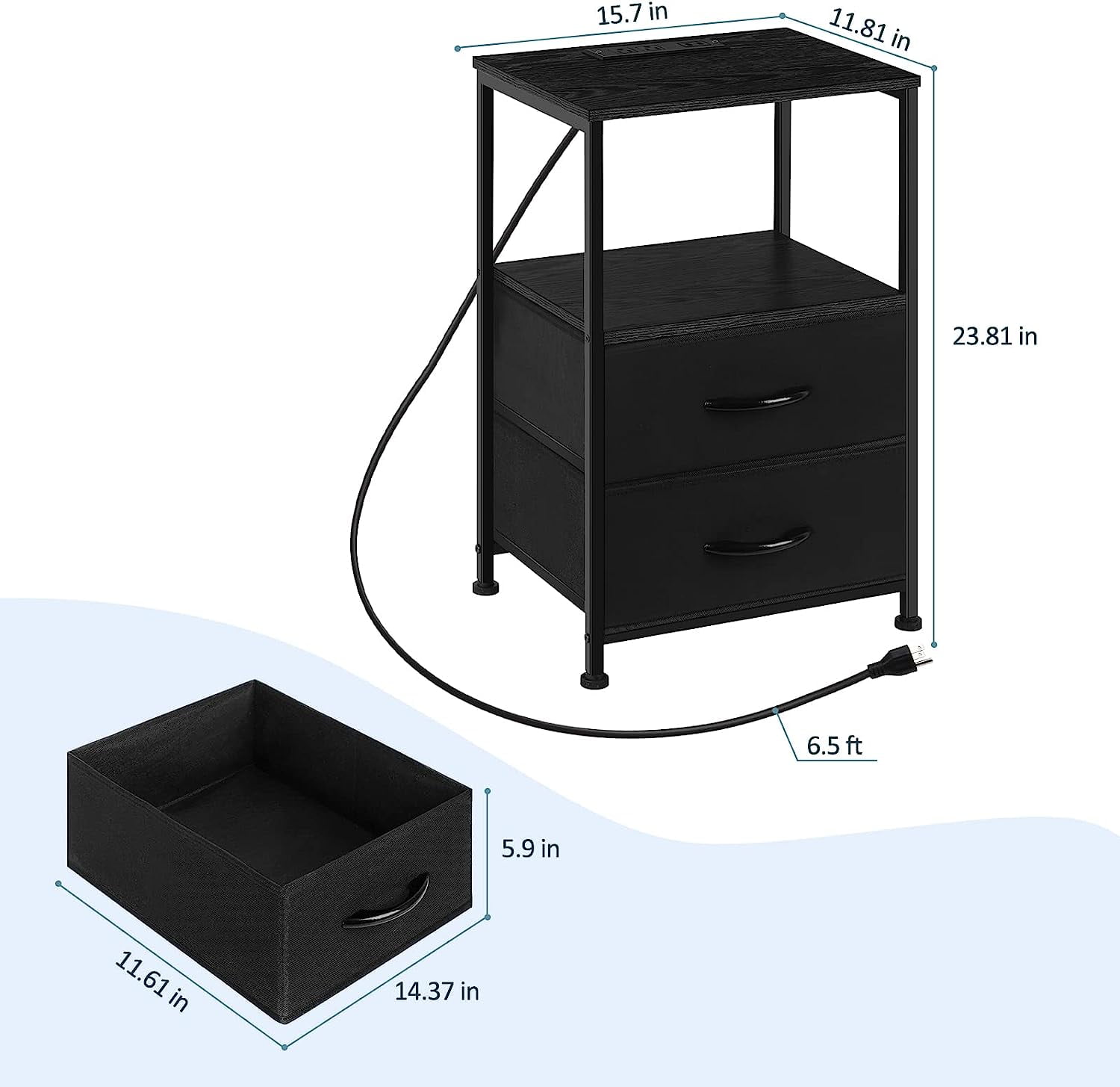 [2 Fabric Drawers] The nightstand with charging station has 2 fabric drawers. The 2 drawers are set on a smooth slide rail, providing a hidden storage space for your items. The handle of drawers is made of wood, which is simple and quiet when pulling. [Practical Charging Nightstand] There is a charging station on the desktop of black bedside table -with 2 USB ports and 2 3-prong outlets. Easily charge and store e-devices such as your phone, iPad. This table is a bedside table, a sofa side table in the living room, and a office side table. It’s suitable for various rooms. [Charming Design] The small end table is made of industrial style black wooden boards, matte black iron frames, and black cloth drawers. All black designed table is fashionable and minimalist. You can add this nightstand with drawers to the rooms – modern, classical, industrial and other styles. [Enough Storage] The desktop provides sufficient space for lamps, alarm clocks, phones and cups. The second layer of wooden board is an open storage space, suitable for books and decorations. Total size of small nightstand is 15.7 x 11.8 x 23.8 inches. Each drawer loads 10 lbs. and wooden board loads 20 lbs.