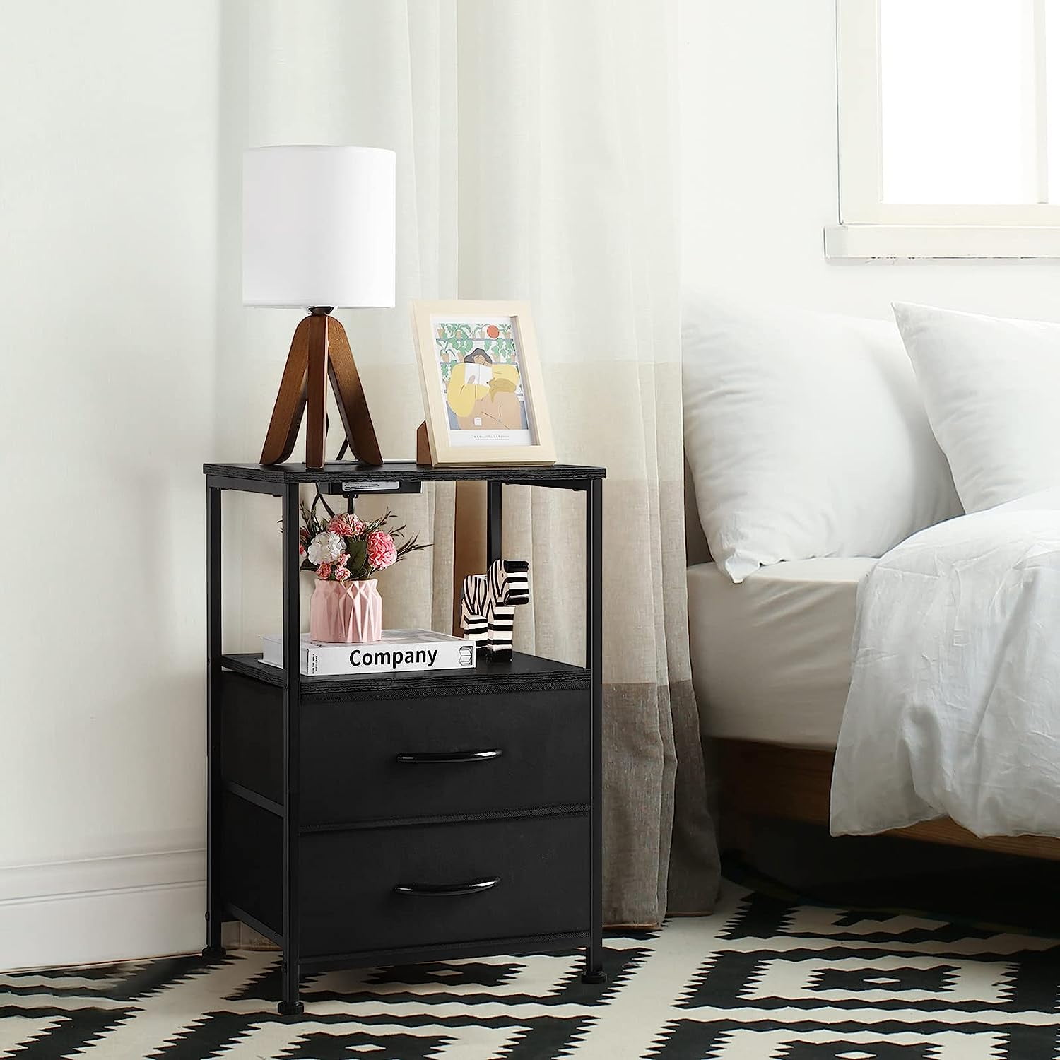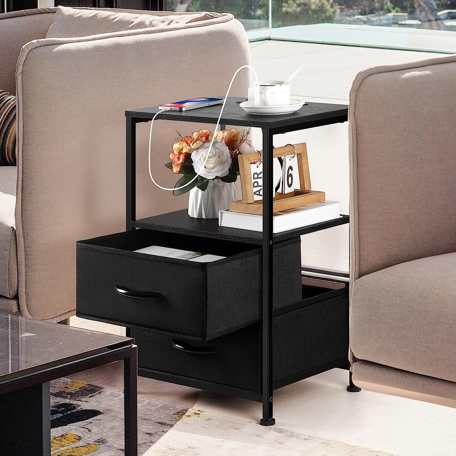 Black Nightstand with 2 Fabric Drawers End Table with Charging Station