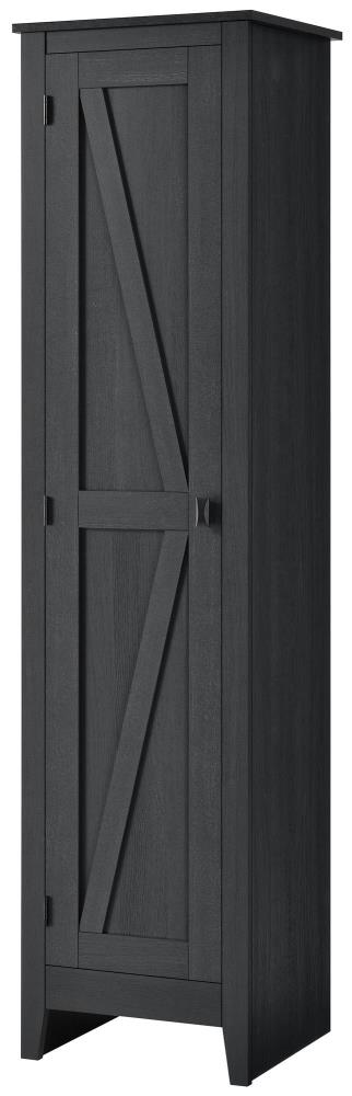 The SystemBuild Winthrop 18 in. Wide Storage Cabinet is a stylish way to stay on top of your organization. The rustic barn style design and sleek tapered feet gives the look of an old weathered cabinet but the sturdy laminated particleboard and MDF make this cabinet the perfect piece to house your home office supplies, extra linens, seasonal clothing, nonperishable food and more! Open up the door to 4 spacious shelves, 2 adjustable, to fit items of differing sizes. The weathered black woodgrain finish will bring a nice rustic appeal to your space. The Winthrop Cabinet is recommended to be assembled and moved by 2 adults. A wall anchor kit is provided for extra safety and security. After assembled, this cabinet measures to be 71.9 in. H x 18.2 in. W x 15.8 in. D.