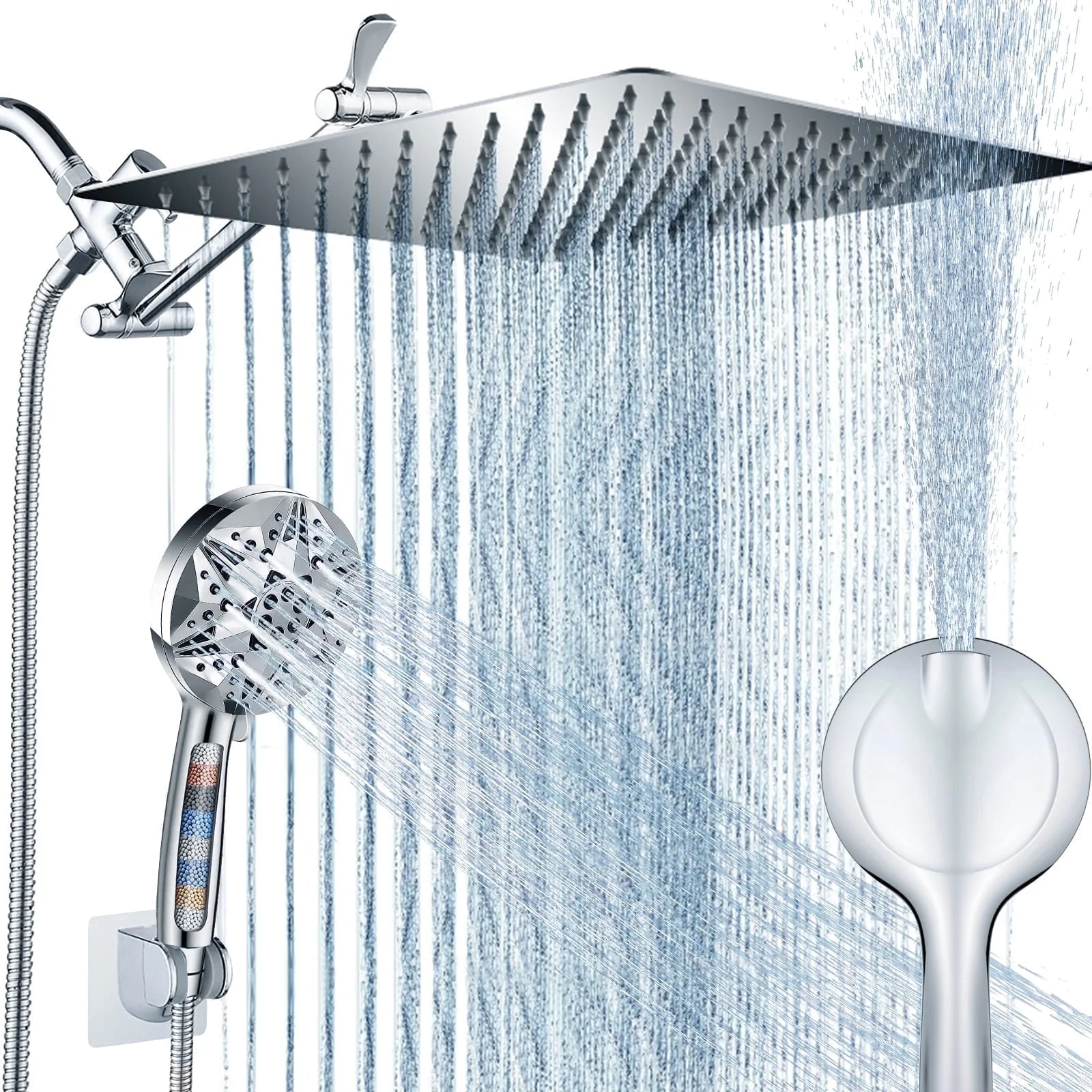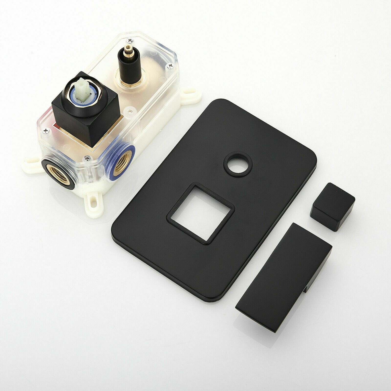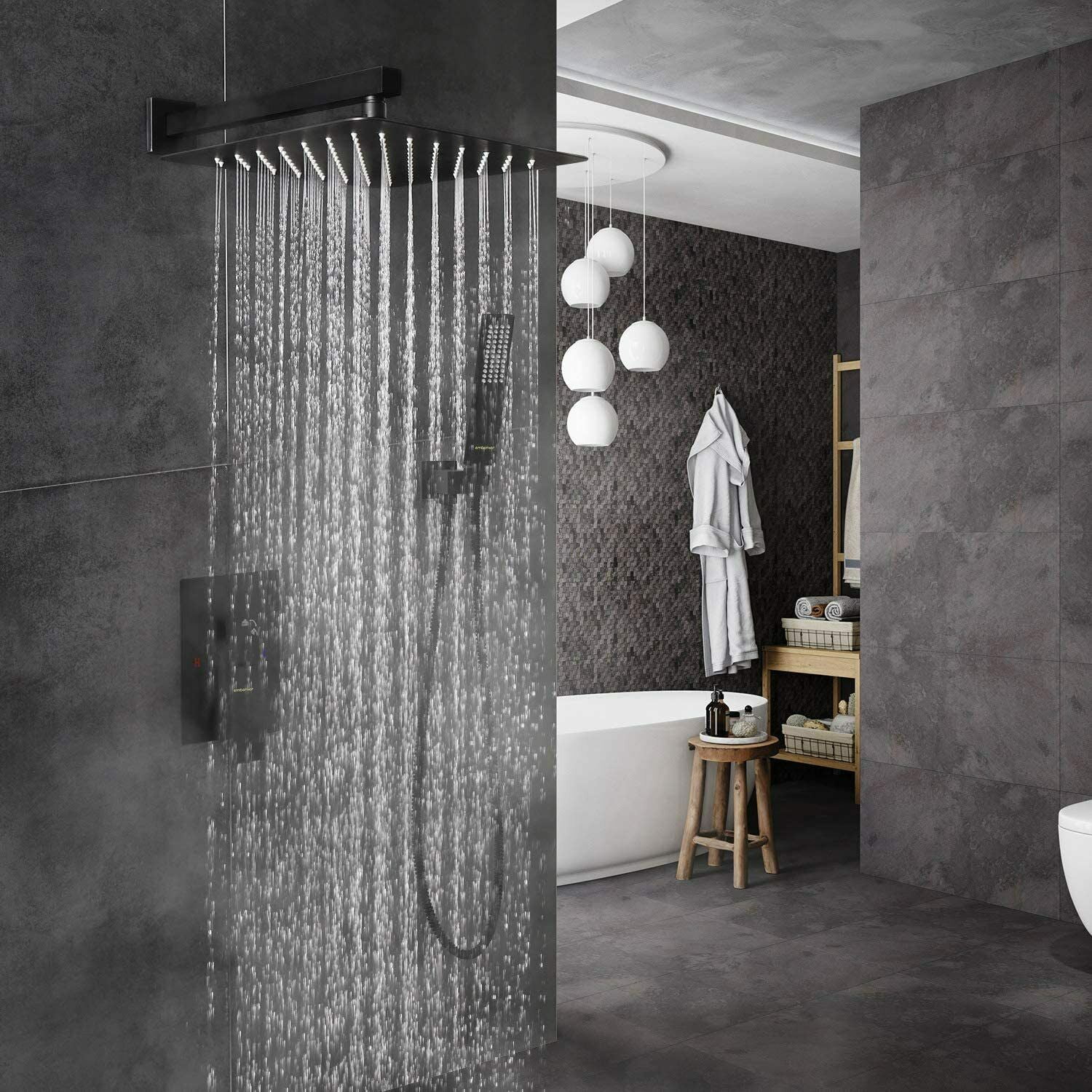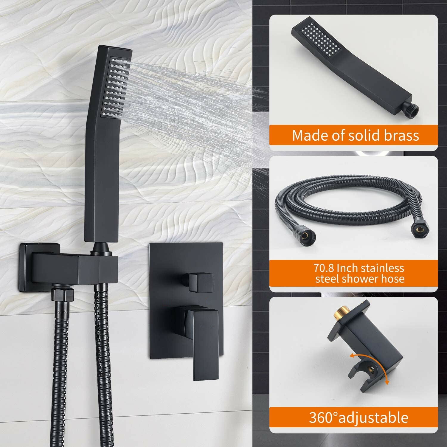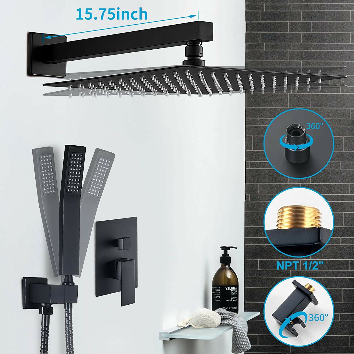 Black Shower Faucet Set Rainfall Shower Head Black Shower Faucet System Set 2-Function Style: Modern/Contempoary Shower head diameter:8″ 10″ 12″ 16″ Shower arm length:14.5″ Shower Head: Rainfall Body Material: Brass Showerhead Material: Stainless Steel Hand Shower Material: Abs plastic Tub Spout Material: Brass Number of Handles: Single Handle Finish:Matte Black Valve Type: Ceramic Valve Faucet Body Material: Brass Water Flow:1.8 GPM The valve with the rough part inside the wall Thread sizeï¼1/2 NPT 2-ways Function,Contain:Rainfall,Hand shower Only one function can be used at a time