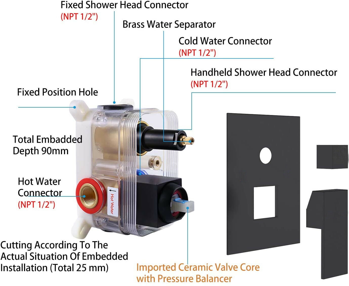Matte Black Appearance – With the Matte Black appearance of European and American style,ensuring corrosion resistance and durable;it can easily face the surface corrosion by humid environment in the shower room. High Quality – Faucet body is made from sturdy brass, ensuring high quality and longevity,Includes: 8 inch Square rain shower head 304 stainless steel, handheld shower head Brass,shower arm Brass,shower hose,PVC shower holder Brass, water control valve Brass.2-function in 1 switch,easy to operation. Pressure balance valve – it’s cartridge monitor water pressure balance, maintaining consistent water temperature,helping to protect you from being scalded by sudden changes in hot or cold water pressure Air pressure technology: Inject the air into rain Shower head to mix water with air, and the water pressure up to 2.5GPM instantly, simulates the natural raining to provide you with natural contact of water experience,giving you a pleasant Shower,easy to clean and maintain