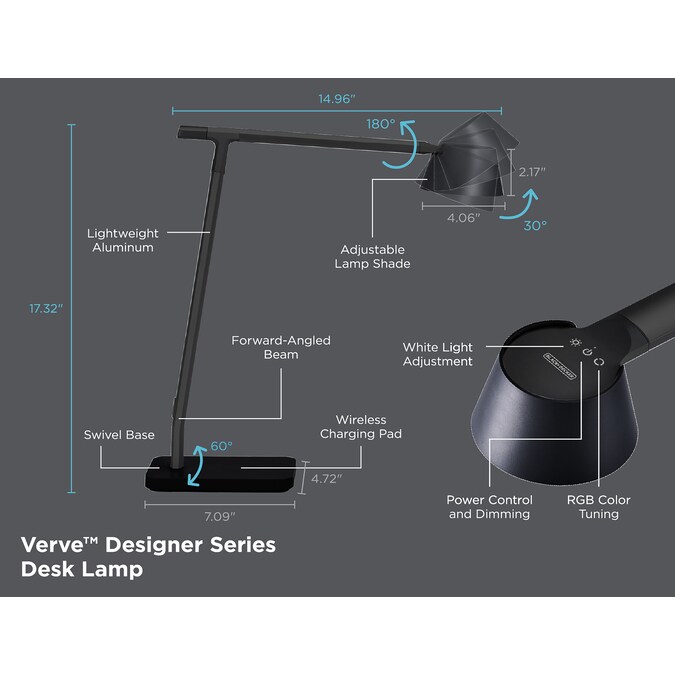 Durable, sleek, and carefully crafted with anodized aluminum beams for premium strength and durability, our Verve™ Designer series offers a range of models and options for work, play, and relaxation. Brilliant design meets convenient control with our BLACK+DECKER Designer Desk Lamp with Wireless Charging that seamlessly brings light to your workspace with three touch-capacitive buttons that allow easy dimming and color adjustment. Boasting a modern design and a variety of base options, this lamp is ideal for tables, desks, nightstands, and other areas in the home or office. With three points of adjustability on the lamp, its design has been crafted for ultimate customization, no matter where you need light. This lamp also acts as a fast and convenient power station for your phone, tablet and any other devices that need a bit of charging with a base that features a Qi wireless charging pad. And you can easily set the scene for any occasion with true white lighting or unwind to a spectrum of 16 million colors.