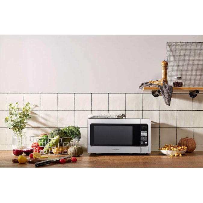 This Black+Decker microwave has 2.2 cubic feet of space and 1,200 watts of cooking strength. The stainless steel exterior and perfect size makes this the ideal unit for smaller kitchens, dorms, or office break rooms. It offers 10 different levels of power and features a bright green digital display with LED interior lighting. One-touch buttons help to make the food preparation quick and easy. There are multiple pre-programmed settings including: defrost, express cook, mute mode, and more! If you’re looking for an elegant and efficient all-in-one microwave, look no further.