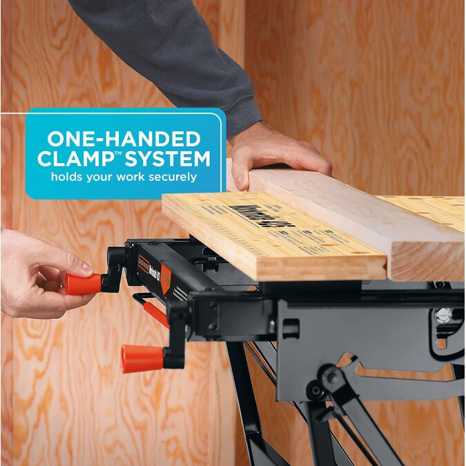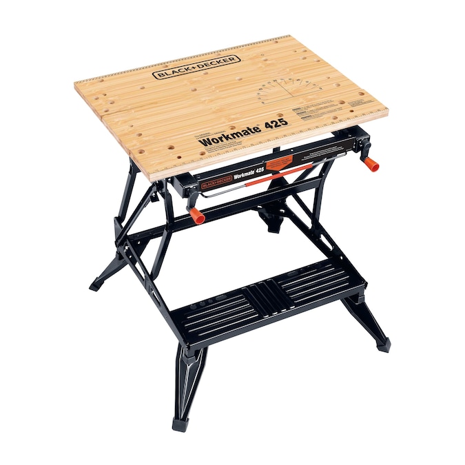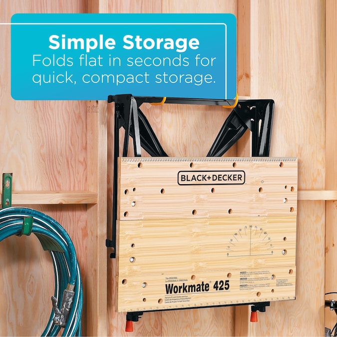 The most versatile workbench on the market, the Workmate™ 425 comes with an advanced one-handed clamp system with exclusive clutch design for easy clamping, and a front jaw that swings up for vertical clamping. It folds for easy storage, and has a strong steel construction and holds up to 550-Pound. Its dual height allows for use as a workbench, bench tool stand, vise, or sawhorse. Included Components: WM425 Project Center, (4) Swivel Pegs