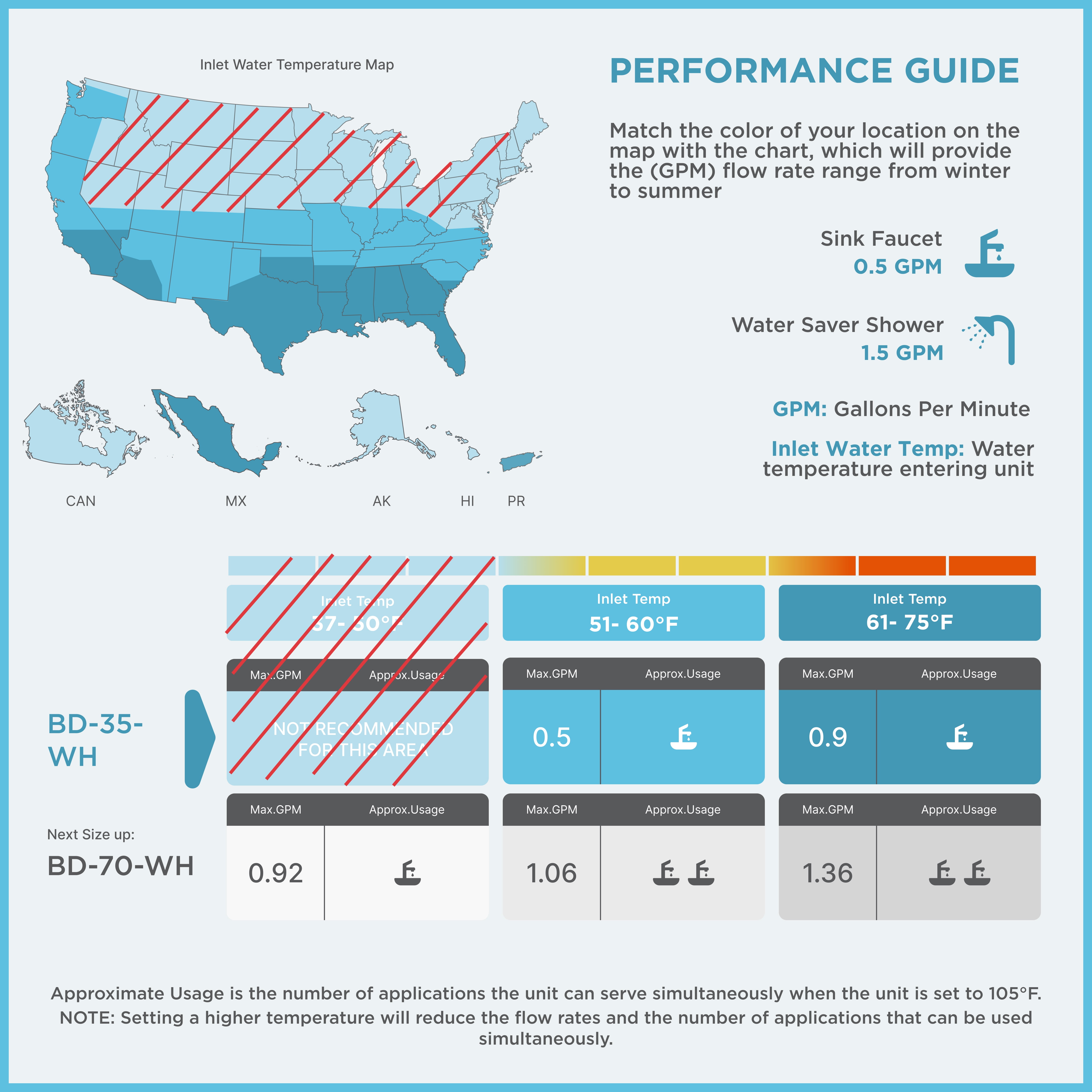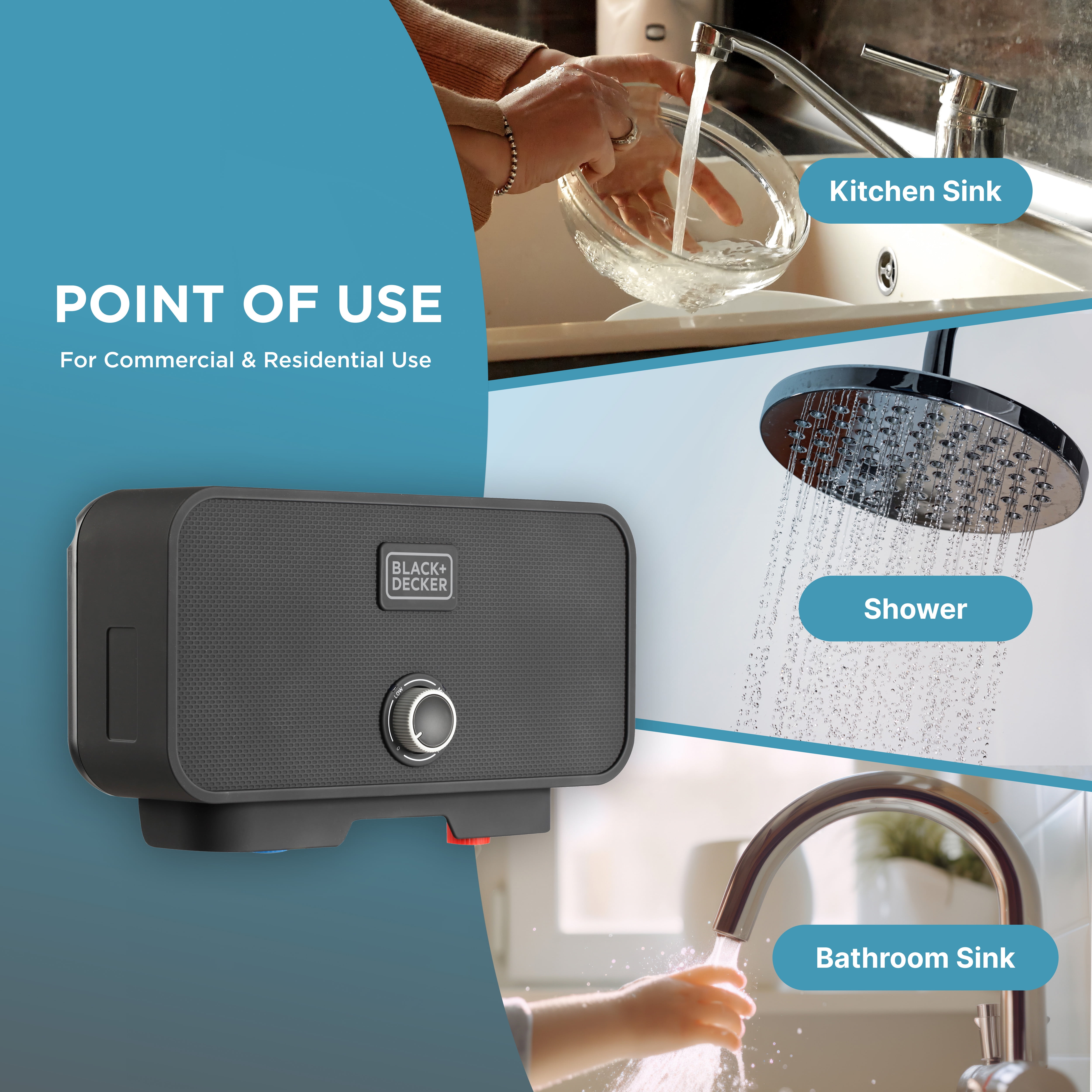Black+Decker point-of-use tankless electric water heaters provide you with endless hot water only when you need it, without the wait or worry of ever running out. Unlike conventional tank water heaters, which constantly consume energy to keep your water hot 24/7, this eco-friendly, efficient and convenient solution will instantly reduce your energy consumption, eliminate costly water waste and save you money on energy costs simply by heating water on demand. The unit does NOT require any gas lines or venting, and the compact design allows you flexibility to install virtually anywhere – in a cabinet, closet, garage, basement, etc. You can be sure to earn some precious space by installing this unit! Black+Decker Electric Tankless Water Heaters also offer a great value with the assurance the category’s strongest warranty – 7 years leakage free, 5 years on the heat exchanger, and 2 years parts only. (IMPORTANT: inlet temps vary by location and seasonality. Selecting the right water heater depends on your incoming water temperature, flow rate, and desired output temperature. – See Performance Guide or Manual before purchasing.) Should you have any questions and need further assistance, give of our technical support agents a call at 1-844-746-6688, Monday – Friday, 9AM-5:30PM EST.