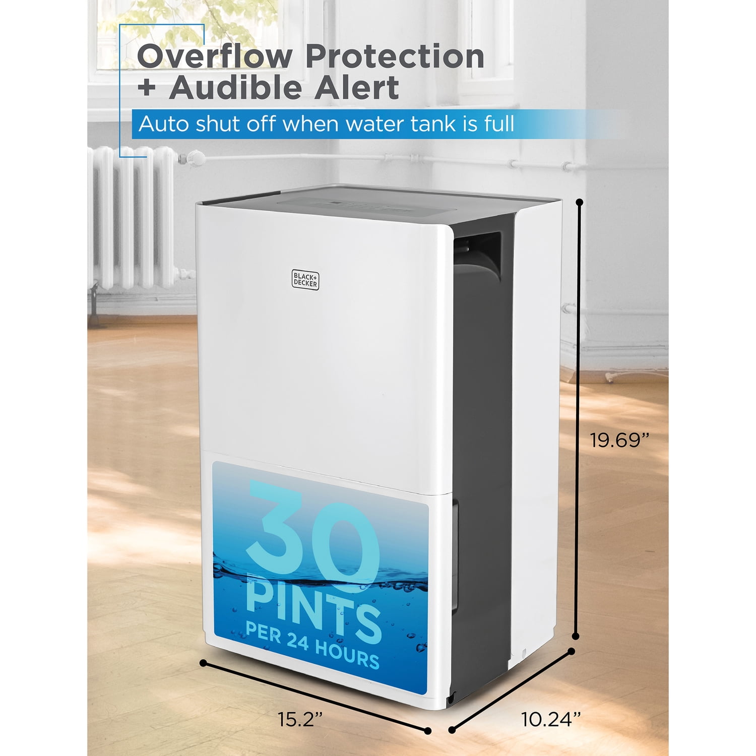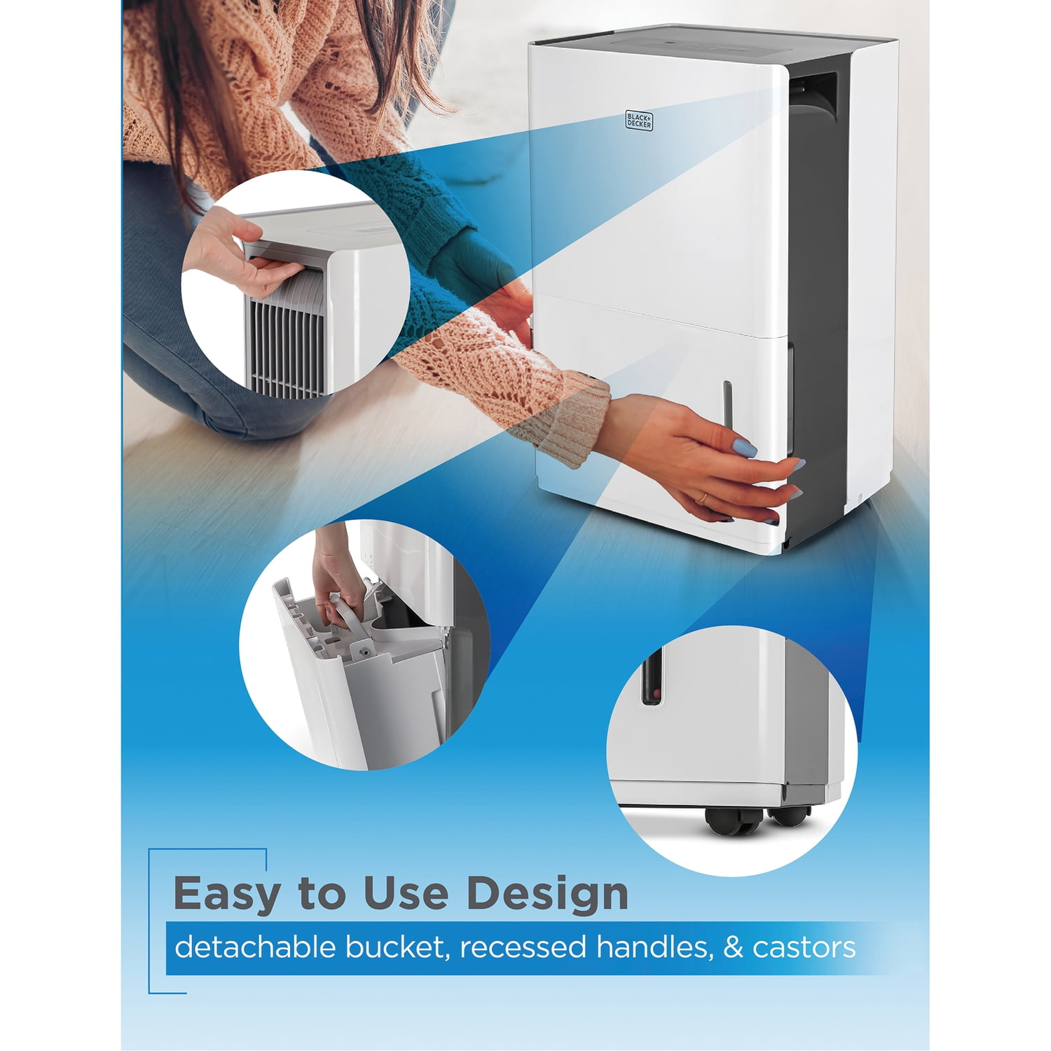 Portable and powerful, this BLACK+DECKER 310-Watt Dehumidifier is fro rooms up to 3,000 sq. ft. It capable of extracting up to 30 pints of water per 24 hours to keep your air dry and clean and to reduce moisture, mold, and mildew in your basement, garage, closet, RV, bathroom, or other rooms in the home. The collection bucket can hold up to 6.34 pints and features a bucket full indicator light and auto shutoff, plus a 24-hour timer. Or, use your own garden hose at home for continuous drainage. Caster wheels and recessed handles make it portable and easy to move from room to room!