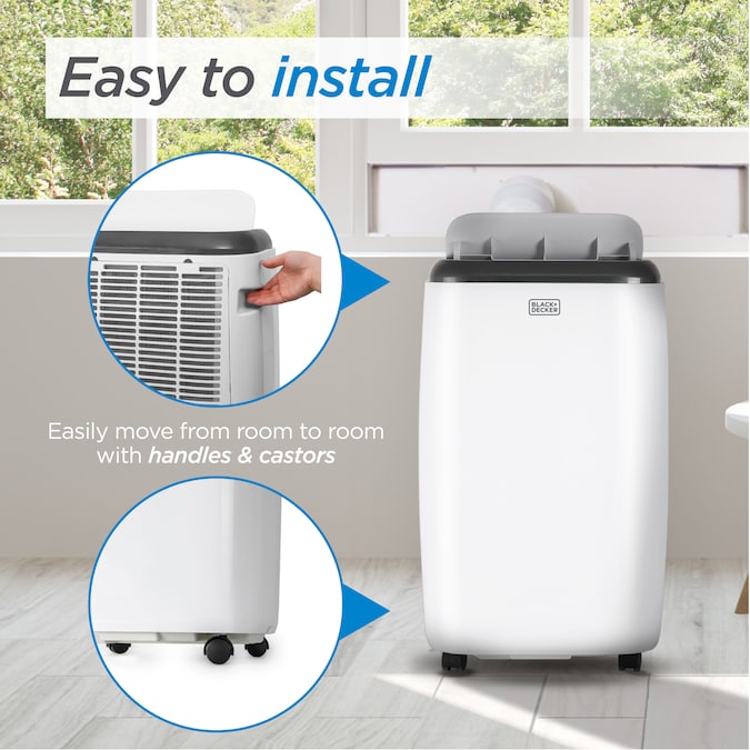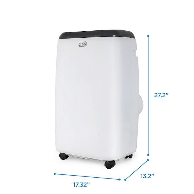 Enjoy quick and easy, comfortable home cooling during hot, summer days with our versatile BLACK+DECKER portable room air conditioners. Black and Decker portable AC cools, dehumidifies, and circulates air to fight off the summer heat. Stand up air conditioner keeps a room, bedroom, apartment, dorm or garage comfy during the summer months when the heat sets in. Works in double hung or sliding windows only, no crank windows. Our portable air conditioners for rooms feature an easy-to-use electronic control panel and full function remote control for easy operation. Air conditioner portable comes with swivel castors and side carrying handles for easy mobility and everything needed for an effortless installation. Our indoor air conditioner features 3 cooling and 3 fan speeds along with auto air swing louvers (up+down) to help optimize cooling levels when it’s needed. Auto water evaporation feature helps remove water through the exhaust hose to reduce amount of water needed to be drained into the water bucket or drain hose. Air conditioner for bedroom also features a 24-hour timer to automatically start/stop the unit when you need it. Removable washable filter for easy cleaning. R-32 refrigerant. Portable air conditioners with window kit allow easy installation with the included exhaust hose and window slider panels. Indoor AC unit measures 17.32″ x 13.2″ x 27.2″ and weighs 51.1 lbs. ETL listed. 1 year warranty.