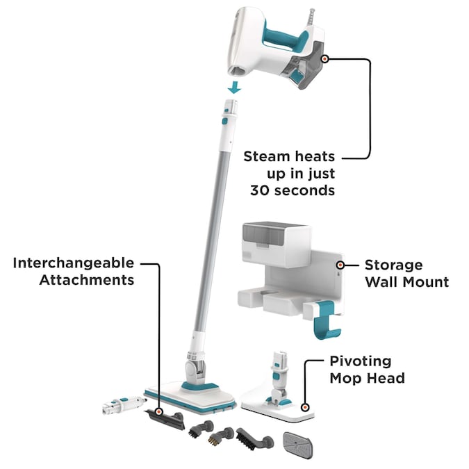Get an all-around clean with the BLACK+DECKER® Multipurpose Steam Cleaning System with 7 Attachments + Storage Wall Mount. This steam cleaner kills up to 99.9% of germs* and removes dirt and grime. It works on surfaces from sealed hardwood and vinyl floors to sealed ceramic tile. Its ultra-versatile design converts it from a steam mop to a handheld steamer for top-to-bottom cleaning. Use various accessories for specific steam cleaning needs. The pivoting small handheld mop puts the power of steam cleaning in your hands, so you can easily clean sealed countertops + bathroom walls. Refresh clothing and upholstery with the garment steamer attachment, and store your steam mop and accessories on the low-profile wall mount.